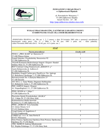 POWIATOWY URZĄD PRACY w Ząbkowicach Śląskich ul. Powstańców Warszawy 7 57-200 Ząbkowice Śląskie Tel.(0-74) 816 – 67 – 00 http://pup.zabkowice.slaskie.sisco.info WYKAZ PRACODAWCÓW, Z KTÓRYMI ZAWARTO UMOWY O ODBYWANIE STAŻU DLA OSÓB BEZROBOTNYCH (PODSTAWA PRAWNA: art. 59b ust. 1, 2, 3 ustawy z dnia 20 kwietnia 2005 roku o promocji zatrudnienia i instytucjach rynku pracy <Dz. U. z 2004 r., Nr 99, poz. 1001 z późn. zm. - tekst jednolity z dnia 9 kwietnia 2008 roku (Dz.U. Nr 69, poz. 415 z późn. zm. ) STAŻ Nazwa pracodawcy P.P.H.U. „PRO- KAM” ul. Stawowa 21 57-240 Piława Górna Zespół Szkolno- Przedszkolny Stoszowice 92 57-200 Ząbkowice Śl. Przerób Kamienia Budowlanego Import- Eksport- Handel Szklary Huta 23, 57-200 Ząbkowice Śl. BUF Centrum Usług Finansowych „KREDYT- y” Aneta Bolanowska ul. Jodłowa 6 57-200 Ząbkowice Śl. Parafialny Zespół Caritas przy Parafii p.w. Św. Jadwigi Ul. Bolesława Chrobrego 7, 57-200 Ząbkowice Śl. Stowarzyszenie Św. Celestyna Mikoszów 27 57-100 Strzelin AN- DA s. c. Anna Wadas, Dagmara Stellmacher Ul. Bohaterów Getta 1, 57-200 Ząbkowice Śl. PHU AMPEX Import- Eksport Al. Niepodległości 3/1, 57-200 Ząbkowice Śl. Liczba osób 1 1 1 2 1 1 1 1 PPHU SENDI ul. 1 Maja 7 57-200 Ząbkowice Śl. 2 Placówka Opieki Przedszkolnej „BAJKA” Ul. 3 Maja 29, 57-250 Złoty Stok Kamieniarstwo Rafał Jarowski Koźmice 8, 57-200 Ząbkowice Śl. PPHU „DORO II” Ewa Szmołda Ul. Górne Miasto 3c/4 57-215 Srebrna Góra Urząd Gminy ul. Kąpielowa 3 57-211 Ciepłowody CORPO sp. z o.o. ul. Jana Pawła II 05-077 Warszawa Dom Pomocy Społecznej Opolnica Dom Pomocy Społecznej Opolnica 58, 57-256 Bardo PHU JĘDRUŚ Andrzej Młodzieniak Ul. Wojska Polskiego 17, 57-250 Złoty Stok 1 1 2 3 3 1 2 Zakład Fryzjerski Zbrożek Krystyna Ul. Krucza 6 53-109 Wrocław TORSYSTEM BUTZBACH SERVICE Ul. Kolejowa 44, 57-230 Kamieniec Ząbk. Firma Ogólnobudowlana DAR- MAR Dariusz Jakubowski Ul. Daszyńskiego 34/4, 57-200 Ząbkowice Śl. PIZZA D’ORO Wioletta Frąszczak Ul. Przesmyk 9, 58-200 Dzierżoniów FH „HADWAO” Ul. Zamkowa 1, 57-220 Ziębice Przerób Kamienia Budowlanego Paweł Lewicki, Ryszard Lewicki Ul. Zielona 9, 58-240 Piława Górna „AUTO- HAVRAN” Jakub Hawliczek Ul. Kłodzka 8, 57-200 Ząbkowice Śl. Zakład Wodociągów i Kanalizacji Pl. Mickiewicza 2, 57-211 Ciepłowody AUTO- MAKRO SERVICE SKLEP Ul. Wolności 141a, 58-260 Bielawa Gimnazjum Publiczne im. Adama Mickiewicza Ul. Zamkowa 3, 57-230 Kamieniec Ząbk. Kamieniarstwo Betoniarstwo Przerób Kamienia Budowlanego Ul. Spokojna 14, 57-200 Ząbkowice Śl. Pośrednictwo Ubezpieczeniowe Zofia Szczepaniak Ul. Ziębicka 39/7, 57-200 Ząbkowice Śl. F.H.P.U. „MAR” Andrzej Matura Ul. Główna 19, 57-256 Bardo Zespół Szkolno- Przedszkolny Stolec 101 57-200 Ząbkowice Śl. F.H.U. Piotr Orzech Ul. Kościuszki 8, 57-200 Ząbkowice Śl. Przedsiębiorstwo Wielobranżowe „ELEKTROMAT” Sp. z o.o. Mąkolno 149, 57-200 Ząbkowice Śl. Bank Polskiej Spółdzielczości S.A. Oddział w Ząbkowicach Śl. Rynek 4, 57-200 Ząbkowice Śl. MARK- BUD s. c. Mateusz Reguła, Marek Reguła Ul. Armii Krajowej 19, 48-370 Paczków RABEX Elżbieta Woźniak Ul. Ząbkowicka 7, 57-230 Kamieniec Ząbk. Restauracja Pierzeja s. c. Stanisława Tajchman, Stanisława Stanny Rynek 14, 57-200 Ząbkowice Śl. PHU KOPERNIK Teresa Kuduk Ul. Zamkowa 18, 57-220 Ziębice Urząd Miejski Ul. 1 Maja 15, 57-200 Ząbkowice Śl. CACKA Handel Detaliczny i Hurtowy Ul. Listopada 20, 48-303 Nysa Przedszkole Publiczne Szklary 20, 57-200 Ząbkowice Śl. Krzysztof Pomykała PUH FAJRO- TECH Ul. Legnicka 10B, 57-200 Ząbkowice Śl. Czesław Napora FUH M.C.M. 1 1 1 1 1 1 1 2 1 1 1 1 1 1 1 1 1 1 1 1 1 1 1 1 1 1 Ul. Cukrownicza 8, 57-200 Ząbkowice Śl. PPU „KOMA” Sp. z o.o. Ul. Wiejska 2, 57-250 Złoty Stok Urząd Miejski Ul. 1 Maja 15, 57-200 Ząbkowice Śl. Usługi Transportowe „TRANSP” Ul. Jugosłowiańska 107/6, 51-112 Wrocław Ośrodek Sportu i Rekreacji Ul. Kusocińskiego 17 57-200 Ząbkowice Śl. Zespół Przedszkolno- Szkolny Stolec 101, 57-200 Ząbkowice Śl. P.H.U. FINANCE Anna Furgała Ul. Prusa 8, 57-200 Ząbkowice Śl. ARNO KOMPUTER P. FINOGENOW S.J. Ul. Świdnicka 38 bud. 23 58-200 Dzierżoniów PHU WIKAP Marta Noszczak Ul. Ząbkowicka 1, 57-230 Kamieniec Ząbk. Agencja Ochrony i Mienia „MAJOR” Ul. Zamkowa 9, 57-220 Ziębice MARPOL Mariusz Skrętkowicz Ul. Armii Krajowej 52a/12, 57-200 Ząbkowice Śl. MARPOL Mariusz Skrętkowicz Ul. Armii Krajowej 52a/12, 57-200 Ząbkowice Śl. Prokuratura Rejonowa Al. Niepodległości 2, 57-200 Ząbkowice Śl. Przedsiębiorstwo Handlowe Ul. Wojska Polskiego 5 57-250 Złoty Stok Firma Usługowo- Handlowe Renata Drebot Ul. Reymonta 6, 57-200 Ząbkowice Śl. Ząbkowice 30.06.2009r 1 1 1 1 1 1 1 1 2 1 1 1 1 1