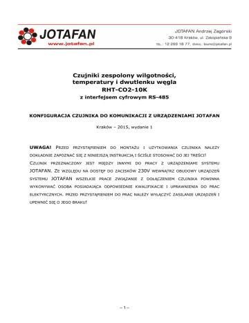 Czujniki zespolony wilgotności, temperatury i dwutlenku węgla RHT-CO2-10K z interfejsem cyfrowym RS-485 KONFIGURACJA CZUJNIKA DO KOMUNIKACJI Z URZĄDZENIAMI JOTAFAN Kraków – 2015, wydanie 1 UWAGA! PRZED PRZYSTĄPIENIEM DO MONTAŻU I UŻYTKOWANIA CZUJNIKA NALEŻY DOKŁADNIE ZAPOZNAĆ SIĘ Z NINIEJSZĄ INSTRUKCJĄ I ŚCIŚLE STOSOWAĆ DO JEJ TREŚCI! CZUJNIK PRZEZNACZONY JEST MIĘDZY INNYMI DO PRACY Z URZĄDZENIAMI SYSTEMU JOTAFAN. ZE WZGLĘDU NA DOSTĘP DO ZACISKÓW 230V WEWNĄTRZ OBUDOWY URZĄDZEŃ SYSTEMU JOTAFAN WSZELKIE PRACE ZWIĄZANIE Z DOŁĄCZENIEM CZUJNIKA POWINNA WYKONYWAĆ OSOBA POSIADAJĄCA ODPOWIEDNIE KWALIFIKACJE I UPRAWNIENIA DO PRAC ELEKTYRCZNYCH. PRZED PRZYSTĄPIENIEM DO PRAC NALEŻY WYŁĄCZYĆ ZASILANIE URZĄDZEŃ I UPEWNIĆ SIĘ O JEGO BRAKU! –1– 1. Konfiguracja czujnika do komunikacji z urządzeniami JOTAFAN Aby czujnik mógł poprawnie współpracować z urządzeniami JOTAFAN należy ustawić mikroprzełączniki (grupa 8 mikroprzełączników przy znaku CE) wewnątrz obudowy. W tym celu należy odkręcić wieko obudowy czujnika, dokonać zmiany i ponownie zakręcić dbając o równomierne rozłożenie siły docisku oraz poprawne położenie uszczelki gumowej. Zaleca się określenie przy zamawianiu czujnika jego zastosowania w celu dokonania konfiguracji przez producenta. • Regulator TERMISTAT-6-4S-485-LCD+: 2,6,7 ON, pozostałe OFF Czujnik RHT-CO2-10K jest traktowany przez sterownik TERMISTAT jako dwa niezależne czujniki: RHT-01 i CO2-10K. Należy więc w zależności od potrzeb odpowiednio ustawić nastawy w menu „Czujniki wilgotności” i „Czujniki CO2” w sterowniku TERMISTAT. • Regulator VIRGO: Czujnik RHT-CO2-10K jest traktowany przez sterownik VIRGO jako dwa niezależne czujniki: RHT-01 i CO2-10K. Gdy chcemy wykorzystać oba czujniki to należy je załączyć w sterowniku VIRGO (nastawa Zainstal. czuj. z menu „Czujniki”) jako czujniki o numerach różniących się o dwa (np. 1 i 3, 2 i 4) oraz dla czujnika o mniejszym numerze trzeba ustawić nastawę Typ czujnika = „RHT-01” a dla czujnika o większym numerze: Typ czujnika = „CO2-10K”. Numer mikroprzełącznika 1, 2, 3, 4 5, 6, 7, 8 Położenie OFF, ON, OFF, ON, OFF, ON, OFF, ON, OFF, ON, OFF, ON, OFF, ON, OFF, ON, OFF, OFF, OFF, ON, ON, OFF, OFF, ON, ON, OFF, OFF, ON, ON, OFF, OFF, ON, ON, ON, OFF, OFF, OFF, OFF, ON, ON, ON, ON, OFF, OFF, OFF, OFF, ON, ON, ON, ON, ON, Opis OFF OFF OFF OFF OFF OFF OFF OFF ON ON ON ON ON ON ON ON OFF –2– położenie zabronione położenie zabronione czujnik: CO2-10K nr 3, RHT-01 nr 1 czujnik: CO2-10K nr 4, RHT-01 nr 2 czujnik: CO2-10K nr 5, RHT-01 nr 3 czujnik: CO2-10K nr 6, RHT-01 nr 4 czujnik: CO2-10K nr 7, RHT-01 nr 5 czujnik: CO2-10K nr 8, RHT-01 nr 6 czujnik: CO2-10K nr 9, RHT-01 nr 7 czujnik: CO2-10K nr 10, RHT-01 nr 8 czujnik: CO2-10K nr 11, RHT-01 nr 9 czujnik: CO2-10K nr 12, RHT-01 nr 10 czujnik: CO2-10K nr 13, RHT-01 nr 11 czujnik: CO2-10K nr 14, RHT-01 nr 12 czujnik: CO2-10K nr 15, RHT-01 nr 13 czujnik: CO2-10K nr 16, RHT-01 nr 14 Położenie wymagane OZNAKOWANIE WEEE Zużytego sprzętu elektrycznego i elektronicznego nie wolno wyrzucać razem ze zwykłymi odpadami. Według dyrektywy WEEE (Dyrektywy 2002/96/EC) obowiązującej w UE dla używanego sprzętu elektrycznego i elektronicznego należy stosować oddzielne sposoby utylizacji. W Polsce zgodnie z przepisami ustawy z dnia 1 lipca 2005r. o zużytym sprzęcie elektrycznym i elektronicznym zabronione jest umieszczanie łącznie z innymi odpadami sprzętu oznakowanego symbolem przekreślonego kosza. Użytkownik, który zamierza się pozbyć tego produktu, jest obowiązany do oddania ww. do punktu zbierania zużytego sprzętu. Punkty zbierania prowadzone są m.in. przez sprzedawców hurtowych i detalicznych tego sprzętu oraz gminne jednostki organizacyjne prowadzące działalność w zakresie odbierania odpadów. Prawidłowa realizacja tych obowiązków ma znaczenie zwłaszcza w przypadku, gdy w zużytym sprzęcie znajdują się składniki niebezpieczne, które mają negatywny wpływ na środowisko i zdrowie ludzi. –3–