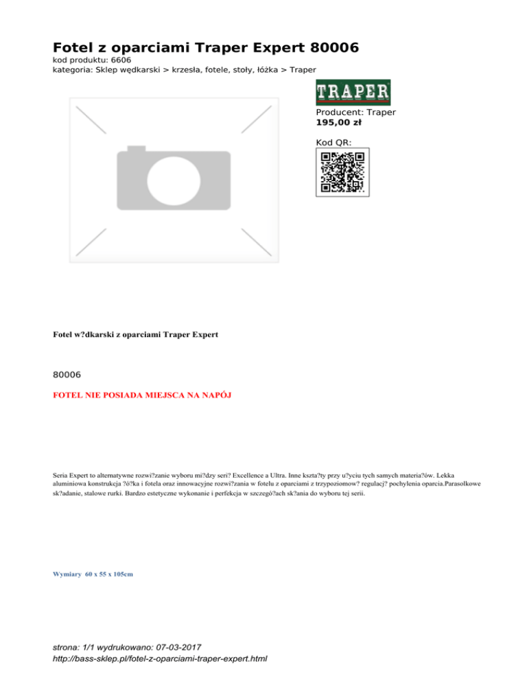 Fotel z oparciami Traper Expert 80006 kod produktu: 6606 kategoria: Sklep wędkarski > krzesła, fotele, stoły, łóżka > Traper Producent: Traper 195,00 zł Kod QR: Fotel w?dkarski z oparciami Traper Expert 80006 FOTEL NIE POSIADA MIEJSCA NA NAPÓJ Seria Expert to alternatywne rozwi?zanie wyboru mi?dzy seri? Excellence a Ultra. Inne kszta?ty przy u?yciu tych samych materia?ów. Lekka aluminiowa konstrukcja ?ó?ka i fotela oraz innowacyjne rozwi?zania w fotelu z oparciami z trzypoziomow? regulacj? pochylenia oparcia.Parasolkowe sk?adanie, stalowe rurki. Bardzo estetyczne wykonanie i perfekcja w szczegó?ach sk?ania do wyboru tej serii. Wymiary 60 x 55 x 105cm strona: 1/1 wydrukowano: 07-03-2017 http://bass-sklep.pl/fotel-z-oparciami-traper-expert.html