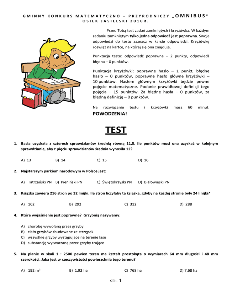 GMINNY KONKURS MATEMATYCZNO – PRZYRODNICZY „OMNIBUS” OSIEK JASIELSKI 2010R. Przed Tobą test zadań zamkniętych i krzyżówka. W każdym zadaniu zamkniętym tylko jedna odpowiedź jest poprawna. Swoje odpowiedzi do testu zaznacz w karcie odpowiedzi. Krzyżówkę rozwiąż na kartce, na której się ona znajduje. Punktacja testu: odpowiedź poprawna – 2 punkty, odpowiedź błędna – 0 punktów. Punktacja krzyżówki: poprawne hasło – 1 punkt, błędne hasło – 0 punktów, poprawne hasło główne krzyżówki – 10 punktów. Hasłem głównym krzyżówki będzie pewne pojęcie matematyczne. Podanie prawidłowej definicji tego pojęcia – 15 punktów. Za błędne hasła – 0 punktów, za błędną definicję – 0 punktów. Na rozwiązanie testu i krzyżówki masz 60 minut. POWODZENIA! TEST 1. Basia uzyskała z czterech sprawdzianów średnią równą 11,5. Ile punktów musi ona uzyskać w kolejnym sprawdzianie, aby z pięciu sprawdzianów średnia wynosiła 12? A) 13 B) 14 C) 15 D) 16 2. Najstarszym parkiem narodowym w Polsce jest: A) Tatrzański PN B) Pieniński PN C) Świętokrzyski PN D) Białowieski PN 3. Książka zawiera 216 stron po 32 linijki. Ile stron liczyłaby ta książka, gdyby na każdej stronie były 24 linijki? A) 162 B) 292 C) 312 D) 288 4. Które wyjaśnienie jest poprawne? Grzybnią nazywamy: A) B) C) D) chorobę wywołaną przez grzyby ciało grzybów zbudowane ze strzępek wszystkie grzyby występujące na terenie lasu substancję wytwarzaną przez grzyby trujące 5. Na planie w skali 1 : 2500 pewien teren ma kształt prostokąta o wymiarach 64 mm długości i 48 mm szerokości. Jaka jest w rzeczywistości powierzchnia tego terenu? A) 192 m² B) 1,92 ha C) 768 ha str. 1 D) 7,68 ha GMINNY KONKURS MATEMATYCZNO – PRZYRODNICZY „OMNIBUS” OSIEK JASIELSKI 2010R. 6. Opadłe liście, suche gałęzie i martwe zwierzęta przemieniane są w próchnicę przez: A) bakterie i grzyby B) grzyby i krety C) bakterie i mrówki D) dżdżownice i mrówki 7. Ile autobusów 55 – miejscowych potrzeba dla przewiezienia 315 osób? A) 6 B) 5 C) 3 D) 4 8. W którym przykładzie prawidłowo zestawiono piętra roślinności od najwyższego do najniższego? A) podszyt, korony drzew, ściółka, runo leśne B) korony drzew, runo leśne, podszyt, ściółka C) korony drzew, podszyt, runo leśne, ściółka D) ściółka, podszyt, korony drzew, runo leśne 9. Piotruś ma dwa razy więcej braci niż sióstr, zaś jego siostra Ania pięć razy więcej braci niż sióstr. Ilu chłopców i ile dziewcząt jest w tej rodzinie? A) B) C) D) 4 chłopców, 2 dziewczyny 2 chłopców, 5 dziewczyn 5 chłopców, 2 dziewczyny 2 chłopców, 4 dziewczyny 10. Biała plama na zadzie sarny nazywa się: A) grzebykiem B) lusterkiem C) zajączkiem D) szablą 11. Która z poniższych równości będzie prawdziwa niezależnie od tego, jaką liczbę wpiszemy w miejsce kwadracika? A) 3 · 1 4 B) 2 C) 2 · 3 0 0· 1 6 D) 1 2 1 12. Który punkt zawiera zwierzęta żyjące w runie leśnym? A) żaba, zając, wilk C) ślimak, zaskroniec, żaba B) lis, ryś, jeż D) padalec, dzik, kornik 13. Ciało gąsienicy pewnego owada składa się z pięciu kulistych części, przy czym 3 z nich są żółte, a 2 zielone. Ile co najwyżej typów gąsienicy tego owada mogłoby wystąpić w przyrodzie? A) 6 B) 8 C) 9 str. 2 D) 10 GMINNY KONKURS MATEMATYCZNO – PRZYRODNICZY „OMNIBUS” OSIEK JASIELSKI 2010R. 14. Wawrzynek wilczełyko spotykany jest w runie lasu: A) łęgowego B) grądowego C) borze sosnowym D) bukowego 15. Zosia poświęca jedną godzinę czasu na odrabianie zadań domowych. Jedną trzecią tego czasu poświęca na matematykę, a dwie piąte reszty czasu na przyrodę. Ile minut poświęca na odrabianie pracy domowej z innych przedmiotów? A) 12 B) 20 C) 24 D) 36 16. Warstwa lasu, która składa się z martwych, opadłych liści, gałęzi i owoców, to: A) runo leśne B) korony drzew C) ściółka D) podszyt C) 3953 D) 4829 17. Liczba podzielna przez dziewięć, to: A) 2574 B) 7379 18. W którym przykładzie podano rośliny runa lasu łęgowego? A) B) C) D) żywiec gruczołowaty, kopytnik pospolity, wilczomlecz migdałolistny zawilec gajowy, konwalia majowa, lilia złotogłów knieć błotna, niezapominajka błotna, kosaciec żółty wrzos pospolity, borówka brusznica, kurki 19. Zdaniem prawdziwym jest: A) Każdy trapez jest prostokątem. B) Każdy równoległobok jest rombem. C) Każdy romb jest kwadratem. D) Każdy kwadrat jest trapezem. 20. Które drzewo iglaste gubi igły na zimę? A) sosna B) modrzew C) jodła A teraz pora na uśmiech. str. 3 D) świerk GMINNY KONKURS MATEMATYCZNO – PRZYRODNICZY „OMNIBUS” OSIEK JASIELSKI 2010R. BRUDNOPIS str. 4 GMINNY KONKURS MATEMATYCZNO – PRZYRODNICZY „OMNIBUS” OSIEK JASIELSKI 2010R. ............................................................................... IMIĘ I NAZWISKO UCZESTNIKA KONKURSU KRZYŻÓWKA MATEMATYCZNO - PRZYRODNICZA 1. 2. 3. 4. 5. 6. 7. 8. 9. 10. 11. 12. 13. 1. wynik dzielenia 2. poniższy schemat przedstawia: tlen dwutlenek węgla 3. 4. 5. 6. 7. 8. wielokąt, który ma cztery boki i cztery kąty jedna z podstawowych cech organizmów roślinnych równoległobok, który ma wszystkie boki równe produkują tlen w przyrodzie prostopadłościan, którego wszystkie ściany i podstawy są przystającymi kwadratami brakujący wyraz w opisie rysunku ………………….. potęgi potęga 9. 10. 11. 12. 13. 2³ organizm jednokomórkowy iloczyn, to wynik ………………………… najmniejsza część istoty żywej organizmy odżywiające się gotowym pokarmem pobieranie pokarmu przez organizmy podstawa potęgi Hasło główne krzyżówki: ................................................................................................................................................... Definicja, określająca pojęcie będące hasłem głównym krzyżówki: ..............................................................................