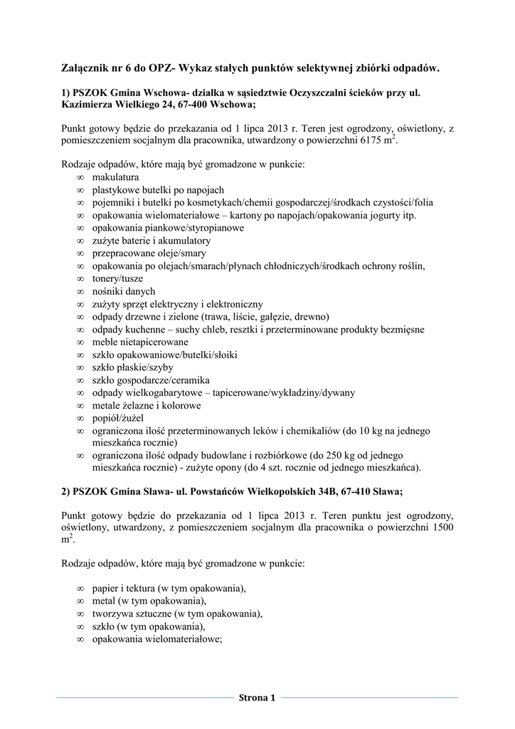 Załącznik nr 6 do OPZ- Wykaz stałych punktów selektywnej zbiórki odpadów. 1) PSZOK Gmina Wschowa- działka w sąsiedztwie Oczyszczalni ścieków przy ul. Kazimierza Wielkiego 24, 67-400 Wschowa; Punkt gotowy będzie do przekazania od 1 lipca 2013 r. Teren jest ogrodzony, oświetlony, z pomieszczeniem socjalnym dla pracownika, utwardzony o powierzchni 6175 m2. Rodzaje odpadów, które mają być gromadzone w punkcie: • makulatura • plastykowe butelki po napojach • pojemniki i butelki po kosmetykach/chemii gospodarczej/środkach czystości/folia • opakowania wielomateriałowe – kartony po napojach/opakowania jogurty itp. • opakowania piankowe/styropianowe • zużyte baterie i akumulatory • przepracowane oleje/smary • opakowania po olejach/smarach/płynach chłodniczych/środkach ochrony roślin, • tonery/tusze • nośniki danych • zużyty sprzęt elektryczny i elektroniczny • odpady drzewne i zielone (trawa, liście, gałęzie, drewno) • odpady kuchenne – suchy chleb, resztki i przeterminowane produkty bezmięsne • meble nietapicerowane • szkło opakowaniowe/butelki/słoiki • szkło płaskie/szyby • szkło gospodarcze/ceramika • odpady wielkogabarytowe – tapicerowane/wykładziny/dywany • metale żelazne i kolorowe • popiół/żużel • ograniczona ilość przeterminowanych leków i chemikaliów (do 10 kg na jednego mieszkańca rocznie) • ograniczona ilość odpady budowlane i rozbiórkowe (do 250 kg od jednego mieszkańca rocznie) - zużyte opony (do 4 szt. rocznie od jednego mieszkańca). 2) PSZOK Gmina Sława- ul. Powstańców Wielkopolskich 34B, 67-410 Sława; Punkt gotowy będzie do przekazania od 1 lipca 2013 r. Teren punktu jest ogrodzony, oświetlony, utwardzony, z pomieszczeniem socjalnym dla pracownika o powierzchni 1500 m2 . Rodzaje odpadów, które mają być gromadzone w punkcie: • • • • • papier i tektura (w tym opakowania), metal (w tym opakowania), tworzywa sztuczne (w tym opakowania), szkło (w tym opakowania), opakowania wielomateriałowe; Strona 1 • • • • • • • • • • • odpady komunalne ulegające biodegradacji, w tym odpady opakowaniowe ulegające biodegradacji; zużyty sprzęt elektryczny i elektroniczny pochodzący z gospodarstw domowych, zużyte baterie i akumulatory, meble i inne odpady wielkogabarytowe, odpady zielone (trawa, liście), odpady drzewne (gałęzie, drewno), świetlówki, żarówki, lampy, farby/chemikalia (farby, lakiery, środki ochrony roślin), ograniczona ilość przeterminowanych leków i chemikaliów (do 10 kg na jednego mieszkańca rocznie), ograniczona ilość odpady budowlane i rozbiórkowe (do 250 kg od jednego mieszkańca rocznie), zużyte opony (do 4 szt. rocznie od jednego mieszkańca). 3) PSZOK Gmina Kargowa- teren infrastruktury dawnego Składowiska Odpadów w Kargowej, ul. Zamieście, 66-120 Kargowa; Punkt gotowy będzie do przekazania od 1 lipca 2013 r. Teren punktu jest w części utwardzony, ogrodzony, oświetlony, z pomieszczeniem socjalnym dla pracownika o powierzchni 12 400 m2. Rodzaje odpadów, które mają być gromadzone w punkcie: • • • • • • • • • • papier i tektura (w tym opakowania), metal (w tym opakowania), szkło (w tym opakowania), odpady komunalne ulegające biodegradacji, w tym odpady opakowaniowe ulegające biodegradacji oraz odpady zielone (trawa, liście), zużyty sprzęt elektryczny i elektroniczny pochodzący z gospodarstw domowych + zużyte baterie i akumulatory, meble i inne odpady wielkogabarytowe, odpady drzewne (gałęzie, drewno), ograniczona ilość przeterminowanych leków i chemikaliów (do 10 kg na jednego mieszkańca rocznie), ograniczona ilość odpady budowlane i rozbiórkowe (do 250 kg od jednego mieszkańca rocznie), zużyte opony (do 4 szt. rocznie od jednego mieszkańca). 4) PSZOK Gmina Bojadła- działka przy Oczyszczalni ścieków, 66-130 Bojadła; Punkt gotowy będzie do przekazania od 1 stycznia 2014 r. Teren będzie ogrodzony, utwardzony, oświetlony, o powierzchni 1011m2. Rodzaje odpadów, które mają być gromadzone w punkcie: • • papier i tektura (w tym opakowania), metal (w tym opakowania), Strona 2 • • • • • • • • szkło (w tym opakowania), odpady komunalne ulegające biodegradacji, w tym odpady opakowaniowe ulegające biodegradacji oraz odpady zielone (trawa, liście), zużyty sprzęt elektryczny i elektroniczny pochodzący z gospodarstw domowych + zużyte baterie i akumulatory, meble i inne odpady wielkogabarytowe, odpady drzewne (gałęzie, drewno), ograniczona ilość przeterminowanych leków i chemikaliów (do 10 kg na jednego mieszkańca rocznie), ograniczona ilość odpady budowlane i rozbiórkowe (do 250 kg od jednego mieszkańca rocznie), zużyte opony (do 4 szt. rocznie od jednego mieszkańca). 5) PSZOK Gmina Bytom Odrzański- działka przy Oczyszczalni ścieków w Bytomiu Odrzańskim, 67-115Bytom Odrzański; Punkt gotowy będzie do przekazania od 1 września 2013 r. Teren będzie utwardzony, ogrodzony, oświetlony, o powierzchni 800 m2. Rodzaje odpadów, które mają być gromadzone w punkcie: • • • • • • • • • • papier i tektura (w tym opakowania), metal (w tym opakowania), szkło (w tym opakowania), odpady komunalne ulegające biodegradacji, w tym odpady opakowaniowe ulegające biodegradacji oraz odpady zielone (trawa, liście), zużyty sprzęt elektryczny i elektroniczny pochodzący z gospodarstw domowych + zużyte baterie i akumulatory, meble i inne odpady wielkogabarytowe, odpady drzewne (gałęzie, drewno), ograniczona ilość przeterminowanych leków i chemikaliów (do 10 kg na jednego mieszkańca rocznie), ograniczona ilość odpady budowlane i rozbiórkowe (do 250 kg od jednego mieszkańca rocznie), zużyte opony (do 4 szt. rocznie od jednego mieszkańca). 6) PSZOK Gmina Kożuchów- działka przy Oczyszczalni ścieków w Kożuchowie, 67-120 Kożuchów; Punkt gotowy będzie do przekazania od 1 lipca 2013 r. Teren będzie ogro