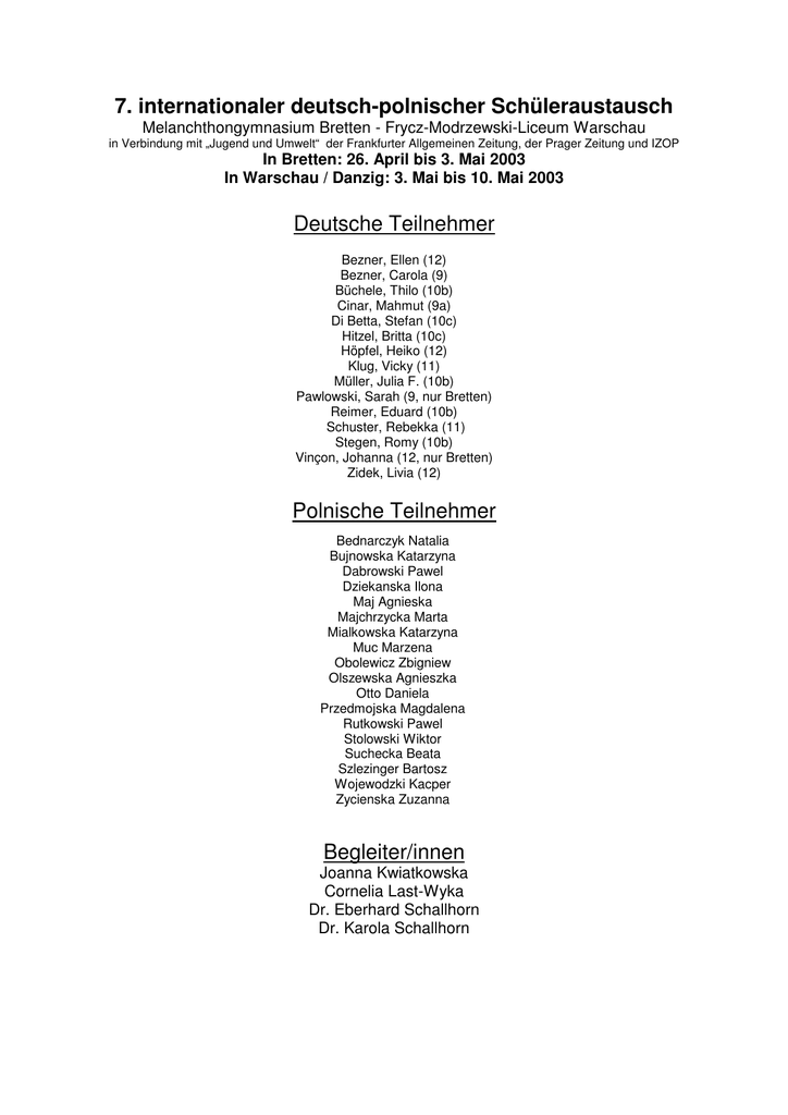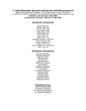 7. internationaler deutsch-polnischer Schüleraustausch Melanchthongymnasium Bretten - Frycz-Modrzewski-Liceum Warschau in Verbindung mit „Jugend und Umwelt“ der Frankfurter Allgemeinen Zeitung, der Prager Zeitung und IZOP In Bretten: 26. April bis 3. Mai 2003 In Warschau / Danzig: 3. Mai bis 10. Mai 2003 Deutsche Teilnehmer Bezner, Ellen (12) Bezner, Carola (9) Büchele, Thilo (10b) Cinar, Mahmut (9a) Di Betta, Stefan (10c) Hitzel, Britta (10c) Höpfel, Heiko (12) Klug, Vicky (11) Müller, Julia F. (10b) Pawlowski, Sarah (9, nur Bretten) Reimer, Eduard (10b) Schuster, Rebekka (11) Stegen, Romy (10b) Vinçon, Johanna (12, nur Bretten) Zidek, Livia (12) Polnische Teilnehmer Bednarczyk Natalia Bujnowska Katarzyna Dabrowski Pawel Dziekanska Ilona Maj Agnieska Majchrzycka Marta Mialkowska Katarzyna Muc Marzena Obolewicz Zbigniew Olszewska Agnieszka Otto Daniela Przedmojska Magdalena Rutkowski Pawel Stolowski Wiktor Suchecka Beata Szlezinger Bartosz Wojewodzki Kacper Zycienska Zuzanna Begleiter/innen Joanna Kwiatkowska Cornelia Last-Wyka Dr. Eberhard Schallhorn Dr. Karola Schallhorn