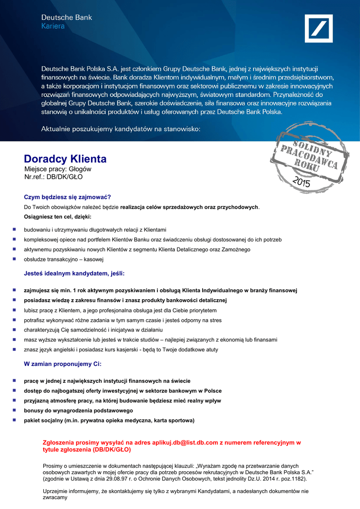 Doradcy Klienta Miejsce pracy: Głogów Nr.ref.: DB/DK/GŁO Czym będziesz się zajmować? Do Twoich obowiązków należeć będzie realizacja celów sprzedażowych oraz przychodowych. Osiągniesz ten cel, dzięki: budowaniu i utrzymywaniu długotrwałych relacji z Klientami kompleksowej opiece nad portfelem Klientów Banku oraz świadczeniu obsługi dostosowanej do ich potrzeb aktywnemu pozyskiwaniu nowych Klientów z segmentu Klienta Detalicznego oraz Zamożnego obsłudze transakcyjno – kasowej Jesteś idealnym kandydatem, jeśli: zajmujesz się min. 1 rok aktywnym pozyskiwaniem i obsługą Klienta Indywidualnego w branży finansowej posiadasz wiedzę z zakresu finansów i znasz produkty bankowości detalicznej lubisz pracę z Klientem, a jego profesjonalna obsługa jest dla Ciebie priorytetem potrafisz wykonywać różne zadania w tym samym czasie i jesteś odporny na stres charakteryzują Cię samodzielność i inicjatywa w działaniu masz wyższe wykształcenie lub jesteś w trakcie studiów – najlepiej związanych z ekonomią lub finansami znasz język angielski i posiadasz kurs kasjerski - będą to Twoje dodatkowe atuty W zamian proponujemy Ci: pracę w jednej z największych instytucji finansowych na świecie dostęp do najbogatszej oferty inwestycyjnej w sektorze bankowym w Polsce przyjazną atmosferę pracy, na której budowanie będziesz mieć realny wpływ bonusy do wynagrodzenia podstawowego pakiet socjalny (m.in. prywatna opieka medyczna, karta sportowa) Zgłoszenia prosimy wysyłać na adres [email protected] z numerem referencyjnym w tytule zgłoszenia (DB/DK/GŁO) Prosimy o umieszczenie w dokumentach następującej klauzuli: „Wyrażam zgodę na przetwarzanie danych osobowych zawartych w mojej ofercie pracy dla potrzeb procesów rekrutacyjnych w Deutsche Bank Polska S.A.” (zgodnie w Ustawą z dnia 29.08.97 r. o Ochronie Danych Osobowych, tekst jednolity Dz.U. 2014 r. poz.1182). Uprzejmie informujemy, że skontaktujemy się tylko z wybranymi Kandydatami, a nadesłanych dokumentów nie zwracamy