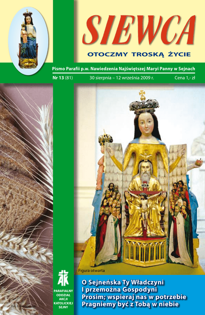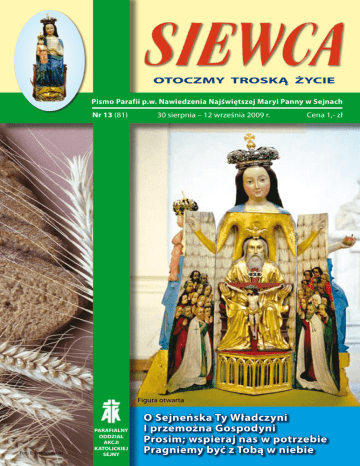 OTOCZMY TROSKĄ ŻYCIE Pismo Parafii p.w. Nawiedzenia Najświętszej Maryi Panny w Sejnach Nr 13 (81) 30 sierpnia – 12 września 2009 r. Cena 1,- zł Figura otwarta Fot.: L. Przeborowski PARAFIALNY ODDZIAŁ AKCJI KATOLICKIEJ SEJNY O Sejneńska Ty Władczyni I przemożna Gospodyni Prosim; wspieraj nas w potrzebie Pragniemy być z Tobą w niebie MOC SŁOWA Niedziela XXII Zwykła – 30.08.2009 Mk 7,1-8.14-15.21-23 Z ebrali się u Jezusa faryzeusze i kilku uczonych w Piśmie, którzy przybyli z Jerozolimy. I zauważyli, że niektórzy z Jego uczniów brali posiłek nieczystymi, to znaczy nie umytymi rękami. Faryzeusze bowiem i w ogóle Żydzi, trzymając się tradycji starszych, nie jedzą, jeśli sobie rąk nie obmyją, rozluźniając pięść. I gdy wrócą z rynku, nie jedzą, dopóki się nie obmyją. Jest jeszcze wiele innych zwyczajów, które przejęli i których przestrzegają, jak obmywanie kubków, dzbanków, naczyń miedzianych. Zapytali Go więc faryzeusze i uczeni w Piśmie: „Dlaczego twoi uczniowie nie postępują według tradycji starszych, lecz jedzą nieczystymi rękami?” Odpowiedział im: „Słusznie prorok Izajasz powiedział o was, obłudnikach, jak jest napisane: „Ten lud czci mnie wargami, lecz sercem swym daleko jest ode mnie. Ale czci na próżno, ucząc zasad podanych przez ludzi». Uchyliliście przykazanie Boże, a trzymacie się ludzkiej tradycji”. Potem przywołał znowu tłum do siebie i rzekł do niego:„Słuchajcie mnie wszyscy i zrozumiejcie. Nic nie wchodzi z zewnątrz w człowieka, co mogłoby uczynić go nieczystym; lecz co wychodzi z człowieka, to czyni człowieka nieczystym. Z wnętrza bowiem, z serca ludzkiego pochodzą złe myśli, nierząd, kradzieże, zabójstwa, cudzołóstwa, chciwość, przewrotność, podstęp, wyuzdanie, zazdrość, obelgi, pycha, głupota. Wszystko to zło z wnętrza pochodzi i czyni człowieka nieczystym”. Refleksja niedzielna: Dla słuchaczy, mających przygotowanie religioznawcze, dzisiejsze czytanie Ewangelii jest bardzo znajome. Jezus uzdrawia głuchoniemego w taki sam sposób, w jaki czynili to starożytni cudowni uzdrowiciele. Poszczególne elementy tej praktyki leczniczej spotyka się tysiące razy w opisach cudownych uzdrowień, jakie znajdujemy w kulturach tego świata. Uzdrowiciel – w tym przypadku Jezus – bierze osobę, która prosi Go o uzdrowienie, na bok, daleko od tłumu, ponieważ nie chce zdradzić swej sztuki leczniczej. Dotyka chorych narządów swoimi palcami i swoją śliną. Ślina, podobnie jak krew i oddech, w wielu kulturach uchodziła za siedlisko życia i szczególnie skuteczny środek leczniczy. Następnie podnosi oczy ku niebu i głęboko wzdycha, żeby wezwać ducha i wchłonąć go, ponieważ to jego nadprzyrodzoną mocą dokona się cudowne uzdrowienie. Wreszcie wypowiada zaklęcie, którego magiczną moc potęguje jego obce brzmienie i tajemnicze pochodzenie. Czy ewangeliście Markowi jednak chodziło o przedstawienie Jezusa jako jednego z wielu, a nawet tysięcy cudownych uzdrowicieli? Z pewnością nie. Zdumieni bowiem świadkowie tego cudownego wydarzenia wysławiają Jezusa jako Mesjasza, który stworzeniu przywraca pierwotny – dobry – porządek. Ale niewątpliwie dzisiejsze czytanie Ewangelii może poruszać wielu właśnie dlatego, że ewangelista Marek w sposób tak naturalny i plastyczny przedstawia Jezusa jako cudownego uzdrowiciela swojego czasu i swojej kultury. Dla wielu może to być bardzo odświeżający i orzeźwiający obraz Jego wcielenia i Jego bycia człowiekiem – obraz tak przekonujący, jakby namalowany przez samego Breughla. Hans Reiłhofer Niedziela XXIII Zwykła – 06.09.2009 Mk 7,31-37 J ezus opuścił okolice Tyru i przez Sydon przyszedł nad Jezioro Galilejskie, przemierzając posiadłości Dekapolu. Przyprowadzili Mu głuchoniemego i prosili Go, żeby położył na niego rękę. On wziął go na bok osobno od tłumu, włożył palce w jego uszy i śliną dotknął mu języka, a spojrzawszy w niebo, westchnął i rzekł do niego: „Effatha”, to znaczy: „Otwórz się”. Zaraz otworzyły się jego uszy, więzy języka się rozwiązały i mógł prawidłowo mówić. Jezus przykazał im, żeby nikomu nie mówili. Lecz im bardziej przykazywał, tym gorliwiej to rozgłaszali. I pełni zdumienia mówili: „Dobrze uczynił wszystko. Nawet głuchym słuch przywraca i niemym mowę”. SIEWCA Refleksja niedzielna: Jakimi oczyma czytamy słowa dzisiejszej Ewangelii? Jakimi uszami słuchamy słów wypowiadanych przez Jezusa ? Kim albo czym miałby być dla nas Jezus? Wiecznie nadzorującą instancją moralną, stale grożącym czy ostrzegającym palcem: ,,Jako dobry chrześcijanin powinieneś właściwie..., dobra chrześcijanka musiałaby przecież...!? - Może sformułowania te brzmią nieco przesadnie, ale przecież taki właśnie obraz nie jest rzadkością. Tak chętnie mówi się o Jezusie. W taki sposób chętnie się Go wykorzystuje, i to w bardzo różnych celach, nie zawsze szlachetnych. Wydaje się jednak, że nie wolno obrazu tego zmieniać do tego stopnia, że staje się on swoim przeciwieństwem – obrazem zawsze kochającego Boga, obrazem, który można by opatrzyć tytułem: ,,Ciesz się życiem, Jezus przecież cię kocha. Alleluja”. Jezus zaprasza wszystkich ludzi do życia – z jednej strony z miłością zachęca i pociesza, a z drugiej wyraźnie wskazuje także na ciemne czy surowe aspekty rzeczywistości. Jedno i drugie ma doprowadzić nas do życia i błogosławieństwa, nas i wszystkich innych: „Kto chce zachować swoje życie, straci je; a kto straci swe życie z powodu Mnie i Ewangelii, zachowa je”... Słowa dzisiejszej Ewangelii powinny nam przynieść ulgę, mimo wszystko. Jezus bowiem bez ogródek mówi o samej prawdzie życia. A któż nie chciałby jej znać? Któż nie chciałby wiedzieć, w czym tkwi sama tajemnica życia. Jezus chce nam powiedzieć mniej więcej tyle: Jeśli z wszystkich sił gonię za m