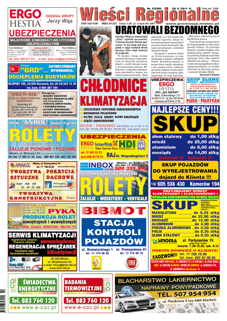URATOWALI BEZDOMNEGO Strażnicy Miejscy w ramach akcji „Zima” ujawnili koczowisko, w którym nocował 50-letni mężczyzna. To już drugi taki przypadek w ciągu ostatnich dwóch miesięcy, który mógł skończyć się tragicznie. W czwartek, 3 lutego, strażnicy otrzymali informację o mężczyźnie, który na obszarach niezamieszkałych w osiedlu Smoczka nocuje w prowizorycznym namiocie. Kilkukrotnie, w ciągu dnia, funkcjonariusze patrolowali to miejsce, lecz lokatora namiotu nie zastali. – Ślady e-mail: [email protected] wskazywały, że w tym miejscu ktoś przebywa regularnie, dlatego we wczesnych godzinach rannych patrol raz jeszcze skontrolował szałas. Tym razem z powodzeniem – powiedział Arkadiusz Misiak. Nocującym w namiocie okazał się 50-letni mężczyzna, na stałe mieszkający w jednym z pobliskich bloków. Strażnikom wyjaśnił, że nocami zbiera butelki, makulaturę i inne surowce wtórne. Jednak by nie budzić siedmioro swoich współlokatorów nocuje w namiocie, gdzie magazynuje też swoje znaleziska. – Mężczyzna odmówił przyjęcia jakiejkolwiek pomocy. Ta prowizoryczna noclegownia to już drugi przypadek tej zimy, który ujawnili strażnicy. Na przełomie listopada i grudnia ubiegłego roku funkcjonariusze znaleźli w przepuście pod ulicą Padykuły koczowisko mężczyzny, który także odmówił udzielenia mu pomocy. – Niestety w wielu takich przypadkach osoby te nadużywają alkoholu, a to utrudnia udzielenie im skutecznej pomocy – zaznaczył Arkadiusz Misiak. Krzysztof Urbański WIEŒCI REGIONALNE Nr 2/11 28 luty 2011 r. Str. kolekcjonerskie art. studio galeria-antykwariat w Mielcu, ul. Mickiewicza 7 (Stary Mielec - wejście w bramie) zaprasza na zakupy. Tylko tutaj znajdziesz oryginalne i niebanalne upominki i prezenty. Starocie z różnych stron kraju a nawet świata. Zapraszamy. K. Obutelewicz, Mielec - JADERNÓWKA, piórko tusz, kredka, karton A4 Uwaga! Jeśli masz stare zdjęcia, dokumenty, listy, pocztówki, plany, mapy, pamiątki z Mielca, Ziemi Mieleckiej i okolic, zgłoś się - kupimy je po atrakcyjnej cenie! Misterny koszyk-koszyczek druciany art deco (a może nawet i secesja) srebrzony, złocony. Wykonany z plecionych drutów stalowych i takiej samej podstawki ze stalowej blachy, które są posrebrzone, ponadto jeden grubszy pleciony drut jest złocony, jak również stylizowane i malowane kwiatki, które są zapewne wykonane ze złoconej blachy. Wszystkie elementy koszyka przyciąga magnes, a więc wykluczony jest materiał z mosiądzu czy aluminium bądź jego stopów. Koszyczek pochodzi prawdopodobnie z Belgii z zamożnego, być może nawet arystokratycznego domu. Jak na użyty materiał waży niewiele, bo ok. 650 gramów, co potwierdza misterność jego wykonania. Jest ok. 17 cm wysoki, ok. 9 cm średnica podstawy i ma ok. 24 cm w najszerszym miejscu. Niestety nie ma żadnych widocznych sygnatur czy znaków, a jego opis wynika z doświadczenia i wiedzy wystawiającego oraz informacji od poprzedniego właściciela. Na pewno jednak może być atrakcyjną ozdobą niejednego mieszkania, stołu, kredensu czy kominka. Stan przedmiotu dobry, brak widocznych uszkodzeń mechanicznych, tylko trochę przybrudzeń, zaśniedzeń i patyny. Jeśli masz antyki, stare zabytkowe przedmioty i urządzenia, np. szafy, stoliki, krzesła, kufry, kołowrotki, obrazy olejne, obrazy świętych, grafiki, ikony, rzeźby, statuetki, zegary, gramofony, płyty gramofonowe, aparaty fotograficzne, maszyny do pisania, militaria, części umundurowania i wyposażenia wojskowego i inne tego typu przedmioty SKLEP KOMIS GALERIA ANTYKWARIAT ZAPRASZA. 39-300 Mielec, ul. Mickiewicza 7 czynne od pon. do pt. w godz. 10.0016.00, sob. 10-13, tel./fax 017 5831498 , tel. kom. 0602 776197, 0602 739362. Zapraszamy kup, zostaw do sprzedaży lub sprzedaj! UWAGA! KUPIMY STARE KSIĄŻKI, PRASĘ ITP. UWAGA!!! PROWADZIMY SKUP, KOMIS I SPRZEDAŻ WSZELKIEGO RODZAJU WYROBÓW Z BURSZTYNU, SUROWEGO BURSZTYNU ORAZ STAREJ BIŻUTERII Z RÓŻNYCH MATERIAŁÓW, A TAKŻE STARE PIÓRA WIECZNE. Jesteśmy zainteresowani zakupem lub komisem pamiątek po b. ZSRR, głównie militariów oraz wszelkich innych militariów polskich, niemieckich i innych państw. oferujemy m.in. obrazy, akwarele, rzeźby itp. (ceny od 15 zł) * Ryszard Badura – grafika (akty) * Zbigniew Czerkies (rzeźba) * Roman Duda – ikony złocone * Agnieszka Emerling (fotografia) * Damian Gąsiewski (fotografia) * Krystyna Gargas-Gąsiewska (malarstwo) * Stanisław Kopala - kowalstwo artystyczne, świeczniki, akcesoria kominkowe, duża podkowa itp. * Małgorzata Kruk (malarstwo – pejzaże mieleckie) * Krawiec Krzysztof - grafiki * Dorota Łaz (malarstwo – m.in. pejzaże mieleckie) * Stanisław Mityk (akwarele) * Mirosław Szędzioł (malarstwo) * Kamil Taraszka – akwarele, malarstwo * Władysław Żurawski – grafiki (artysta nieżyjący) – ekspozycja rysunków i grafik. Jest to w chwili obecnej największa w Mielcu kolekcja malarstwa, grafik, ikon, rzeźby i fotografii oraz różnego rodzaju zabytkowych przedmiotów z różnych okresów na bieżąco udostępniona. ANTYKWARIAT - oferujemy też stare książki, gazety, dokumenty oraz Kącik Mielecjana – książki i wydawnictwa, zdjęcia oraz dokumenty związane z Ziemią Mielecką. Akwarele Krystyny Gargas-Gąsiewskiej Władysław Żurawski, Studium aktu kobiety, ASP Kraków 1911 rok (z okresu studiów artysty). Sygnowany i datowany. Rysunek ołówkiem o formacie ok. 14,5x22 cm. Henryk Momot ZAWODY SPORTOWE lata 60. plakatówka, Kartonik z bloku rysunkowego 21x15 cm, Ceramika - flakon ręcznie malowany E. Zyśk. Sygnowany na denku przez autorkę. Wysokość ok. 15 cm. Kowalstwo artystyczne - świecznik czteroramienny. Duży, wys. ok. 83 cm, szerokość ramion ok. 35 cm, ciężki - ok. 7 kg, ręcznie kuty z żelaza, patynowany. Ma już ze 2-3 lata, przykurzony, a nawet trochę przyrdzewiały. Wykonał go artysta kowal z Ropczyc. Jego wyroby kowalskie były na wielu 