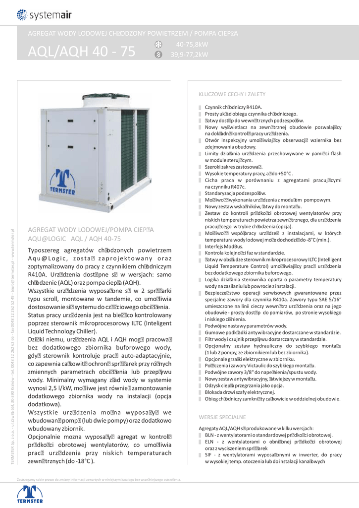 AGREGAT WODY LODOWEJ CHŁODZONY POWIETRZEM / POMPA CIEPŁA 40-75,8kW 39,9-77,2kW AQL/AQH 40 - 75 TERMSTER Sp. z o.o. - ul.Zawiła 65f, 30-390 Kraków - tel. 0048 12 262 62 66 - fax 0048 12 262 52 49 - [email protected] - www.termster.pl KLUCZOWE CECHY I ZALETY AGREGAT WODY LODOWEJ/POMPA CIEPŁA AQU@LOGIC AQL / AQH 40-75 Typoszereg agregatów chłodzonych powietrzem Aqu@Logic, został zaprojektowany oraz zoptymalizowany do pracy z czynnikiem chłodniczym R410A. Urządzenia dostępne są w wersjach: samo chłodzenie (AQL) oraz pompa ciepła (AQH). Wszystkie urządzenia wyposażone są w 2 sprężarki typu scroll, montowane w tandemie, co umożliwia dostosowanie się systemu do częściowego obciążenia. Status pracy urządzenia jest na bieżąco kontrolowany poprzez sterownik mikroprocesorowy ILTC (Inteligent Liquid Technology Chiller). Dzięki niemu, urządzenia AQL i AQH mogą pracować bez dodatkowego zbiornika buforowego wody, gdyż sterownik kontroluje pracę auto-adaptacyjnie, co zapewnia całkowitą ochronę sprężarek przy różnych zmiennych parametrach obciążenia lub przepływu wody. Minimalny wymagany zład wody w systemie wynosi 2,5 l/kW, możliwe jest również zamontowanie dodatkowego zbiornika wody na instalacji (opcja dodatkowa). Wszystkie urządzenia można wyposażyć we wbudowaną pompę (lub dwie pompy) oraz dodatkowo wbudowany zbiornik. Opcjonalnie mozna wyposażyć agregat w kontrolę prędkości obrotowej wentylatorów, co umożliwia pracę urządzenia przy niskich temperaturach zewnętrznych (do -18°C ). Zastrzegamy sobie prawo do zmiany informacji zawartych w niniejszym katalogu bez wcześniejszego ostrzeżenia. Czynnik chłodniczy R410A. Prosty układ obiegu czynnika chłodniczego. Łatwy dostęp do wewnętrznych podzespołów. Nowy wyświetlacz na zewnętrznej obudowie pozwalający na dokładną kontrolę pracy urządzenia. Otwór inspekcyjny umożliwiający obserwację wziernika bez zdejmowania obudowy. Limity działania urządzenia przechowywane w pamięci flash w module sterującym. Szeroki zakres zastosowań. Wysokie temperatury pracy, aż do +50°C . Cicha praca w porównaniu z agregatami pracującymi na czynniku R407c. Standaryzacja podzespołów. Możliwość wykonania urządzenia z modułem pompowym. Nowy zestaw wskaźników, łatwy do montażu. Zestaw do kontroli prędkości obrotowej wentylatorów przy niskich temperaturach powietrza zewnętrznego, dla urządzenia pracującego w trybie chłodzenia (opcja). Możliwość współpracy urządzeń z instalacjami, w których temperatura wody lodowej może dochodzić do -8°C (min.). Interfejs ModBus. Kontrola kolejności faz w standardzie. Łatwy w obsłudze sterownik mikroprocesorowy ILTC (Intelligent Liquid Temperature Control) umożliwiający pracę urządzenia bez dodatkowego zbiornika buforowego. Logika działania sterownika oparta o parametry temperatury wody na zasilaniu lub powrocie z instalacji. Bezpieczeństwo operacji serwisowych gwarantowane przez specjalne zawory dla czynnika R410a. Zawory typu SAE 5/16” umieszczone na linii cieczy wewnątrz urządzenia oraz na jego obudowie - prosty dostęp do pomiarów, po stronie wysokiego i niskiego ciśnienia. Podwójne nastawy parametrów wody. Gumowe podkładki antywibracyjne dostarczane w standardzie. Filtr wody i czujnik przepływu dostarczany w standardzie. Opcjonalny zestaw hydrauliczny do szybkiego montażu (1 lub 2 pompy, ze zbiornikiem lub bez zbiornika). Opcjonale grzałki elektryczne w zbiorniku. Połączenia i zawory Victaulic do szybkiego montażu. Podwójne zawory 3/8" do napełnienia/spustu wody. Nowy zestaw antywibracyjny, łatwiejszy w montażu. Odzysk ciepła przegrzania jako opcja. Blokada drzwi szafy elektrycznej. Obieg chłodniczy zamknięty całkowicie w oddzielnej obudowie. WERSJE SPECJALNE Agregaty AQL/AQH są produkowane w kilku wersjach: BLN - z wentylatorami o standardowej prędkości obrotowej. ELN - z wentylatorami o obniżonej prędkości obrotowej oraz z wyciszeniem sprężarek SIF - z wentylatorami wyposażonymi w inwerter, do pracy w wysokiej temp. otoczenia lub do instalacji kanałowych PANEL STEROWANIA Obudowa urządzeń Aqu@Logic wykonana jest z grubej, ocynkowanej stali malowanej proszkowo poliestrową farbą w kolorze białym (RAL 9001). Urządzenia są przeznaczone do montażu na zewnątrz. Urządzenia są wyposażone w dostępny od zewnątrz panel sterowania z drzwiczkami z tworzywa sztucznego. A g re gat y AQ L /AQ H s ą w y p o s a żo n e w ste ro w n i k mikroprocesorowy ILTC, który zapewnia inteligentny nadzór nad parametrami wody na powrocie lub na zasilaniu instalacji chłodniczej. Przyjazny dla użytkownika: tylko 3 przyciski i odpowiednia logika, umożliwiają łatwą kontrolę urządzenia. Niezawodny: wszystkie wskazania na wyświetlaczu są widoczne w każdych warunkach pogodowych. Procedura testowa. Wizualizacja alarmów z listą ostatnich 10 zdarzeń. Zdalny przełącznik ON/OFF. Licznik godzin pracy sprężarek i pomp. Przetworniki ciśnienia na ssaniu i tłoczeniu. Kontrola maksymalnej temperatury tłoczenia. Tryb pracy przy częściowym obciążeniu. Zdalny przełącznik trybu Grzanie/Chłodzenie. Pełna kompatybilność z BMS (protokół ModBus dla RS485). Parametry sprężarki przechowywane w pamięci flash. SPRĘŻARKI Dwie sprężarki typu scroll, pracujące w tandemie, zamontowane na ramie na gumowych amortyzatorach drgań. Silniki sprężarek z bezpośrednim rozruchem, chłodzone czynnikiem chłodniczym, wyposażone w zabezpieczenie przeciążeniowe. Opjonalnie - odciążony rozruch. PAROWNIK Wymiennik ciepła ze stali nierdzewnej, zaizolowany pianką syntetyczną. Podczas przestoju, wymiennik chroniony grzałką elektryczną (35W) przed oblodzeniem przy niskich temperaturach zewnętrznych (-10°C min.). Maksymalne ciśnienie robocze po stronie wodnej wynosi 10bar, natomiast po stronie czynnika chłodniczego - 45bar. ELEMENTY ZABEZPIECZAJĄCE I KONTROLNE SKRAPLACZ Skraplacz chłodzony po