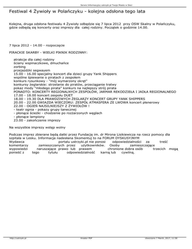 Serwis Informacyjny ustrzyki.pl Twoje Miasto w Sieci Festiwal 4 Żywioły w Polańczyku - kolejna odsłona tego lata Kolejna, druga odsłona festiwalu 4 Żywioły odbędzie się 7 lipca 2012 przy OSW Skalny w Polańczyku, gdzie odbędą się koncerty oraz imprezy dla całej rodziny. Początek o godzinie 14.00. 7 lipca 2012 - 14.00 - rozpoczęcie PIRACKIE SKARBY - WIELKI PIKNIK RODZINNY: atrakcje dla całej rodziny ściany wspinaczkowe, dmuchańce zorbing przejażdżki segwayem 15.00 - 16.00 specjalny koncert dla dzieci grupy Yank Shippers wspólne śpiewanie o piratach z zespołem konkurs rysunkowy - "mój wymarzony okręt" konkursy żeglarskie: strzelanie do piratów, przeciąganie tratwy pokaz mody "młodego pirata" konkurs na najlepszy strój pirata PONADTO: KONCERTY REGIONALNYCH ZESPOŁÓW, JARMAR REKODZIEŁA I JADŁA REGIONALNEGO 17.00 - 18.00 koncert zespołu DUET 18.00 - 19.30 DLA PRAWDZIWYCH ŻEGLARZY KONCERT GRUPY YANK SHIPPERS 20.00 - 22.00 GWIAZDA WIECZORU: ZESPÓŁ ATMASFERA ZE LWOWA koncert plenerowy 22.00 - OGIEŃ NAJSILNIEJSZY Z ŻYWIOŁÓW ! - teatr ognia - pokazy grupy tanecznej - płonące ścieżki - chodzenie po rozżarzonych węglach - płonące lampiony 23.00 - zakończenie imprezy Na wszystkie imprezy wstęp wolny Podczas imprez zbierane będą datki przez Fundację im. dr Mirona Lisikiewicza na rzecz pomocy dla szpitala w Lesku. Informacja nadesłana Skomentuj to na FORUM DYSKUSYJNYM Wydawca portalu ustrzyki.pl nie ponosi odpowiedzialności za treść komentarzy zamieszczanych przez użytkowników. Osoby zamieszczające wypowiedzi naruszające prawo lub prawem chronione dobra osób trzecich mogą ponieść z tego tytułu odpowiedzialność karną lub cywilną. http://ustrzyki.pl Kreator PDF Utworzono 7 March, 2017, 11:58