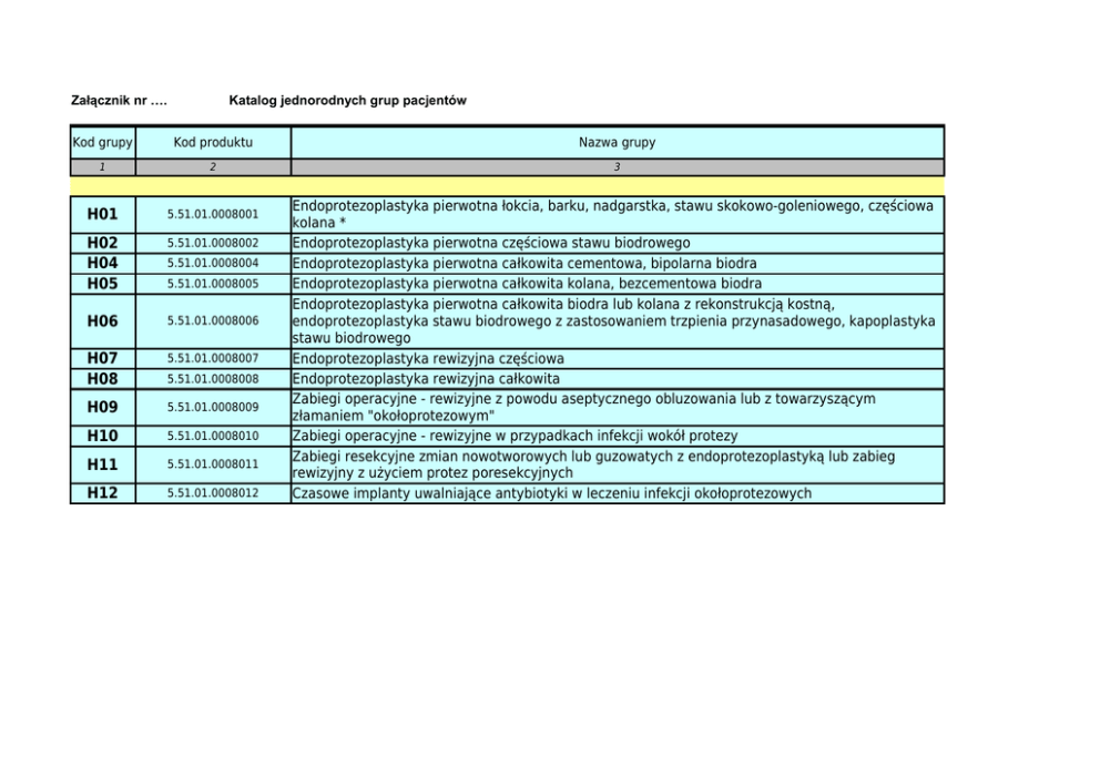 Załącznik nr …. Katalog jednorodnych grup pacjentów Kod grupy Kod produktu Nazwa grupy 1 2 3 H01 5.51.01.0008001 H02 H04 H05 5.51.01.0008002 H06 5.51.01.0008006 H07 H08 5.51.01.0008007 H09 5.51.01.0008009 H10 5.51.01.0008010 H11 5.51.01.0008011 H12 5.51.01.0008012 5.51.01.0008004 5.51.01.0008005 5.51.01.0008008 Endoprotezoplastyka pierwotna łokcia, barku, nadgarstka, stawu skokowo-goleniowego, częściowa kolana * Endoprotezoplastyka pierwotna częściowa stawu biodrowego Endoprotezoplastyka pierwotna całkowita cementowa, bipolarna biodra Endoprotezoplastyka pierwotna całkowita kolana, bezcementowa biodra Endoprotezoplastyka pierwotna całkowita biodra lub kolana z rekonstrukcją kostną, endoprotezoplastyka stawu biodrowego z zastosowaniem trzpienia przynasadowego, kapoplastyka stawu biodrowego Endoprotezoplastyka rewizyjna częściowa Endoprotezoplastyka rewizyjna całkowita Zabiegi operacyjne - rewizyjne z powodu aseptycznego obluzowania lub z towarzyszącym złamaniem "okołoprotezowym" Zabiegi operacyjne - rewizyjne w przypadkach infekcji wokół protezy Zabiegi resekcyjne zmian nowotworowych lub guzowatych z endoprotezoplastyką lub zabieg rewizyjny z użyciem protez poresekcyjnych Czasowe implanty uwalniające antybiotyki w leczeniu infekcji okołoprotezowych
