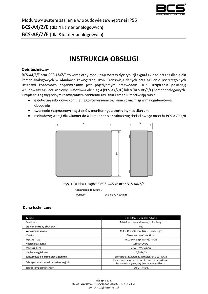 Modułowy system zasilania w obudowie zewnętrznej IP56 BCS-A4/Z/E (dla 4 kamer analogowych) BCS-A8/Z/E (dla 8 kamer analogowych) INSTRUKCJA OBSŁUGI Opis techniczny BCS-A4/Z/E oraz BCS-A8/Z/E to kompletny modułowy system dystrybucji sygnału video oraz zasilania dla kamer analogowych w obudowie zewnętrznej IP56. Transmisja danych oraz zasilanie poszczególnych urządzeń końcowych doprowadzane jest pojedynczym przewodem UTP. Urządzenia posiadają wbudowany zasilacz sieciowy i umożliwia obsługę 4 (BCS-A4/Z/E) lub 8 (BCS-A8/Z/E) kamer analogowych. Urządzenia są wygodnym rozwiązaniem problemu zasilania kamer i umożliwiają min.: estetyczną zabudowę kompletnego rozwiązania zasilania i transmisji w małogabarytowej obudowie tworzenie rozproszonych systemów monitoringu z centralnym zasilaniem rozbudowę wersji dla 4 kamer do 8 kamer poprzez zabudowę dodatkowego modułu BCS-AVPI1/4 Rys. 1. Widok urządzeń BCS-A4/Z/E oraz BCS-A8/Z/E Objaśnienia do rysunku Wymiary 240 x 190 x 90 mm Dane techniczne Model Obudowa BCS-A4/Z/E oraz BCS-A8/Z/E Metalowa, wentylowana, kolor biały Stopień ochrony obudowy Wymiary obudowy Montaż Typ zasilacza Napięcie zasilania Moc zasilacza Napięcie wyjściowe Zabezpieczenie przed przeciążeniem Zabezpieczenie przed zwarciem wyjścia Zakres temperatur pracy IP20 240 x 190 x 90 mm (szer. × wys. × gł.) Otwory montażowe 6mm impulsowy, sprawność >90% 180÷260V AC 72W – moc ciągła 11,2÷14,2V 9A – próg zadziałania zabezpieczenia zasilacza Elektroniczne zabezpieczenie przeciwzwarciowe. Po zwarciu wymagany jest restart zasilacza. -10°C - +40°C NSS Sp. z o. o. 02-285 Warszawa; ul. Szyszkowa 20 A; tel: 22 551 20 60 [email protected] Instalacja i obsługa urządzenia Zasady bezpieczeństwa Urządzenie może być montowane tylko przez wykwalifikowanego instalatora, posiadającego odpowiednie zezwolenia i uprawnienia do przyłączania (ingerencji) w instalacje 230VAC oraz instalacje niskonapięciowe. Pomimo, że obudowa zasilacza posiada wysoki stopień ochrony to zaleca się aby urządzenie montować w miejscach chronionych przed bezpośrednim wpływem czynników atmosferycznych, w szczególności przed deszczem i nasłonecznieniem. Ponieważ urządzenie nie posiada wyłącznika umożliwiającego odłączenie zasilania sieciowego, należy powiadomić właściciela lub użytkownika urządzenia o sposobie odłączenia go od sieci. Obwody wyjściowe zasilacza są odizolowane od obwodów sieciowych. Instalacja urządzenia UWAGA Przed przystąpieniem do instalacji oraz w trakcie prac konserwacyjnych należy upewnić się, że napięcie w obwodzie zasilającym 230VAC jest odłączone! 1. Urządzenie zamontować w wybranym miejscu i doprowadzić przewody połączeniowe. 2. Przewody zasilające 230VAC podłączyć do zacisków L, N listwy śrubowej. 3. Podłączyć przewody UTP prowadzące do poszczególnych kamer. 4. Załączyć zasilanie 230VAC. Jeżeli wszystkie połączenia zostały wykonane poprawnie to dioda sygnalizacyjna na panelu urządzenia powinna się zaświecić. W przypadku, gdy nie zaświeci się żadna z diod LED należy sprawdzić stan bezpiecznika umieszczonego w listwie śrubowej. 5. Po sprawdzeniu poprawności działania urządzenia należy zamknąć obudowę. Sygnalizacja (wewnętrzny moduł zasilacza) Obecność napięcia sieciowego 230VAC sygnalizowane jest świeceniem pomarańczowej diody LED (LED_AC w module zasilacza). Obecność napięcia na wyjściach zasilacza sygnalizowana jest świeceniem niebieskiej diody LED. Obecność zasilania w poszczególnych liniach UTP sygnalizowana jest świeceniem czerwonych diod LED znajdujących się w gniazdach RJ-45. Konserwacja W przypadku znacznego zapylenia wskazane jest odkurzenie wnętrza urządzenia z wykorzystaniem sprężonego powietrza (po uprzednim odłączeniu zasilacza od sieci elektroenergetycznej). W przypadku wymiany bezpieczników należy używać zamienników zgodnych z oryginalnymi. OZNAKOWANIE WEEE Zużytego sprzętu elektrycznego i elektronicznego nie wolno wyrzucać razem ze zwykłymi domowymi odpadami. Według dyrektywy WEEE obowiązującej w UE dla zużytego sprzętu elektrycznego i elektronicznego należy stosować oddzielne sposoby utylizacji. Zaprojektowano i wyprodukowano w Polsce NSS Sp. z o. o. 02-285 Warszawa; ul. Szyszkowa 20 A; tel: 22 551 20 60 [email protected]