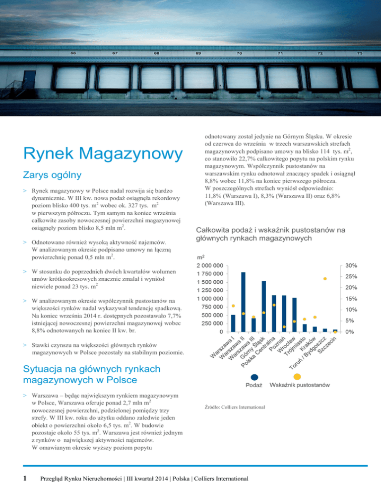Rynek Magazynowy Zarys ogólny > Rynek magazynowy w Polsce nadal rozwija się bardzo dynamicznie. W III kw. nowa podaż osiągnęła rekordowy poziom blisko 400 tys. m2 wobec ok. 327 tys. m2 w pierwszym półroczu. Tym samym na koniec września całkowite zasoby nowoczesnej powierzchni magazynowej osiągnęły poziom blisko 8,5 mln m2. > Odnotowano również wysoką aktywność najemców. W analizowanym okresie podpisano umowy na łączną powierzchnię ponad 0,5 mln m2. odnotowany został jedynie na Górnym Śląsku. W okresie od czerwca do września w trzech warszawskich strefach magazynowych podpisano umowy na blisko 114 tys. m2, co stanowiło 22,7% całkowitego popytu na polskim rynku magazynowym. Współczynnik pustostanów na warszawskim rynku odnotował znaczący spadek i osiągnął 8,8% wobec 11,8% na koniec pierwszego półrocza. W poszczególnych strefach wyniósł odpowiednio: 11,8% (Warszawa I), 8,3% (Warszawa II) oraz 6,8% (Warszawa III). Całkowita podaż i wskaźnik pustostanów na głównych rynkach magazynowych > W stosunku do poprzednich dwóch kwartałów wolumen umów krótkookresowych znacznie zmalał i wyniósł niewiele ponad 23 tys. m2 > W analizowanym okresie współczynnik pustostanów na większości rynków nadal wykazywał tendencję spadkową. Na koniec września 2014 r. dostępnych pozostawało 7,7% istniejącej nowoczesnej powierzchni magazynowej wobec 8,8% odnotowanych na koniec II kw. br. > Stawki czynszu na większości głównych rynków magazynowych w Polsce pozostały na stabilnym poziomie. Sytuacja na głównych rynkach magazynowych w Polsce > Warszawa – będąc największym rynkiem magazynowym w Polsce, Warszawa oferuje ponad 2,7 mln m2 nowoczesnej powierzchni, podzielonej pomiędzy trzy strefy. W III kw. roku do użytku oddano zaledwie jeden obiekt o powierzchni około 6,5 tys. m2. W budowie pozostaje około 55 tys. m2. Warszawa jest również jednym z rynków o największej aktywności najemców. W omawianym okresie wyższy poziom popytu 1 Źródło: Colliers International Przegląd Rynku Nieruchomości | III kwartał 2014 | Polska | Colliers International > Górny Śląsk – jest drugim pod względem wielkości rynkiem magazynowy w Polsce. Całkowita podaż na tym rynku na koniec września 2014 r. przekroczyła poziom 1,53 mln m2. Do użytku oddano blisko 29 tys. m2, a w budowie pozostaje ok. 60 tys. m2 powierzchni magazynowej. Na Śląsku odnotowano najwyższą wśród pozostałych rynków aktywność najemców. Wolumen transakcji osiągnął poziom ok. 120 tys. m2 wynajętych w ramach 17 umów. Warto zauważyć, że 83% aktywności najemców stanowiły nowe umowy, wobec 17% renegocjacji. Współczynnik pustostanów na koniec III kwartału wyniósł 8,7%. > Polska Centralna (region łódzki) – na koniec września 2014 r. całkowita podaż nowoczesnej powierzchni magazynowej przekroczyła poziom 1,1 mln m2. Do użytku oddano ponad 35 tys. m2.W budowie pozostaje 38 tys. m2, które zostaną dostarczone na rynek w ramach dwóch obiektów firmy Panattoni. Aktywność najemców w minionym kwartale nieznacznie się zwiększyła i wyniosła blisko 42 tys. m2, 100% zawartych transakcji stanowiły nowe umowy. Wskaźnik pustostanów wykazywał dalszą tendencję spadkową i na koniec omawianego okresu wynosił 12,2%. > Poznań – w III kw. 2014 r. podaż na poznańskim rynku wzrosła o ponad 124 tys. m2, w ramach trzech ukończonych projektów. Najważniejszą inwestycją oddaną do użytku był obiekt o powierzchni 100 tys. m² dla firmy Amazon(deweloper – Panattoni). W efekcie, na koniec III kwartału całkowite zasoby nowoczesnej powierzchni magazynowej przekroczyły 1,1 mln m2. Poznań charakteryzuje się najwyższą spośród analizowanych rynków magazynowych sumą powierzchni w budowie, która obecnie przekracza 200 tys. m2. Popyt w analizowanym okresie pozostawał na stabilnym poziomie i osiągnął 94 tys. m2. W dalszym ciągu Poznań pozostaje rynkiem o jednym z najniższych wskaźników pustostanów, który na koniec III kwartału wyniósł 2,3%. > Wrocław – w III kwartale do użytku oddano ponad 172 tys. m² nowoczesnej powierzchni magazynowej w tym 123 tys. m² dla firmy Amazon (deweloper – Goodman), tym samym zwiększając całkowitą podaż na do ponad 1 mln m2. Obecnie w budowie znajduje się około 138 tys. m2. W III kw. podpisano umowy na łączną powierzchnię ok. 62 tys. m² (125 tys. m2 w pierwszym półroczu). Na koniec omawianego okresu współczynnik wolnych powierzchni spadł z 6,2% na koniec II kwartału do poziomu 4,7%. powierzchni magazynowej. Współczynnik pustostanów na koniec III kwartału wynosił 5,8%. > Kraków – podaż nowoczesnej powierzchni magazynowej pozostała na niezmienionym poziomie 160 tys. m2. Obecnie w budowie znajduje się kolejna faza Goodman Kraków Airport Logistics Center o powierzchni około 22,8 tys. m2. W omawianym okresie wynajęto blisko19 tys. m2. Współczynnik pustostanów w stosunku do poprzedniego kwartału wzrósł, co spowodowane było wygaśnięciem niektórych umów najmu. Na koniec września 2014 r. wyniósł on 6,7%. Wybrane transakcje najmu w III kw. 2014 r. BUDYNEK POW. (m2 ) RODZAJ UMOWY Europolis Park Błonie 15 500 20 200 Renegocjacja / Ekspansja Panattoni Park Stryków 14 000 BTS PointPark Poznań 13 500 Nowa umowa NAJEMCA Wilshire Holding UPS CEVA Logistics I Logistics Tiner Logistic Park 12 500 Nowa umowa KMC Services Goodman Kraków Airport Logistics Center 11 200 Renegocjacja Hi Logistics Prologis Park Wrocław IV 11 050 Renegocjacja Delta Packaging Panattoni Park Gliwice II 10 600 BTS BTS Pilkington 10 500 BTS Pilkington Źródło: Colliers International Efektywne stawki czynszu (EUR/m²/miesiąc) EFEKTYWNE STAWKI CZYNSZU (EUR/m²) MIN. (EUR/m²) MAX. (EUR/m²) Warszawa I 3,20 5,00 Warszawa II 2,00 2,90 Warszawa III 2,00 2,90 Polska Centralna 1,90 2,90 Poznań 2,20 2,90 Górny Śląsk 2,00 3,00 Kraków 3,70 4,60 Wrocław 2,70 3,20 Trójmiasto 2,80 3,50 Toruń/