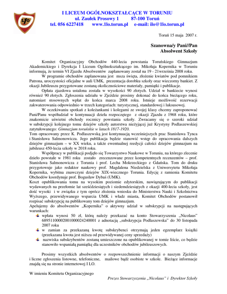 I LICEUM OGÓLNOKSZTAŁCĄCE W TORUNIU ul. Zaułek Prosowy 1 87-100 Toruń tel. 056 6227418 www.1lo.torun.pl e-mail: [email protected] Toruń 15 maja 2007 r. Szanowna/y Pani//Pan Absolwent Szkoły Komitet Organizacyjny Obchodów 440-lecia powstania Toruńskiego Gimnazjum Akademickiego i Dyrekcja I Liceum Ogólnokształcącego im. Mikołaja Kopernika w Toruniu informują, że termin VI Zjazdu Absolwentów zaplanowany został na 19 - 21września 2008 roku. W programie obchodów zaplanowana jest msza święta, złożenie kwiatów pod pomnikiem Patrona, uroczystości oficjalne w auli UMK, prezentacja dorobku szkoły oraz wieczorny bankiet. Z okazji Jubileuszu przygotowane zostaną okolicznościowe materiały, pamiątki i publikacje. Opłata zjazdowa ustalona została w wysokości 90 złotych. Udział w bankiecie wynosi również 90 złotych. Zgłoszenia udziału w Zjeździe prosimy dokonać do końca bieżącego roku, natomiast stosownych wpłat do końca marca 2008 roku. Istnieje możliwość rezerwacji zakwaterowania odpowiednio w trzech kategoriach: turystycznej, standardowej i luksusowej. W oczekiwaniu spotkań z koleżankami i kolegami ze swojej klasy chcemy zaproponować Pani/Panu współudział w kontynuacji dzieła rozpoczętego z okazji Zjazdu z 1968 roku, które znakomicie uświetni obchody rocznicy powstania szkoły. Zwracamy się o szeroki udział w subskrypcji kolejnego tomu dziejów szkoły autorstwa nieżyjącej już Krystyny Podlaszewskiej zatytułowanego: Gimnazjum toruńskie w latach 1817-1920. Tom opracowany przez K. Podlaszewską jest kontynuacją wcześniejszych prac Stanisława Tynca i Stanisława Salmonowicza. Jego publikacja będzie stanowić wstęp do opracowania dalszych dziejów gimnazjum – w XX wieku, a także ewentualnej reedycji całości dziejów gimnazjum na jubileusz 450-lecia szkoły w 2018 roku. Współpracy w publikacji podjęło się Towarzystwo Naukowe w Toruniu, na którego zlecenie dzieło powstałe w 1981 roku zostało zrecenzowane przez kompetentnych recenzentów – prof. Stanisława Salmonowicza z Torunia i prof. Lecha Mokrzeckiego z Gdańska. Tom do druku przygotowuje jako redaktor naukowy prof. Magdalena Niedzielska z Uniwersytetu Mikołaja Kopernika, wybitna znawczyni dziejów XIX-wiecznego Torunia. Edycję z ramienia Komitetu Obchodów koordynuje prof. Bogusław Dybaś (UMK). Koszt opublikowania tomu na wysokim poziomie edytorskim, nawiązującym do publikacji wydawanych na przełomie lat sześćdziesiątych i siedemdziesiątych z okazji 400-lecia szkoły, jest dość wysoki i w związku z tym oprócz złożenia wniosku do Ministerstwa Nauki i Szkolnictwa Wyższego, przewidywanego wsparcia UMK i władz miasta, Komitet Obchodów postanowił rozpisać subskrypcję na publikowany tom dziejów gimnazjum. Apelujemy do absolwentów „Kopernika” o aktywny udział w subskrypcji na następujących warunkach: wpłata wynosi 50 zł, którą należy przekazać na konto Stowarzyszenia „Nicolaus” 68951100002001000024240001 z adnotacją „subskrypcja Podlaszewska” do 30 listopada 2007 roku w zamian za przekazaną kwotę subskrybenci otrzymają jeden egzemplarz książki (przekazana kwota jest niższa od przewidywanej ceny sprzedaży) nazwiska subskrybentów zostaną umieszczone na opublikowanej w tomie liście, co będzie stanowiło wspaniałą pamiątkę dla uczestników obchodów jubileuszowych. Prosimy wszystkich absolwentów o rozpowszechnienie informacji o naszym Zjeździe i liczne zgłoszenia listowne, telefoniczne, mailowe bądź osobiste w szkole. Bieżące informacje znajdą się na stronie internetowej I LO. W imieniu Komitetu Organizacyjnego Prezes Stowarzyszenia „Nicolaus” i Dyrektor Szkoły