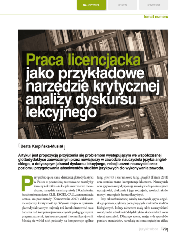 nauczyciel uczeń kontekst temat numeru Praca licencjacka jako przykładowe narzędzie krytycznej analizy dyskursu lekcyjnego [ Beata Karpińska-Musiał ] Artykuł jest propozycją przyjrzenia się problemom występującym we współczesnej glottodydaktyce zauważanym przez nowicjuszy w zawodzie nauczyciela języka angielskiego, a dotyczącym jakości dyskursu lekcyjnego, relacji uczeń-nauczyciel oraz poziomu przygotowania absolwentów studiów językowych do wykonywania zawodu. P rzy próbie opisu stanu dzisiejszej glottodydaktyki w Polsce z pewnością zastosowane zostałyby terminy i określenia takie jak: mistrzostwo metodyczne, narzędzia na miarę szkoły 2.0, szkolenia, kształcenie ustawiczne, CLIL, ESOKJ, CALL, autonomizacja ucznia, era post-metody (Komorowska 2007), eklektyzm metodyczny, kreatywność itp. Wysokie miejsce w dyskursie glottodydaktycznym zajmują też interkulturowość oraz badania nad kompetencjami nauczycieli: pedagogicznymi, pragmatycznymi, językoznawczymi i komunikacyjnymi. Mnożą się wśród nich podziały na kompetencje ogólne (ang. generic) i kierunkowe (ang. specific) (Pitura 2011) oraz szeroko znane kompetencje kluczowe. Nauczyciele oraz językoznawcy dysponują szeroką wiedzą o strategiach uprzejmości, dyskursie i jego rodzajach, teoriach aktów mowy i strategiach komunikacyjnych. Przy tak rozbudowanej wiedzy nauczycieli języka angielskiego poziom językowy początkujących studentów studiów filologicznych, którzy niebawem mają także nauczycielami zostać, budzi jednak wśród dydaktyków akademickich coraz więcej zastrzeżeń. Dlaczego zatem, znając tyle sposobów pomiaru standardów, narzekają oni coraz częściej na efekty [ 79 ] kontekst uczeń nauczyciel temat numeru nauczania mierzone wciąż owymi standardami i pisanymi pomiędzy uczestnikami dialogu edukacyjnego w sytuacjach według nich testami? Dlaczego też szkoła/akademia nie jest dydaktycznych, złożonej z interakcji zarówno werbalnej, jak uważana za miejsce rozwijania kreatywności? (Karpińska- i niewerbalnej, symbolicznej, oraz tej wynikającej z hierarchii -Musiał 2011). Poszukując odpowiedzi władzy. Podążając za rozumieniem analizy na te pytania, zdecydowałam przyjrzeć Czy dzisiejsi dyskursu przez Ruth Wodak (2008), według się dyskursowi lekcyjnemu nie za pomocą studenci, którzy której wszelkie praktyki społeczne formułotradycyjnych badań ilościowych w tematyce dopiero co sami wane są poprzez język i w nim realizowane, pedeutologii, ani też nie przez testowanie uczestniczyli zamiarem moim jest wychwycenie w tekstach i pomiar osiągnięć uczniów w zakresie studentów tendencji do przenoszenia uwagi w procesach dydaktyki. Soczewką uczyniłam opinie na istotność aspektów poza metodycznych, edukowania na studentów kończących studia pierwszego oscylujących wokół psychologicznych, miarę XXI wieku, stopnia na filologii angielskiej o specjalności społecznych i kulturowych mechanizmów potrafią pokazać nauczycielskiej na temat tego, co poza trafną działających w grupie pomiędzy jej uczestnam poprzez metodą konstytuuje według nich skuteczną nikami oraz nimi i nauczycielem. Obiektem wskazanie jednostkę lekcyjną. Opinie te zostały zebrane analizy jest zatem nie tyle sama treść prac, ile zagadnień dla na podstawie lektury 21 prac licencjackich przede wszystkim widoczna w nich logika nich istotnych, napisanych w latach 2009/2010 i 2010/2011. argumentacji prowadząca do określonych jak za pomocą Badanie to miało na celu zaobserwowanie celów badawczych. Zostały one pogrupowane odpowiednich dwóch zjawisk. Po pierwsze tego, czy wybietematycznie na prace bardziej skoncentrowane technik rana tematyka prac, będąc – a tak należy na zagadnieniach czysto metodycznych dyskursywnych założyć – odbiciem kierunku zainteresowań oraz te, które metodykę traktują jako tło uczynić lekcję przyszłych nauczycieli języka angielskiego, do rozważań o sprawach wpływających językową lub pokazuje szczególne obszary ich dążenia do na efektywność nauczania, a związanych wykład bardziej mistrzostwa metodologicznego (i czy tylko raczej z zastosowaniem różnych metod skutecznymi metodologicznego?). Po drugie – wskazanie, dyskursywnych (wizualnych, werbalnych, i interesującymi? gdzie w obecnych czasach post-metody niewerbalnych). Tytuły prac podawane są przyszli nauczyciele, sami będąc jeszcze studentami, upatrują w tłumaczeniu na język polski, mimo że oryginalnie powstały źródła problemów z dyskursem edukacyjnym na lekcjach języka one w języku angielskim. obcego w szkole lub na uniwersytecie. Czy dzisiejsi studenci, którzy dopiero co sami uczestniczyli w procesach edukowania Prace w roku akademickim 2009/2010 na miarę XXI wieku, potrafią pokazać nam poprzez wskazanie Problematyka metodyczna zagadnień dla nich istotnych, jak za pomocą odpowiednich Praca zatytułowana Technika odgrywania ról jako dydaktyczna technik dyskursywnych uczynić lekcję językową lub wykład konsekwencja zabawy symbolicznej w nauczaniu języka angielbardziej skutecznymi i interesującymi? skiego małych dzieci (Polachowska 2010) podkreśla znaczenie zabawy symbolicznej dzieci dla rozwijania zdolności językowych Charakter i cele badania w późniejszym wieku i wskazuje na istotność etapu zabawy Badanie przeprowadzone zostało metodą monografii pedagogicz- symbolicznej dla skuteczności metody odgrywania ról jako nej poprzez jakościową analizę prac licencjackich absolwentów metody ściśle dydaktycznej. Rozwój dziecka i związane z nim dwóch kolejnych roczników trzyletnich filologicznych studiów teorie pedagogiczno-psychologiczne znajdują odzwierciedlenie stacjonarnych w Instytucie Anglistyki i Amerykanistyki w kilku następnych pracach, każda trochę z innej perspektywy. Uniwersytetu Gdańskiego. Głównym celem była analiza tej Temat ten porusza także praca o tytule: Teoria inteligencji tematyki pod kątem