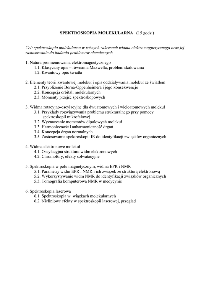 SPEKTROSKOPIA MOLEKULARNA (15 godz.) Cel: spektroskopia molekularna w różnych zakresach widma elektromagnetycznego oraz jej zastosowanie do badania problemów chemicznych 1. Natura promieniowania elektromagnetycznego 1.1. Klasyczny opis – równania Maxwella, problem skalowania 1.2. Kwantowy opis światła 2. Elementy teorii kwantowej molekuł i opis oddziaływania molekuł ze światłem 2.1. Przybliżenie Borna-Oppenheimera i jego konsekwencje 2.2. Koncepcja orbitali molekularnych 2.3. Momenty przejść spektroskopowych 3. Widma rotacyjno-oscylacyjne dla dwuatomowych i wieloatomowych molekuł 3.1. Przykłady rozwiązywania problemu strukturalnego przy pomocy spektroskopii mikrofalowej 3.2. Wyznaczanie momentów dipolowych molekuł 3.3. Harmoniczność i anharmoniczność drgań 3.4. Koncepcja drgań normalnych 3.5. Zastosowanie spektroskopii IR do identyfikacji związków organicznych 4. Widma elektronowe molekuł 4.1. Oscylacyjna struktura widm elektronowych 4.2. Chromofory, efekty solwatacyjne 5. Spektroskopia w polu magnetycznym, widma EPR i NMR 5.1. Parametry widm EPR i NMR i ich związek ze strukturą elektronową 5.2. Wykorzystywanie widm NMR do identyfikacji związków organicznych 5.3. Tomografia komputerowa NMR w medycynie 6. Spektroskopia laserowa 6.1. Spektroskopia w wiązkach molekularnych 6.2. Nieliniowe efekty w spektroskopii laserowej, przegląd