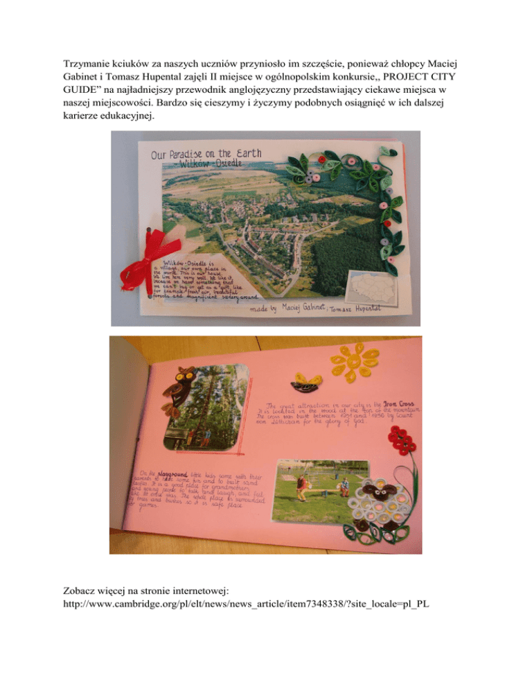 Trzymanie kciuków za naszych uczniów przyniosło im szczęście, ponieważ chłopcy Maciej Gabinet i Tomasz Hupental zajęli II miejsce w ogólnopolskim konkursie,, PROJECT CITY GUIDE” na najładniejszy przewodnik anglojęzyczny przedstawiający ciekawe miejsca w naszej miejscowości. Bardzo się cieszymy i życzymy podobnych osiągnięć w ich dalszej karierze edukacyjnej. Zobacz więcej na stronie internetowej: http://www.cambridge.org/pl/elt/news/news_article/item7348338/?site_locale=pl_PL
