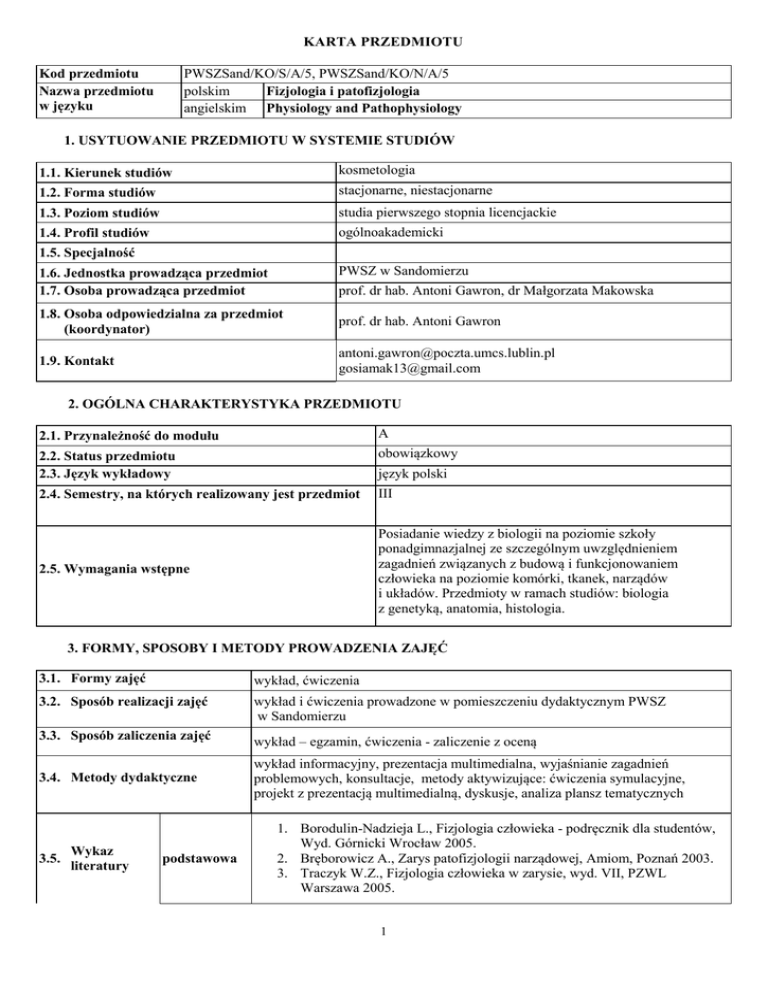 KARTA PRZEDMIOTU PWSZSand/KO/S/A/5, PWSZSand/KO/N/A/5 polskim Fizjologia i patofizjologia angielskim Physiology and Pathophysiology Kod przedmiotu Nazwa przedmiotu w języku 1. USYTUOWANIE PRZEDMIOTU W SYSTEMIE STUDIÓW 1.1. Kierunek studiów kosmetologia 1.2. Forma studiów stacjonarne, niestacjonarne 1.3. Poziom studiów studia pierwszego stopnia licencjackie 1.4. Profil studiów ogólnoakademicki 1.5. Specjalność 1.6. Jednostka prowadząca przedmiot 1.7. Osoba prowadząca przedmiot PWSZ w Sandomierzu prof. dr hab. Antoni Gawron, dr Małgorzata Makowska 1.8. Osoba odpowiedzialna za przedmiot (koordynator) prof. dr hab. Antoni Gawron 1.9. Kontakt [email protected] [email protected] 2. OGÓLNA CHARAKTERYSTYKA PRZEDMIOTU 2.1. Przynależność do modułu A 2.2. Status przedmiotu 2.3. Język wykładowy obowiązkowy 2.4. Semestry, na których realizowany jest przedmiot III 2.5. Wymagania wstępne Posiadanie wiedzy z biologii na poziomie szkoły ponadgimnazjalnej ze szczególnym uwzględnieniem zagadnień związanych z budową i funkcjonowaniem człowieka na poziomie komórki, tkanek, narządów i układów. Przedmioty w ramach studiów: biologia z genetyką, anatomia, histologia. język polski 3. FORMY, SPOSOBY I METODY PROWADZENIA ZAJĘĆ 3.1. Formy zajęć wykład, ćwiczenia 3.2. Sposób realizacji zajęć wykład i ćwiczenia prowadzone w pomieszczeniu dydaktycznym PWSZ w Sandomierzu 3.3. Sposób zaliczenia zajęć wykład – egzamin, ćwiczenia - zaliczenie z oceną 3.4. Metody dydaktyczne wykład informacyjny, prezentacja multimedialna, wyjaśnianie zagadnień problemowych, konsultacje, metody aktywizujące: ćwiczenia symulacyjne, projekt z prezentacją multimedialną, dyskusje, analiza plansz tematycznych 3.5. Wykaz literatury podstawowa 1. Borodulin-Nadzieja L., Fizjologia człowieka - podręcznik dla studentów, Wyd. Górnicki Wrocław 2005. 2. Bręborowicz A., Zarys patofizjologii narządowej, Amiom, Poznań 2003. 3. Traczyk W.Z., Fizjologia człowieka w zarysie, wyd. VII, PZWL Warszawa 2005. 1 uzupełniająca 1. Kawiak J. i in., Podstawy cytofizjologii, PWN Warszawa 1996. 2. McLaughlin D., Stamford J., White D., Krótkie wykłady: Fizjologia człowieka, PWN Warszawa 2009. 3. Kozłowski S., Nazar K., Wprowadzenie do fizjologii klinicznej, PZWL Warszawa 1999. 4. CELE, TREŚCI I EFEKTY KSZTAŁCENIA 4.1. Cele przedmiotu C.1. Przedmiot pozwala nabyć umiejętności i kompetencje dotyczące podstawowych zagadnień z fizjologii ogólnej i elementami cytofizjologii. C.2. Zaznajomienie z mechanizmami regulacji nerwowej i hormonalnej; fizjologią układu ruchu, krążenia; funkcjami fizjologicznymi krwi; mechanizmami oddychania, trawienia i wchłaniania, wydzielania i termoregulacji oraz fizjologią rozrodu. C3. Zapoznanie z pojęciem zdrowia i choroby, mechanizmami odczynu zapalnego, bólu; zaburzeniami procesów gojenia oraz zaburzeniami gospodarki wodno-elektrolitowej i kwasowo-zasadowej; działaniem czynników patogennych; awitaminozami oraz regulacją neurohormonalną. C.4. Przedstawienie procesów starzenia się i regeneracji. 4.2. Treści programowe W odniesieniu do całego organizmu a) podstawy fizjologii ogólnej (homeostaza, metabolizm, katabolizm, anabolizm, reakcje enzymatyczne), b) pojęcie zdrowia i choroby (definicje, w tym wg WHO), c) podstawy cytofizjologii (transport, oddychanie, energetyka, wrażliwość, odżywianie, typy połączeń komórkowych, wydzielanie, mechanizm receptorowy), d) podstawy cytopatologii (starzenie, apoptoza, mechanizm wolnorodnikowy, hypertrofia, hyperplazja, dysplazja, karcinogeneza), e) mechanizmy kontroli nerwowej i hormonalnej (somatyczny i autonomiczny układ nerwowy, układ współczulny i przywspółczulny, oddziaływanie hormonów na komórki, sprzężenia zwrotne w układzie hormonalnym, antagonizm hormonów, rola przysadki, podwzgórza i hormonów tropowych), f) fizjologia układu krążenia i fizjologiczne funkcje krwi, g) fizjologia oddychania w odniesieniu do układu oddechowego i procesów komórkowych (znaczenie klatki piersiowej, mięśni oddechowych, wymiana powietrza w płucach, bariera krew-powietrze, fizjologia pneumocytów, rola surfaktantu), h) fizjologia układu ruchu (skurcz mięśni poprzecznie prążkowanych), i) fizjologia układu pokarmowego (trawienie i wchłanianie pokarmów, rola poszczególnych odcinków układu pokarmowego, funkcjonowanie nabłonka (błony śluzowej) w układzie pokarmowym), j) fizjologia wydalania (podstawy tworzenia moczu, funkcjonowanie nefronu, kontrola działania nerek), k) mechanizmy termoregulacji, l) zaburzenia gospodarki wodno-elektrolitowej i kwasowo-zasadowej m) funkcjonowanie i rola układu rozrodczego (fizjologia narządów rozrodczych, znaczenie hormonów płciowych, cykl owulacyjny a zmiany w organizmie, fizjologia ciąży, wpływ ciąży na organizm). W odniesieniu do skóry a) czynności i funkcje skóry (budowa skóry, termoregulacja, wrażliwość na bodźce, ochrona organizmu, wydalanie, wydzielanie); b) mechanizm odczynu zapalnego (funkcje poszczególnych komórek, znaczenie chemotaksji), c) odczyny alergiczne (anafilaksja), d) ból (podstawy zjawiska bólu, ból związany z czuciem powierzchniowym), e) procesy gojenia (regeneracja, tworzenie się blizny, zaburzenia), f) rola skóry w gospodarce wodno-elektrolitowej i kwasowo-zasadowej (regulacja wydalania potu), g) działanie czynników patogennych (fizyczne - UV, temperatura, promieniowanie jonizujące; chemiczne - kwasy i zasady, metale ciężkie; biologiczne: wirusy, bakterie, grzyby, inne pasożyty), h) awitaminozy i niedobory mikroelementów, i)przyczyny i mechanizmy powstawania zmian nie nowotworowych oraz nowotworów w obrębie skóry (mutacje DNA, znaczenie wirusów HPV i HIV, mięsak Kaposiego, rodzaje zmian łagodnych – znamiona, brodawki, naczyniaki itd.; nowotwory skóry – czerniak i inne) j)substancje stosowane w kosmetyce i ich rola dla skóry. 2 4.3. Efekty kształcenia Student, który zaliczył przedmiot