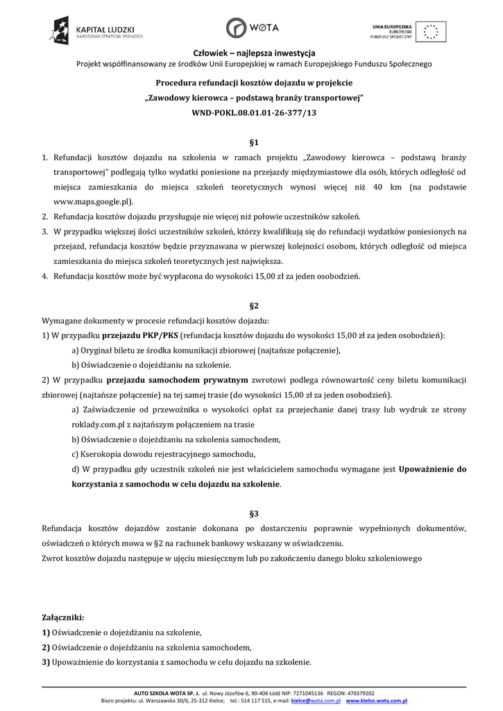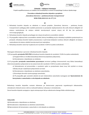Człowiek – najlepsza inwestycja Projekt współfinansowany ze środków Unii Europejskiej w ramach Europejskiego Funduszu Społecznego Procedura refundacji kosztów dojazdu w projekcie „Zawodowy kierowca – podstawą branży transportowej” WND-POKL.08.01.01-26-377/13 §1 1. Refundacji kosztów dojazdu na szkolenia w ramach projektu „Zawodowy kierowca – podstawą branży transportowej” podlegają tylko wydatki poniesione na przejazdy międzymiastowe dla osób, których odległość od miejsca zamieszkania do miejsca szkoleń teoretycznych wynosi więcej niż 40 km (na podstawie www.maps.google.pl). 2. Refundacja kosztów dojazdu przysługuje nie więcej niż połowie uczestników szkoleń. 3. W przypadku większej ilości uczestników szkoleń, którzy kwalifikują się do refundacji wydatków poniesionych na przejazd, refundacja kosztów będzie przyznawana w pierwszej kolejności osobom, których odległość od miejsca zamieszkania do miejsca szkoleń teoretycznych jest największa. 4. Refundacja kosztów może być wypłacona do wysokości 15,00 zł za jeden osobodzień. §2 Wymagane dokumenty w procesie refundacji kosztów dojazdu: 1) W przypadku przejazdu PKP/PKS (refundacja kosztów dojazdu do wysokości 15,00 zł za jeden osobodzień): a) Oryginał biletu ze środka komunikacji zbiorowej (najtańsze połączenie), b) Oświadczenie o dojeżdżaniu na szkolenie. 2) W przypadku przejazdu samochodem prywatnym zwrotowi podlega równowartość ceny biletu komunikacji zbiorowej (najtańsze połączenie) na tej samej trasie (do wysokości 15,00 zł za jeden osobodzień). a) Zaświadczenie od przewoźnika o wysokości opłat za przejechanie danej trasy lub wydruk ze strony roklady.com.pl z najtańszym połączeniem na trasie b) Oświadczenie o dojeżdżaniu na szkolenia samochodem, c) Kserokopia dowodu rejestracyjnego samochodu, d) W przypadku gdy uczestnik szkoleń nie jest właścicielem samochodu wymagane jest Upoważnienie do korzystania z samochodu w celu dojazdu na szkolenie. §3 Refundacja kosztów dojazdów zostanie dokonana po dostarczeniu poprawnie wypełnionych dokumentów, oświadczeń o których mowa w §2 na rachunek bankowy wskazany w oświadczeniu. Zwrot kosztów dojazdu następuje w ujęciu miesięcznym lub po zakończeniu danego bloku szkoleniowego Załączniki: 1) Oświadczenie o dojeżdżaniu na szkolenie, 2) Oświadczenie o dojeżdżaniu na szkolenia samochodem, 3) Upoważnienie do korzystania z samochodu w celu dojazdu na szkolenie. AUTO SZKOŁA WOTA SP. J. ul. Nowy Józefów 6, 90-406 Łódź NIP: 7271045136 REGON: 470379202 Biuro projektu: ul. Warszawska 30/6, 25-312 Kielce; tel.: 514 117 515, e-mail: [email protected] www.kielce.wota.com.pl Człowiek – najlepsza inwestycja Projekt współfinansowany ze środków Unii Europejskiej w ramach Europejskiego Funduszu Społecznego Załącznik 1 .................................................. imię, nazwisko uczestnika szkoleń .................................................. ulica, nr domu ................................................. Miejscowość zamieszkania Odległość w kilometrach pomiędzy miejscowością zamieszkania a miejscem szkoleń - ………….. km OŚWIADCZENIE O DOJEŻDŻANIU NA SZKOLENIE KOMUNIKACJĄ ZBIOROWĄ Niniejszym oświadczam, że w miesiącu ………………..…. 2014 roku dojeżdżałem/-am na szkolenie w ramach projektu pn.: „Zawodowy kierowca – podstawą branży transportowej” publicznymi środkami komunikacji zbiorowej na trasie …………………………….. - Kielce Cena najtańszego biletu PKS lub PKP II klasy w jedną stronę – wynosi na tej trasie ..................... zł. brutto. Lp. 1. 2. 3. 4. 5. 6. 7. 8. Numer biletu Zestawienie wydatków Data Kwota Razem: Kwotę refundacji proszę przelać na konto bankowe o numerze: ............................................................................................................................................................................................................................. ……………………………………………… data i podpis uczestnika szkoleń AUTO SZKOŁA WOTA SP. J. ul. Nowy Józefów 6, 90-406 Łódź NIP: 7271045136 REGON: 470379202 Biuro projektu: ul. Warszawska 30/6, 25-312 Kielce; tel.: 514 117 515, e-mail: [email protected] www.kielce.wota.com.pl Człowiek – najlepsza inwestycja Projekt współfinansowany ze środków Unii Europejskiej w ramach Europejskiego Funduszu Społecznego Załącznik 2 .................................................. imię, nazwisko uczestnika szkoleń .................................................. ulica, nr domu ................................................. Miejscowość zamieszkania Odległość w kilometrach pomiędzy miejscowością zamieszkania a miejscem szkoleń - ………….. km OŚWIADCZENIE O DOJEŻDŻANIU NA SZKOLENIA SAMOCHODEM Niniejszym oświadczam, że w miesiącu ………………………. 2014 roku dojeżdżałem/-am na szkolenie w ramach projektu pt.: „Zawodowy kierowca – podstawą branży transportowej” samochodem prywatnym o numerze rejestracyjnym ......................................................... na trasie ............................................. - Kielce Cena najtańszego biletu PKS lub PKP II klasy w jedną stronę – wynosi na tej trasie ........................... zł. brutto. Wyliczenie kwoty refundacji za dojazdy: …………….. liczba szkoleń w miesiącu x ....................................... jednostkowa kwota refundacji za dojazdy na osobodzień (do 15,00 zł) = ...................................... łącznie zł Kwotę refundacji proszę przelać na konto bankowe o numerze: ............................................................................................................................................................................................................................. ……………………………………………… data i podp
