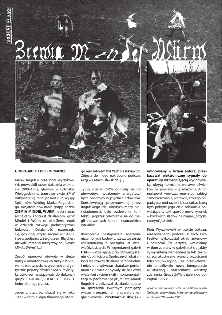 GRUPA AKCJI I PERFORMANCE Marek Rogulski oraz Piotr Wyrzykowski, prowadzili razem działania w okresie 1990–1992, głównie w Gdańsku. Wielogodzinne, transowe akcje ZMW odbywały się m.in. pośród ruin Wyspy Spichrzów. Według Marka Rogulskiego, inicjatora powstania grupy, nazwa ZIEMIA MINDEL WÜRM miała nadać archaiczny kontekst działaniom, gdyż Mindel i Würm to określenia epok w dziejach rozwoju prehistorycznej ludzkości. Działalność rozpoczęła się, gdy obaj artyści nagrali w 1990 r. i we współpracy z Sergiuszem Blajchert utrwalili materiał muzyczny pt: „Ziemia Mindel Würm”. [...] Zespół operował głównie w sferze muzyki niskotonowej, co służyło budowaniu mrocznych, nasyconych energetycznie pejzaży dźwiękowych. Stylistyka utworów nawiązywała do dokonań grupy BAUHAUS, HEAD OF DAVID, industrialnego punka. Jeden z utworów ukazał się w roku 1990 w formie klipu filmowego, które- go realizatorem był Yach Paszkiewicz. Zdjęcia do niego nakręcono podczas akcji w Lasach Oliwskich. [...] Tytuły działań ZMW odnosiły się do pierwotnych poziomów energetycznych obecnych w psychice człowieka. Konsekwencją prezentowanej przez Rogulskiego idei ukrytych mocy nieświadomości, było budowanie kontekstu poprzez odwołanie się do magii pierwotnych kultur i szamańskich rytuałów. Równolegle następowało zderzenie ujawnionych kodów z rzeczywistością wielkomiejską z początku lat dziewięćdziesiątych. W legendarnej galerii C14~~~ działającej przy Stowarzyszeniu Klub Inicjatyw Społecznych obaj artyści realizowali działania samodzielnie i miały one wówczas charakter performances, a więc odbywały się bez owej właściwej akcjom skali i monumentalizacji. W performance pt: „Pulsar”, Marek Rogulski zrealizował działanie oparte na sprzężeniu zwrotnym pomiędzy własnym organizmem a aparaturą nagłośnieniową. Przetwornik dźwięku umocowany w krtani autora, przekazywał elektroniczne sygnały do aparatury wzmacniającej wydobywając ukrytą normalnie warstwę dźwięków na powierzchnię zdarzenia. Autor realizował wówczas non–stop zabieg samobiczowania, w trakcie, którego odpadająca pod razami bicza farba, którą było pokryte jego ciało odsłaniała powstający w taki sposób nowy rysunek – krwawych śladów na nagim, „oczyszczonym” już ciele. Piotr Wyrzykowski w trakcie pokazu, realizowanego podczas II Yach Film Festival wykorzystał układ antenowy i odbiornik TV. Artysta, wmieszany w tłum zebrany w galerii stał się jakby żywą anteną wzmacniającą lub zakłócającą akustyczne sygnały przestrzeni telekomunikacyjnej. To przeskalowanie umożliwiało nową interpretację akustycznej i znaczeniowej warstwy zdarzenia. Grupa ZMW działała do początku 1992 r. opracowanie: fundacja TNS na podstawie tekstu Tadeusza Łukowskiego, który był opublikowany w albumie TNS w roku 2000.