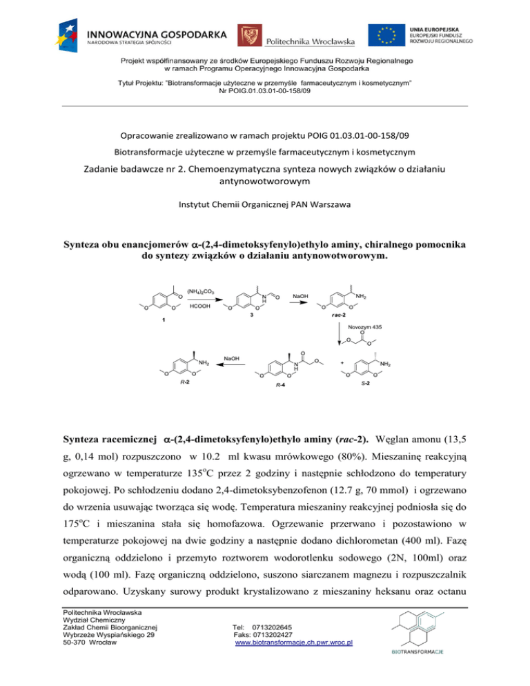 Tytuł Projektu: ”Biotransformacje użyteczne w przemyśle farmaceutycznym i kosmetycznym” Nr POIG.01.03.01-00-158/09 Opracowanie zrealizowano w ramach projektu POIG 01.03.01-00-158/09 Biotransformacje użyteczne w przemyśle farmaceutycznym i kosmetycznym Zadanie badawcze nr 2. Chemoenzymatyczna synteza nowych związków o działaniu antynowotworowym Instytut Chemii Organicznej PAN Warszawa Synteza obu enancjomerów -(2,4-dimetoksyfenylo)ethylo aminy, chiralnego pomocnika do syntezy związków o działaniu antynowotworowym. Synteza racemicznej -(2,4-dimetoksyfenylo)ethylo aminy (rac-2). Węglan amonu (13,5 g, 0,14 mol) rozpuszczono w 10.2 ml kwasu mrówkowego (80%). Mieszaninę reakcyjną ogrzewano w temperaturze 135oC przez 2 godziny i następnie schłodzono do temperatury pokojowej. Po schłodzeniu dodano 2,4-dimetoksybenzofenon (12.7 g, 70 mmol) i ogrzewano do wrzenia usuwając tworząca się wodę. Temperatura mieszaniny reakcyjnej podniosła się do 175oC i mieszanina stała się homofazowa. Ogrzewanie przerwano i pozostawiono w temperaturze pokojowej na dwie godziny a następnie dodano dichlorometan (400 ml). Fazę organiczną oddzielono i przemyto roztworem wodorotlenku sodowego (2N, 100ml) oraz wodą (100 ml). Fazę organiczną oddzielono, suszono siarczanem magnezu i rozpuszczalnik odparowano. Uzyskany surowy produkt krystalizowano z mieszaniny heksanu oraz octanu Politechnika Wrocławska Wydział Chemiczny Zakład Chemii Bioorganicznej Wybrzeże Wyspiańskiego 29 50-370 Wrocław Tel: 0713202645 Faks: 0713202427 www.biotransformacje,ch.pwr.wroc.pl Tytuł Projektu: ”Biotransformacje użyteczne w przemyśle farmaceutycznym i kosmetycznym” Nr POIG.01.03.01-00-158/09 etylu uzyskując 12 g białego produktu ( wydajność 37%). Tak uzyskany surowy produkt poddano od razu następnej reakcji hydrolizy. Zawiesinę amidu 3 (2 g, 9.5 mmol) w roztworze wodorotlenku sodu (2N, 20 ml) ogrzewano do wrzenia przez 4 godziny kontrolując przebieg reakcji metodą chromatografii cienkowarstwowej (TLC). Następnie mieszaninę reakcyjną schłodzono do temperatury pokojowej i dodawano do niej kwas solny do uzyskania pH = 2 i dodano eter etylowy (2 x 50 ml). Fazę organiczną oddzielono a do fazy wodnej i dodawano roztwór wodorotlenku sodu (4N) do uzyskania pH = 13. Fazę wodną poddano ekstrakcji dichlorometanem (2x100 ml) i po oddzieleniu fazy organicznej, rozpuszczalnik organiczny odparowano a surowy produkt oczyszczano przez destylację pod zmniejszonym ciśnieniem (100 – 101oC, 0.1 mm Hg) uzyskując 1 g bezbarwnej racemicznej aminy 2 (wydajność 58%). 1H NMR (200 MHz, CDCl3) 1.44 (d, J = 6.6 Hz, 3H, CH3), 1.72 (s, 2H), 3.86 (s, 3H, OCH3), 3.88 (s, 3H, OCH3), 4.34 (q, J = 6.6 Hz, 1H, -CHPh(CH3)), 6.50 – 6.55 (m, 2H -Ph), 7.26 – 7.31 (m, 1H, -Ph); 13C NMR (50 MHz, CDCl3)23.6, 45.9, 55.5, 55.6, 98.9, 104.0, 126.4, 128.6, 158.0, 159.7. Synteza chemiczna N-[1-(2,4-dimetoksyfenylo)ethylo]-2-metoksyacetamidu (rac-4). Racemiczną aminę 2 (100 mg, 0.55 mmol) rozpuszczono w metoksyoctanie metylu (12 ml, 11 milimola) i ogrzewano do wrzenia przez noc (12 godzin). Następnie mieszaninę reakcyjną schłodzono do temperatury pokojowej i rozcieńczono octanem etylu. Fazę organiczną oddzielono i przemyto kwasem cytrynowym (10%) and solanką, suszono nad siarczanem magnezu i rozpuszczalnik odparowana pod zmniejszonym ciśnieniem uzyskując produkt jako biały proszek (90 mg, wydajność 68%). 1H NMR (200 MHz, CDCl3) 1.51 (d, J = 6.8 Hz, 3H, CH3), 3.45 (s, 3H, -CH2OCH3) 3.85 (s, 3H, OCH3), 3.87 (s, 3H, OCH3), 3.80 – 4.01 (m, 2H, -CH2OCH3) 5.27 – 5.34 (m, 1H, -CHPh(CH3)), 6.46 – 6.54 (m, 2H -Ph), 7.16 – 7.20 (m, 1H, -Ph), 7.43 (bs, NH); 13C NMR (50 MHz, CDCl3)21.9, 46.3, 55.6, 55.6, 59.4, 72.4, 99.5, 104.3, 123.6, 128.6, 158.3, 160.4, 168.4; HR-MS (ESI, [M + Na+] obliczono dla: C13H19NO4Na: 276.1206, znaleziono, 276.1202 m/z; Analiza obliczona dla C13H19NO4: C, 61.64; H, 7.56; N, 5.53; znaleziono: C, 61.50; H, 7.59; N, 5.46; Enzymatyczna synteza N-[1-(2,4-dimetoksyfenylo)ethylo]-2-metoksyacetamidu (4). Racemiczną aminę 2 rozpuszczono w toluenie (20 mg/ml), dodano Novozym 435 (10% Politechnika Wrocławska Wydział Chemiczny Zakład Chemii Bioorganicznej Wybrzeże Wyspiańskiego 29 50-370 Wrocław Tel: 0713202645 Faks: 0713202427 www.biotransformacje,ch.pwr.wroc.pl Tytuł Projektu: ”Biotransformacje użyteczne w przemyśle farmaceutycznym i kosmetycznym” Nr POIG.01.03.01-00-158/09 wagowych), następnie metoksyoctn metylu (3 równoważniki) i pozostawiono na wytrząsarce (48 godzin) w temperatutze pokojowej. Następnie enzym odfiltrowano i fazę organiczną przemyto roztworem kwasu solnego (1N). Fazę organiczną zatężono uzyskując surowy amid 4 []D = +111 (c = 0.50, CHCl3). Reakcję z Novozym 435 wykonano w skali 3 g aminy. Po krystalizacji uzyskano amid o czystości enancjomerycznej ee > 99.9 %. Synteza (S)--(2,4-dimetoksyfenylo)ethylo aminy (S-2). Do fazy wodnej z poprzedniego eksperymentu dodano roztwór wodorotlenko sodu (4N) do uzyskania pH = 13 i mieszaninę ekstrahowano dichlorometanem ( 2 x 50 ml). Fazy organiczne połączono, suszono (MgSO4) i po odparowaniu rozpuszczalnika destylowano pod zmniejszonym ciśnieniem uzyskując aminę o []D = -17 (c = 0.85, CHCl3). W celu wyznaczenia wartości nadmiaru enancjomerycznego aminę traktowano bezwodnikiem octowym (2 równoważniki) w dichlorometanie przez dwie godziny. Następnie mieszaninę reakcyjną rozcieńczono tym samym rozpuszczalnikiem, przemyto kwasem solnym (1N), suszono (MgSO4). Po odparowaniu rozpuszczalnika surowy produkt analizowano metodą HPLC stwierdzając jego wysoką czystość enancjomeryczną (ee > 99%). Synteza (R)--(2,4-dimetoksyfenylo)ethylo aminy (R-2). Amid R-4 (1 g) zawieszono w roztworze wodorotlenku sodu (4N NaOH, 8 mL) w glikolu etylowym (2 ml). Mieszane reakcyjna ogrzewano do wrzenia przez 18 godzin, schłodzono do temperatury pokojowej i wlano do dichlorometanu (50 ml). Uzyskany roztwór przemyto pr
