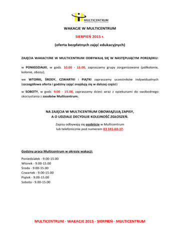 WAKACJE W MULTICENTRUM SIERPIEŃ 2015 r. (oferta bezpłatnych zajęć edukacyjnych) ZAJĘCIA WAKACYJNE W MULTICENTRUM ODBYWAJĄ SIĘ W NASTĘPUJĄCYM PORZĄDKU: w PONIEDZIAŁKI, w godz. 10.00 - 15.00, zapraszamy grupy zorganizowane (półkolonie, kolonie, obozy); we WTORKI, ŚRODY, CZWARTKI i PIĄTKI zapraszamy uczestników indywidualnych (szczegółowa oferta i godziny zajęć znajdują się w dalszej części) w SOBOTY, w godz. 9.00 - 15.00, zapraszamy dzieci wraz z opiekunami do swobodnego skorzystania z zasobów Multicentrum; NA ZAJĘCIA W MULTICENTRUM OBOWIĄZUJĄ ZAPISY, A O UDZIALE DECYDUJE KOLEJNOŚĆ ZGŁOSZEŃ. Zapisy odbywają się osobiście w Multicentrum lub telefonicznie pod numerem 83 341-60-17. Godziny pracy Multicentrum w okresie wakacji: Poniedziałek - 9.00-15.00 Wtorek - 9.00-15.00 Środa - 9.00-15.00 Czwartek - 9.00-15.00 Piątek - 9.00-15.00 Sobota - 9.00-15.00 MULTICENTRUM - WAKACJE 2015 - SIERPIEŃ - MULTICENTRUM 1.08.2015 (SOBOTA) SWOBODNE KORZYSTANIE Z ZASOBÓW MULTICENTRUM I TYDZIEŃ 4.08.2015 (WTOREK) 10.00-11.00 - dzieci powyżej 7 lat MULTIMUZYKA – „Gry i zabawy muzyczne – tablica” 11.00-12.00 - dzieci w wieku powyżej 7 lat KLOCKI K’NEX – „Niesamowite konstrukcje” 12.00-13.00 - dzieci w wieku powyżej 12 lat MULTITECHNIKA – „Manipulator - jak działa i do czego służy to urządzenie?” 5.08.2015 (ŚRODA) 10.00-11.00 - dzieci powyżej 8 lat MULTIMUZYKA – „Świat instrumentów i muzyków” 11.00-12.00 - dzieci w wieku powyżej 7 lat MULTINAUKA – „Magnesy w naszym otoczeniu” 12.00-13.00 - dzieci w wieku powyżej 9 lat MULTITECHNIKA – „W fabryce samochodów” 6.08.2015 (CZWARTEK) 10.00-11.00 - dzieci powyżej 8 lat MULTIMUZYKA – „Podstawy programowania muzyki za pomocą programu E-Jay” 11.00-12.00 - dzieci w wieku powyżej 7 lat MULTINAUKA – „Zielona energia” 12.00-13.00 - dzieci w wieku powyżej 9 lat MULTITECHNIKA – „Jak działa elektrownia wodna?” MULTICENTRUM - WAKACJE 2015 - SIERPIEŃ - MULTICENTRUM 7.08.2015 (PIĄTEK) 10.00-11.00 - dzieci powyżej 8 lat MULTIMUZYKA – „Tworzymy własną piosenkę – E-Jay” 11.00-12.00 - dzieci w wieku powyżej 7 lat MULTINAUKA – „Jak powstaje prąd?” 12.00-13.00 - dzieci w wieku powyżej 9 lat MULTITECHNIKA – „Co segregujemy? - automatyczne sortowanie” 8.08.2015 (SOBOTA) SWOBODNE KORZYSTANIE Z ZASOBÓW MULTICENTRUM II TYDZIEŃ 11.08.2015 (WTOREK) 10.00-11.00 - dzieci powyżej 8 lat MULTIMUZYKA – „Realizacja nagrań dźwiękowych za pomocą programu Cubase podstawy” 11.00-12.00 - dzieci w wieku powyżej 7 lat MULTINAUKA – „Jak naelektryzować ciało?” 12.08.2015 (ŚRODA) 10.00-11.00 - dzieci powyżej 8 lat MULTIMUZYKA – „E-Jay - programowanie muzyki Dance” 11.00-12.00 - dzieci w wieku powyżej 7 lat MULTINAUKA – „Kolor i światło” 13.08.2015 (CZWARTEK) 10.00-11.00 - dzieci powyżej 7 lat MULTIMUZYKA – „Muzyczne kino w stylu DISCO cz.1” MULTICENTRUM - WAKACJE 2015 - SIERPIEŃ - MULTICENTRUM 11.00-12.00 - dzieci w wieku powyżej 7 lat MULTINAUKA – „Odkrywamy tajemnice dźwięku” 14.08.2015 (PIĄTEK) 10.00-11.00 - dzieci powyżej 7 lat MULTIMUZYKA – „Muzyczne kino w stylu DISCO cz.2” 11.00-12.00 - dzieci w wieku powyżej 7 lat LOGIKIT – „Wiatrak - zbuduj i uruchom” III TYDZIEŃ 18.08.2015 (WTOREK) 10.00-11.00 - dzieci powyżej 8 lat MULTIMUZYKA – „Reklamówka - tworzymy reklamę radiową” 11.00-13.00 - dzieci w wieku powyżej 9 lat ROBOTY LEGO – warsztaty (dzień pierwszy) 12.00-13.00 - dzieci w wieku powyżej 7 lat MULTISZTUKA – „Vincent bez ucha” 19.08.2015 (ŚRODA) 10.00-11.00 - dzieci powyżej 8 lat MULTIMUZYKA – „Muzyka filmowa - praca z programem E-jay oraz Cubase” 11.00-13.00 - dzieci w wieku powyżej 9 lat ROBOTY LEGO – warsztaty (dzień drugi) 12.00-13.00 - dzieci w wieku powyżej 7 lat MULTISZTUKA – „Odkrywamy Białą” MULTICENTRUM - WAKACJE 2015 - SIERPIEŃ - MULTICENTRUM 20.08.2015 (CZWARTEK) 10.00-11.00 - dzieci powyżej 7 lat MULTIMUZYKA – „Muzyczne kino cz. 1” 11.00-13.00 - dzieci w wieku powyżej 9 lat ROBOTY LEGO – warsztaty (dzień trzeci) 12.00-13.00 - dzieci w wieku powyżej 7 lat MULTISZTUKA – „Rytm i kompozycja” 21.08.2015 (PIĄTEK) 10.00-11.00 - dzieci powyżej 7 lat MULTIMUZYKA – „Muzyczne kino cz. 2” 11.00-13.00 - dzieci w wieku powyżej 9 lat ROBOTY LEGO – warsztaty (dzień czwarty) 12.00-13.00 - dzieci w wieku powyżej 7 lat MULTISZTUKA – „Mobile” 22.08.2015 (SOBOTA) SWOBODNE KORZYSTANIE Z ZASOBÓW MULTICENTRUM IV TYDZIEŃ 25.08.2015 (WTOREK) 10.00-12.00 - dzieci w wieku powyżej 9 lat ROBOTY LEGO – warsztaty (dzień pierwszy) 12.00-13.00 - dzieci w wieku powyżej 7 lat MULTISZTUKA – „Cirkus” MULTICENTRUM - WAKACJE 2015 - SIERPIEŃ - MULTICENTRUM 26.08.2015 (ŚRODA) 10.00-12.00 - dzieci w wieku powyżej 9 lat ROBOTY LEGO – warsztaty (dzień drugi) 12.00-13.00 - dzieci w wieku powyżej 7 lat MULTISZTUKA – „Moje wyjątkowe imię” 27.08.2015 (CZWARTEK) 10.00-12.00 - dzieci w wieku powyżej 9 lat ROBOTY LEGO – warsztaty (dzień trzeci) 12.00-13.00 - dzieci w wieku powyżej 7 lat MULTISZTUKA – „Wesoły filmik” 28.08.2015 (PIĄTEK) 10.00-12.00 - dzieci w wieku powyżej 9 lat ROBOTY LEGO – warsztaty (dzień czwarty) 12.00-13.00 - dzieci w wieku powyżej 7 lat MULTISZTUKA – „Smok dla św. Michała” 29.08.2015 (SOBOTA) SWOBODNE KORZYSTANIE Z ZASOBÓW MULTICENTRUM MULTICENTRUM - WAKACJE 2015 - SIERPIEŃ - MULTICENTRUM