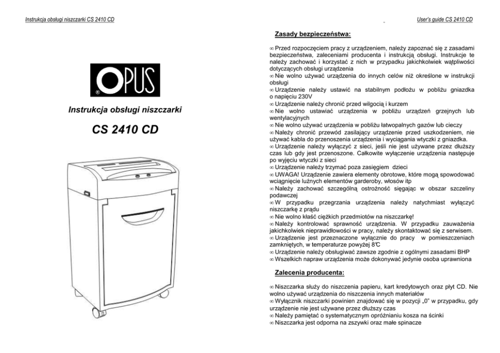 Instrukcja obsługi niszczarki CS 2410 CD User’s guide CS 2410 CD Zasady bezpieczeństwa: Instrukcja obsługi niszczarki CS 2410 CD • Przed rozpoczęciem pracy z urządzeniem, należy zapoznać się z zasadami bezpieczeństwa, zaleceniami producenta i instrukcją obsługi. Instrukcje te należy zachować i korzystać z nich w przypadku jakichkolwiek wątpliwości dotyczących obsługi urządzenia • Nie wolno używać urządzenia do innych celów niż określone w instrukcji obsługi • Urządzenie należy ustawić na stabilnym podłożu w pobliżu gniazdka o napięciu 230V • Urządzenie należy chronić przed wilgocią i kurzem • Nie wolno ustawiać urządzenia w pobliżu urządzeń grzejnych lub wentylacyjnych • Nie wolno używać urządzenia w pobliżu łatwopalnych gazów lub cieczy • Należy chronić przewód zasilający urządzenie przed uszkodzeniem, nie używać kabla do przenoszenia urządzenia i wyciągania wtyczki z gniazdka. • Urządzenie należy wyłączyć z sieci, jeśli nie jest używane przez dłuższy czas lub gdy jest przenoszone. Całkowite wyłączenie urządzenia następuje po wyjęciu wtyczki z sieci • Urządzenie należy trzymać poza zasięgiem dzieci • UWAGA! Urządzenie zawiera elementy obrotowe, które mogą spowodować wciągnięcie luźnych elementów garderoby, włosów itp • Należy zachować szczególną ostrożność sięgając w obszar szczeliny podawczej • W przypadku przegrzania urządzenia należy natychmiast wyłączyć niszczarkę z prądu • Nie wolno kłaść ciężkich przedmiotów na niszczarkę! • Należy kontrolować sprawność urządzenia. W przypadku zauważenia jakichkolwiek nieprawidłowości w pracy, należy skontaktować się z serwisem. • Urządzenie jest przeznaczone wyłącznie do pracy w pomieszczeniach zamkniętych, w temperaturze powyżej 8°C • Urządzenie należy obsługiwać zawsze zgodnie z ogólnymi zasadami BHP • Wszelkich napraw urządzenia może dokonywać jedynie osoba uprawniona Zalecenia producenta: • Niszczarka służy do niszczenia papieru, kart kredytowych oraz płyt CD. Nie wolno używać urządzenia do niszczenia innych materiałów • Wyłącznik niszczarki powinien znajdować się w pozycji „0” w przypadku, gdy urządzenie nie jest używane przez dłuższy czas • Należy pamiętać o systematycznym opróżnianiu kosza na ścinki • Niszczarka jest odporna na zszywki oraz małe spinacze Instrukcja obsługi niszczarki CS 2410 CD User’s guide CS 2410 CD UWAGA! Nie stosowanie się do powyższych zaleceń może doprowadzić do utraty gwarancji Obsługa niszczarki: • Urządzenie należy ustawić na stabilnej i równej powierzchni. • Przed podłączeniem do sieci, należy upewnić się, że przełącznik główny znajduję się w pozycji „0”. Budowa urządzenia: • Ustaw główny przełącznik w pozycji „I” → zapala się zielona dioda gotowości do pracy. • Włóż papier do szczeliny podawczej. UWAGA! Papier należy wprowadzać w środek szczeliny, po wprowadzeniu papieru niszczarka automatycznie rozpoczyna pracę. Max szerokość papieru to 230mm, jeśli kartki, które chcemy zniszczyć są szersze, należy je przyciąć lub złożyć do odpowiedniego rozmiaru. Jednorazowo można niszczyć do 10 kartek papieru 80g/m². 1 – szczelina na płyty CD 9 – kosz 2 – szczelina na karty plastikowe 10 – Forward (uruchamia noże, po 3 – szczelina na papier wciśnięciu, noże obracają się w przód) 4 – przełącznik główny 11 - Reverse (pozwala na wycofanie 5 – kabel zasilania 6 – kółka 7 – obudowa 8 – kosz na ścinki z CD zaciętego papieru ze szczeliny podawczej) 12 – Diody sygnalizujące: otwarcie drzwi, zapełnienie kosza, przegrzanie silnika, tryb pracy Instrukcja obsługi niszczarki CS 2410 CD • Urządzenie niszczy także karty kredytowe i płyty CD – niszczarka posiada specjalną szczelinę podawczą na te materiały. Jednorazowo można niszczyć 1 płytę CD lub 1 kartę kredytową. Nie można jednocześnie niszczyć papieru i płyt (karty). Nie wolno wkładać płyt CD i kart do szczeliny przeznaczonej do niszczenia papieru, a papieru w szczelinie do niszczenia płyt. • Po zakończeniu niszczenia, należy ustawić główny przełącznik w pozycji „O” • W przypadku zacięcia papieru należy wyciągnąć papier i wcisnąć przycisk „FWD” aby resztki papieru zostały zniszczone lub wcisnąć przycisk „REV” aby wyciągnąć zacięty papier → jeśli nie rozwiąże to problemu, należy wyłączyć urządzenie z zasilania i skontaktować się z punktem serwisowym. User’s guide CS 2410 CD Możliwe nieprawidłowości działania: Niesprawność Przyczyna Po włożeniu papieru do szczeliny, niszczarka nie rozpoczyna pracy 1. Niszczarka nie jest prawidłowo podłączona do sieci 2. Kartki przeznaczone do niszczenia są zbyt cienkie 3. Przegrzanie silnika 4. Zacięcie papieru 5. Kosz nie jest całkowicie wsunięty Urządzenie nie przestaje pracować po zakończeniu niszczenia Niszczarka pracuje zbyt głośno Czujnik w szczelinie podawczej jest pokryty resztkami papieru. Czyszczenie: • Przed przystąpieniem do czyszczenia niszczarki należy upewnić się, że włącznik główny znajduje się w pozycji „0” , a wtyczka jest wyciągnięta z gniazda zasilającego. • Kiedy kosz jest przepełniony, należy wyciągnąć go z urządzenia w celu opróżnienia ze ścinków. Przepełniony kosz może powodować problemu z wprowadzaniem kartek do szczeliny podawczej. Należy regularnie opróżniać kosz na ścinki. • Czyszczenie obudowy – zabrudzoną obudowę należy przetrzeć miękką ściereczką nasączoną wodą lub delikatnym detergentem. Nie wolno zanurzać urządzenia w wodzie. Nie używać benzenu, alkoholu, rozpuszczalnika do farb czy benzyny – użycie tych środków może spowodować trwałe zniszczenie obudowy. Konserwacja: • Przed przystąpieniem do konserwacji niszczarki należy odłączyć urządzenie o