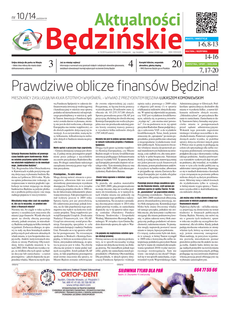nr 10/14 październik MIASTO / INWESTYCJE 1-6, 8-13 nr 10/2014 październik (1254) miesięcznik egz. bezpłatny Unijna dotacja dla parku na Warpiu – blisko dwa miliony dla miasta dzięki dofinansowaniu unijnemu 3 Już za miesiąc wybory! Informacja o numerach oraz granicach stałych i odrębnych obwodów głosowania, siedzibach obwodowych komisji wyborczych na terenie Gminy Będzin 4 nakład: 27.000 egz. ISSN 1233-5223 Komplet kibiców, wspaniała atmosfera, głośny doping – MKS Banimex Będzin gra w Pluslidze 20 KULTURA / ROZRYWKA 14-16 TURYSTYKA / SPORT / EKOLOGIA 7, 17-20 Prawdziwe oblicze finansów Będzina! MIESZKAŃCY ZASŁUGUJĄ NA KILKA ISTOTNYCH WYJAŚNIEŃ... – WYWIAD Z PREZYDENTEM BĘDZINA ŁUKASZEM KOMONIEWSKIM wę Funduszu Spójności w zakresie dofinansowania inwestycji wodociągowej i kanalizacyjnej w mieście oraz sprawę podatku od nieruchomości od największego przedsiębiorcy w mieście tj. spółki Tauron. Inwestycja z Funduszu Spójności została dawno wykonana, niestety nie jest do dziś rozliczona, a Komisja Europejska ma istotne wątpliwości, co do dwóch aspektów dotyczącej tej inwestycji. A co za tym idzie, ważą się losy kilkunastu, kilkudziesięciu milionów złotych w budżecie miasta na przyszłe lata. Sytuacja finansowa Będzina od pewnego czasu budziła spore kontrowersje. Wydana ostatnio pozytywna opinia RIO rozwiewa właściwie wątpliwości co do ewentualnego „bankructwa Będzina”. Tak, Regionalna Izba Obrachunkowa w Katowicach wydała pozytywną opinię dotyczącą wykonania budżetu Będzina za I półrocze 2014 roku. Wydana opinia jednoznacznie wskazuje, że rozpuszczane w mieście pogłoski i spekulacje na temat stojącego na skraju bankructwa Będzina są jedynie plotkami o podłożu politycznym i nie mają żadnego poparcia w rzeczywistości. Mieszkańcy mogą więc czuć się uspokojeni. Ale czy to wszystko, co powinni wiedzieć o finansach miasta? Niestety nie, bo ciągle w toku są dwie sprawy o zasadniczym znaczeniu dla miasta i jego finansów. Wynik obu tych spraw na chwilę obecną pozostaje otwarty, jednak uważam, że mieszkańcy Będzina zasługują na kilka istotnych wyjaśnień. Zwłaszcza dlatego, że sprawy te stały się tłem brutalnych ataków politycznych pod adresem aktualnych władz miasta, w tym bezpośrednio mojej osoby. Ataków motywowanych strachem ze strony Platformy Obywatelskiej, która rządziła miastem w latach 2002-2010. Strach ten wynika z tego, że źródłem obu tych spraw są błędne decyzje lub zaniechania – a nawet przestępstwa – jakich dopuściła się poprzednia władza. Mam tu na myśli sprareklama Warto spytać o przyczynę tego zagrożenia. – Geneza dzisiejszej sytuacji jest złożona. Z jednej strony przestępstwo popełnione przez jednego z naczelników za czasów prezydentury Radosława Barana. Po drugie zaniechanie należytego zarządzania inwestycją przez tego właśnie prezydenta. Przestępstwo... To ostre słowa! Mogę dzisiaj mówić otwarcie o przestępstwie, albowiem fakt ten został stwierdzony prawomocnym wyrokiem skazującym. Chodzi o to, że w związku z realizacją projektu doszło w 2004 roku do fałszowania dokumentów planowanej inwestycji. Fakt przestępstwa został wykryty jeszcze w 2005 roku. Sprawa kar na jest już przeszłością. Do załatwienia pozostaje jednak kwestia, na ile fakt popełnienia tego przestępstwa ma wpływ na końcowe rozliczenie projektu. Tutaj wątpliwości powziął Europejski Urząd ds. Zwalczania Nadużyć Finansowych, tzw. OLAF. Urząd ten utworzony został przez Komisję Europejską specjalnie w celu zwalczania korupcji i nadużyć budżetu Unii. Prowadzi on w tej sprawie od kilku lat postępowanie. Na wiosennym spotkaniu w Brukseli z Komisją Europejską, w którym uczestniczyłem osobiście, otrzymałem informację, że sprawa ta jeszcze jest w toku. Na chwilę obecną nie jestem w stanie podać żadnych szczegółów. Jeżeli jednak OLAF uzna, że fakt popełnienia przestępstwa miał istotne znaczenie dla sprawy, to Miasto Będzin zostanie zobowiązane do zwrotu odpowiedniej jej części. Przypomnę, że łączna kwota pomocy wynosiła prawie 20 milionów euro, tj. obecnie ok. 83.235.317,00 złotych. Sprawa prowadzona przez OLAF jest przyczyną, dla której do chwili obecnej Komisja Europejska nie rozliczyła projektu oraz nie przekazała należnej gminie kwoty ostatniej transzy pomocy w wysokości kilku milionów złotych (707.448,85 euro). Niestety nie jest to jedyna sprawa otwarta w ramach rozliczenia projektu z Funduszu Spójności. Drugą z tych spraw są istotne wątpliwości Komisji Europejskiej, czy Miasto Będzin mogło w koszty kwalifikowane inwestycji podlegające dofinansowaniu zaliczyć wydatki VAT. Tę sprawę Komisja Europejska prowadzi dopiero od zeszłego roku. Tym niemniej dotyczy ona faktur z lat 2005–2009, czyli okresu prezydentury Radosława Barana. Chodzi tutaj zapewne o niełatwe zagadnienia prawne. To prawda, ale analiza materiałów z lat 2005-2009, jaką przeprowadzono na moje zlecenie, daje mi wszelkie podstawy do twierdzenia, że w tamtych latach władze miasta nie pokusiły się o rozpoznanie tego problemu z należytą starannością. Na szczęście z posiadanej zleconej przez miasto w 2014 roku opinii prawnej wynika, że zaniechania dopuściły się w tej sprawie także organy centralne (Narodowy Fundusz Ochrony Środowiska i Gospodarki Wodnej, Ministerstwo Rozwoju Regionalnego). W związku z tym Gmina Będzin skierowała sprawę do sądu w Warszawie. I tu pojawia się nagłaśniana ostatnio sprawa obsługi prawnej. Dzisiaj zarzuca mi się rękoma prokuratury, że w sposób niezasadny wydaję większe niż dotychczas kwoty na obsługę prawną. Nie musiałbym jednak tego robić, gdyby nie zaniechania moich poprzedników z Platformy Obywatelskiej. Dla przykładu, w aktach sprawy dotyczącej Funduszu Spójności widnieje reklama opinia radcy prawnego z 2009 roku o objętości pół strony (!) w spra