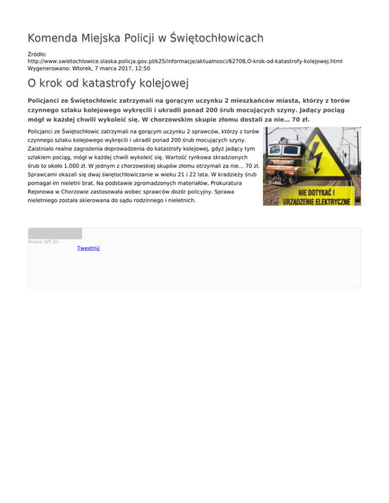 Komenda Miejska Policji w Świętochłowicach Źródło: http://www.swietochlowice.slaska.policja.gov.pl/k25/informacje/aktualnosci/62708,O-krok-od-katastrofy-kolejowej.html Wygenerowano: Wtorek, 7 marca 2017, 12:50 O krok od katastrofy kolejowej Policjanci ze Świętochłowic zatrzymali na gorącym uczynku 2 mieszkańców miasta, którzy z torów czynnego szlaku kolejowego wykręcili i ukradli ponad 200 śrub mocujących szyny. Jadący pociąg mógł w każdej chwili wykoleić się. W chorzowskim skupie złomu dostali za nie… 70 zł. Policjanci ze Świętochłowic zatrzymali na gorącym uczynku 2 sprawców, którzy z torów czynnego szlaku kolejowego wykręcili i ukradli ponad 200 śrub mocujących szyny. Zaistniało realne zagrożenia doprowadzenia do katastrofy kolejowej, gdyż jadący tym szlakiem pociąg, mógł w każdej chwili wykoleić się. Wartość rynkowa skradzionych śrub to około 1.000 zł. W jednym z chorzowskiej skupów złomu otrzymali za nie… 70 zł. Sprawcami okazali się dwaj świętochłowiczanie w wieku 21 i 22 lata. W kradzieży śrub pomagał im nieletni brat. Na podstawie zgromadzonych materiałów, Prokuratura Rejonowa w Chorzowie zastosowała wobec sprawców dozór policyjny. Sprawa nieletniego została skierowana do sądu rodzinnego i nieletnich. Ocena: 0/5 (0) Tweetnij