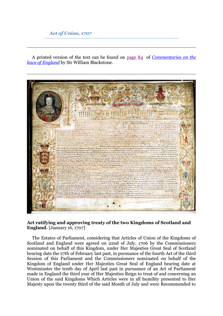 Act of Union, 1707 A printed version of the text can be found on page 84 of Commentaries on the laws of England by Sir William Blackstone. Act ratifying and approving treaty of the two Kingdoms of Scotland and England. [January 16, 1707] The Estates of Parliament, considering that Articles of Union of the Kingdoms of Scotland and England were agreed on 22nd of July, 1706 by the Commissioners nominated on behalf of this Kingdom, under Her Majesties Great Seal of Scotland bearing date the 27th of February last past, in pursuance of the fourth Act of the third Session of this Parliament and the Commissioners nominated on behalf of the Kingdom of England under Her Majesties Great Seal of England bearing date at Westminster the tenth day of April last past in pursuance of an Act of Parliament made in England the third year of Her Majesties Reign to treat of and concerning an Union of the said Kingdoms Which Articles were in all humility presented to Her Majesty upon the twenty third of the said Month of July and were Recommended to this Parliament by Her Majesties Royal Letter of the date the 31st day of July, 1706; and that the said Estates of Parliament have agreed to, and approve of the said Articles of Union, with some additions. And that the said Estates of Parliament have agreed to and approve of the said Articles of Union with some Additions and Explanations as is contained in the Articles hereafter insert And sicklyke Her Majesty with advice and consent of the Estates of Parliament Resolving to Establish the Protestant Religion and Presbyterian Church Government within this Kingdom has past in this Session of Parliament an Act entituled Act for secureing of the Protestant Religion and Presbyterian Church Government which by the Tenor thereof is appointed to be insert in any Act ratifying the Treaty and expressly declared to be a fundamentall and essentiall Condition of the said Treaty or Union in all time coming. Therefore Her Majesty with advice and consent of the Estates of Parliament in fortification of the Approbation of the Articles as above mentioned And for their further and better Establishment of the same upon full and mature deliberation upon the forsaids Articles of Union and Act of Parliament Doth Ratifie Approve and Confirm the same with the Additions and Explanations contained in the saids Articles in manner and under the provision aftermentioned whereof the Tenor follows. Article 1 (name of the new kingdom) That the Two Kingdoms of Scotland and England, shall upon the 1st May next ensuing the date hereof, and forever after, be United into One Kingdom by the Name of GREAT BRITAIN: And that the Ensigns Armorial of the said United Kingdom be such as Her Majesty shall think fit, and used in all Flags, Banners, Standards and Ensigns both at Sea and Land. Article 2 (succession to the throne) That the Succession to the Monarchy of the United Kingdom of Great Britain and of the Dominions thereunto belonging after Her Most Sacred Majesty, and in default of Issue of Her Majesty be, remain and continue to the Most Excellent Princess Sophia Electoress and Dutchess Dowager of Hanover, and the Heirs of Her body, being Protestants, upon whom the Crown of England is settled by an Act of Parliament made in England in the twelth year of the Reign of His late Majesty King William the Third entituled An Act for the further Limitation of the Crown and better securing the Rights and Liberties of the Subject; And that all Papists and persons marrying Papists, shall be excluded from and forever incapable to inherit possess or enjoy the Imperial Crown of Great Britain, and the Dominions thereunto belonging or any part thereof; And in every such case the Crown and Government shall from time to time descend to, and be enjoyed by such person being a Protestant as should have inherited and enjoyed the same, in case such Papists or person marrying a Papist was naturally dead, according to the provision for the Descent of the Crown of England, made by another Act of Parliament in England in the first year of the Reign of their late Majesties King William and Queen Mary entituled an Act declaring the Rights and Liberties of the Subject, and settling the Succession of the Crown. Article 3 (united parliament) That the United Kingdom of Great Britain be Represented by one and the same Parliament, to be stiled the Parliament of Great Britain. Article 4 (equal privileges of subjects) That the Subjects of the United Kingdom of Great Britain shall from and after the Union have full Freedom and Intercourse of Trade and Navigation to and from any port or place within the said United Kingdom and the Dominions and Plantations thereunto belonging. And that there be a Communication of all other Rights, Privileges and Advantages which do or may belong to the Subjects of either Kingdom except where it is otherwayes expressly agreed in these Articles. Article 5 (ships) That all ships or vessels belonging to Her Majesties Subjects of Scotland at the time of Ratifying the Treaty of Union of the Two Kingdoms in the Parliament of Scotland though foreign built be deemed and pass as ships of the build of Great Britain; the Owner or where there are more Owners, one or more of the Owners within Twelve Months after the first of May next making oath that at the time of Ratifying the Treaty of Union in the Parliament of Scotland, the same did in haill or in part belong to him or them, or to some other Subject of Subjects of Scotland, to be particularly named with the place of their respective abodes, and that the same doth then at the time of the said Deposition wholly belong to him or them, and that no forreigner directly or indirectly hath any share part or interest therein, Which Oath shall be made before the chief Officer or Officers of the Customs in the Port next to the abode of the said Owner or Owners; And the said Officer or Officers shall be Impowered to administer the said Oath, And the Oath being so administred shal