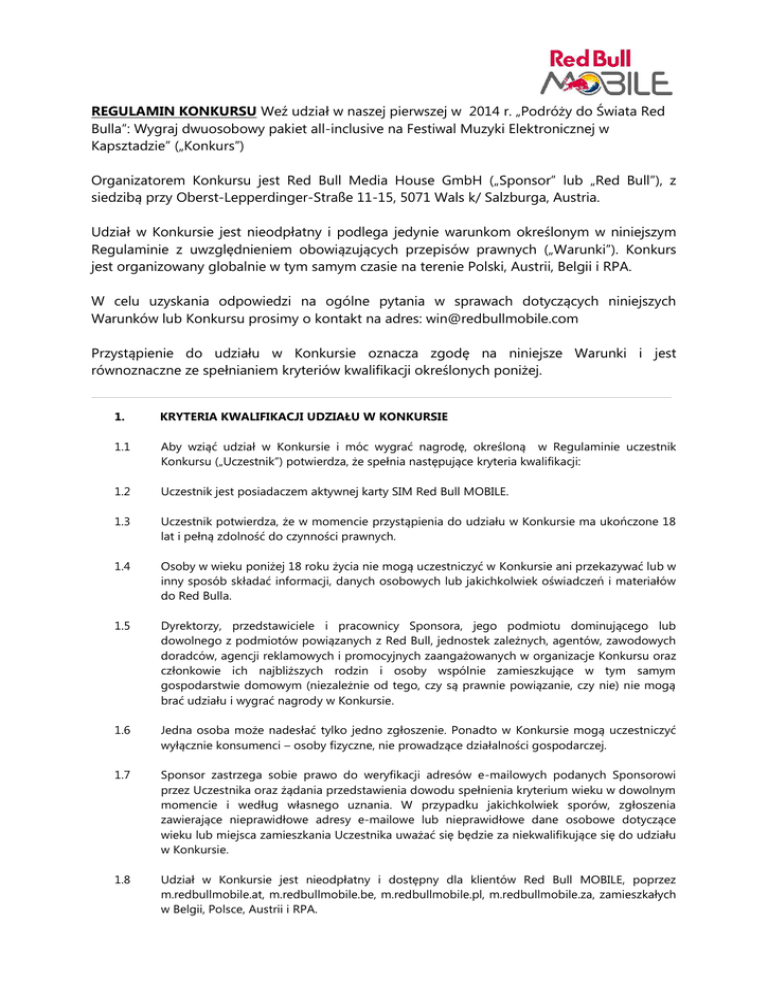 REGULAMIN KONKURSU Weź udział w naszej pierwszej w 2014 r. „Podróży do Świata Red Bulla”: Wygraj dwuosobowy pakiet all-inclusive na Festiwal Muzyki Elektronicznej w Kapsztadzie” („Konkurs”) Organizatorem Konkursu jest Red Bull Media House GmbH („Sponsor” lub „Red Bull”), z siedzibą przy Oberst-Lepperdinger-Straße 11-15, 5071 Wals k/ Salzburga, Austria. Udział w Konkursie jest nieodpłatny i podlega jedynie warunkom określonym w niniejszym Regulaminie z uwzględnieniem obowiązujących przepisów prawnych („Warunki”). Konkurs jest organizowany globalnie w tym samym czasie na terenie Polski, Austrii, Belgii i RPA. W celu uzyskania odpowiedzi na ogólne pytania w sprawach dotyczących niniejszych Warunków lub Konkursu prosimy o kontakt na adres: [email protected] Przystąpienie do udziału w Konkursie oznacza zgodę na niniejsze Warunki i jest równoznaczne ze spełnianiem kryteriów kwalifikacji określonych poniżej. 1. KRYTERIA KWALIFIKACJI UDZIAŁU W KONKURSIE 1.1 Aby wziąć udział w Konkursie i móc wygrać nagrodę, określoną w Regulaminie uczestnik Konkursu („Uczestnik”) potwierdza, że spełnia następujące kryteria kwalifikacji: 1.2 Uczestnik jest posiadaczem aktywnej karty SIM Red Bull MOBILE. 1.3 Uczestnik potwierdza, że w momencie przystąpienia do udziału w Konkursie ma ukończone 18 lat i pełną zdolność do czynności prawnych. 1.4 Osoby w wieku poniżej 18 roku życia nie mogą uczestniczyć w Konkursie ani przekazywać lub w inny sposób składać informacji, danych osobowych lub jakichkolwiek oświadczeń i materiałów do Red Bulla. 1.5 Dyrektorzy, przedstawiciele i pracownicy Sponsora, jego podmiotu dominującego lub dowolnego z podmiotów powiązanych z Red Bull, jednostek zależnych, agentów, zawodowych doradców, agencji reklamowych i promocyjnych zaangażowanych w organizacje Konkursu oraz członkowie ich najbliższych rodzin i osoby wspólnie zamieszkujące w tym samym gospodarstwie domowym (niezależnie od tego, czy są prawnie powiązanie, czy nie) nie mogą brać udziału i wygrać nagrody w Konkursie. 1.6 Jedna osoba może nadesłać tylko jedno zgłoszenie. Ponadto w Konkursie mogą uczestniczyć wyłącznie konsumenci – osoby fizyczne, nie prowadzące działalności gospodarczej. 1.7 Sponsor zastrzega sobie prawo do weryfikacji adresów e-mailowych podanych Sponsorowi przez Uczestnika oraz żądania przedstawienia dowodu spełnienia kryterium wieku w dowolnym momencie i według własnego uznania. W przypadku jakichkolwiek sporów, zgłoszenia zawierające nieprawidłowe adresy e-mailowe lub nieprawidłowe dane osobowe dotyczące wieku lub miejsca zamieszkania Uczestnika uważać się będzie za niekwalifikujące się do udziału w Konkursie. 1.8 Udział w Konkursie jest nieodpłatny i dostępny dla klientów Red Bull MOBILE, poprzez m.redbullmobile.at, m.redbullmobile.be, m.redbullmobile.pl, m.redbullmobile.za, zamieszkałych w Belgii, Polsce, Austrii i RPA. 2. OKRES KONKURSU 2.1 Konkurs rozpoczyna się o godz. 00:01 w dniu 19.12.2013 r. i kończy się o godz. 23:59 w dniu 17.01.2014 r. 2.2 Zgłoszenia otrzymane przez Red Bull w innym okresie, niż wskazany wyżej nie będą uwzględniane i nie będą dawać żadnych uprawnień do udziału w Konkursie na mocy niniejszych Warunków. 3. ZASADY UDZIAŁU 3.1 Uczestnik na terenie Rzeczypospolitej Polskiej rejestruje się do udziału w Konkursie poprzez Red Bull MOBILE ZONE dostępną przez urządzenia mobilne pod adresem www.redbullmobile.pl. 3.2 Żeby wziąć udział w konkursie uczestnik musi udzielić odpowiedzi na wszystkie 3 pytania znajdujące się w formularzu konkursowym na Red Bull MOBILE ZONE. 3.3 Dostęp do formularza konkursowego w Red Bull MOBILE ZONE jest możliwy tylko wtedy, gdy połączenie internetowe w urządzeniu mobilnym jest nawiązane przez aktywną kartę SIM Red Bull MOBILE. 3.4 Wypełnione w całości formularze konkursowe będą oceniane przez jury, wybrane przez Red Bull. Zwycięzców w każdym kraju, w którym organizowany jest Konkurs wybierze jury. Tylko stosując się do opisanej procedury Uczestnik ma prawo zwyciężenia w Konkursie 4. PROCES SELEKCJI 4.1 Aby wybrać zwycięzcę, jury zdecyduje, które z 3 odpowiedzi na pytania konkursowe są najlepsze. 4.2 Red Bull zobowiązuje się dołożyć starań, by zapewnić odpowiednią pracę sprzętu i oprogramowania przeznaczonego do obsługi Konkursu i nie odpowiada za: zgłoszenia spóźnione, zagubione, uszkodzone, wysłane na błędny adres, niekompletne, nieczytelne lub zniekształcone; uszkodzenia, awarie, opóźnienia lub trudności w działaniu telefonów, sprzętu elektronicznego, oprogramowania, sieci, internetu lub komputera; błędy w transmisji; wysłane lecz nieodebrane zawiadomienia o wygranej; wszelkie straty poniesione przez dowolną osobę, która zgłasza się lub próbuje się zgłosić do Konkursu, wynikające z zagubienia zgłoszenia, niezłożenia zgłoszenia, błędnego przetworzenia zgłoszenia lub braku wygranej, chyba że któreś z tych zdarzeń nastąpiło z winy umyślnej Red Bull. 4.3 Zgłoszenia spóźnione, nieczytelne, niekompletne, zniekształcone lub uszkodzone nie będą przyjmowane. 4.4 W przypadku dyskwalifikacji Uczestnika z jakiegokolwiek powodu Red Bull nie ma obowiązku upublicznienia tego faktu. 4.5 Dane kontaktowe podane w przez Uczestnika zgłoszeniu do Konkursu zostaną wykorzystane do zawiadomienia o ewentualnej nagrodzie, więc należy upewnić się, że są poprawne. 5. NAGRODY 5.1 Nagrodą w Konkursie jest jeden dwuosobowy pakiet all-inclusive na Festiwal Muzyki Elektronicznej w Kapsztadzie na dany kraj (Belgia, Polska, Austria i RPA). Nagroda obejmuje wszelkie niezbędne wizy, bilety lotnicze w klasie ekonomicznej w obie strony z międzynarodowego portu lotniczego w kraju zwycięzcy, bilety na Festiwal Muzyki Elektronicznej w Kapsztadzie w dniach 6-11 lutego 2014 r. dla dwóch osób oraz zakwaterowanie na 5 nocy w pokoju dwuosobowym ze śn