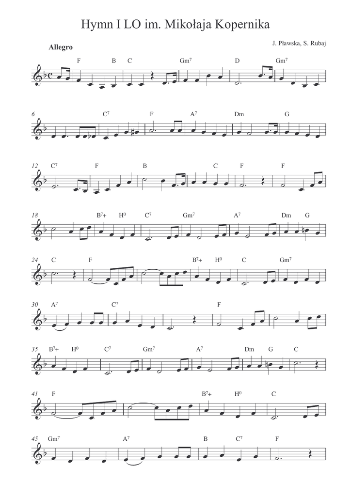 Hymn I LO im. Mikołaja Kopernika J. Pławska, S. Rubaj Allegro F C B Gm7 D Gm7 C7 6 F A7 12 C7 F 24 C 30 B7+ H0 A7 B7+ 41 F Gm7 Gm7 A7 C Gm7 Dm H0 B G C B7+ A7 F G 45 C7 H0 Dm B7+ F A7 C7 H0 F Gm7 35 C7 G F Dm C 18 B C7 C F