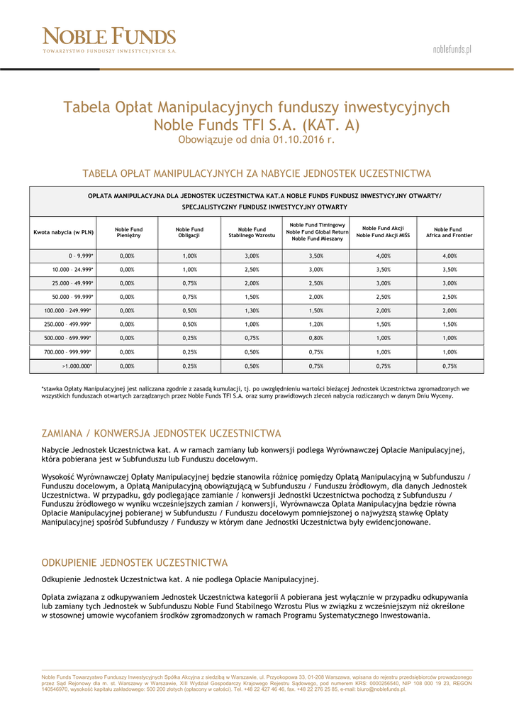 Tabela Opłat Manipulacyjnych funduszy inwestycyjnych Noble Funds TFI S.A. (KAT. A) Obowiązuje od dnia 01.10.2016 r. TABELA OPŁAT MANIPULACYJNYCH ZA NABYCIE JEDNOSTEK UCZESTNICTWA OPŁATA MANIPULACYJNA DLA JEDNOSTEK UCZESTNICTWA KAT.A NOBLE FUNDS FUNDUSZ INWESTYCYJNY OTWARTY/ SPECJALISTYCZNY FUNDUSZ INWESTYCYJNY OTWARTY Kwota nabycia (w PLN) Noble Fund Pieniężny Noble Fund Obligacji Noble Fund Stabilnego Wzrostu Noble Fund Timingowy Noble Fund Global Return Noble Fund Mieszany Noble Fund Akcji Noble Fund Akcji MIŚS Noble Fund Africa and Frontier 0 – 9.999* 0,00% 1,00% 3,00% 3,50% 4,00% 4,00% 10.000 – 24.999* 0,00% 1,00% 2,50% 3,00% 3,50% 3,50% 25.000 – 49.999* 0,00% 0,75% 2,00% 2,50% 3,00% 3,00% 50.000 – 99.999* 0,00% 0,75% 1,50% 2,00% 2,50% 2,50% 100.000 – 249.999* 0,00% 0,50% 1,30% 1,50% 2,00% 2,00% 250.000 – 499.999* 0,00% 0,50% 1,00% 1,20% 1,50% 1,50% 500.000 – 699.999* 0,00% 0,25% 0,75% 0,80% 1,00% 1,00% 700.000 – 999.999* 0,00% 0,25% 0,50% 0,75% 1,00% 1,00% >1.000.000* 0,00% 0,25% 0,50% 0,75% 0,75% 0,75% *stawka Opłaty Manipulacyjnej jest naliczana zgodnie z zasadą kumulacji, tj. po uwzględnieniu wartości bieżącej Jednostek Uczestnictwa zgromadzonych we wszystkich funduszach otwartych zarządzanych przez Noble Funds TFI S.A. oraz sumy prawidłowych zleceń nabycia rozliczanych w danym Dniu Wyceny. ZAMIANA / KONWERSJA JEDNOSTEK UCZESTNICTWA Nabycie Jednostek Uczestnictwa kat. A w ramach zamiany lub konwersji podlega Wyrównawczej Opłacie Manipulacyjnej, która pobierana jest w Subfunduszu lub Funduszu docelowym. Wysokość Wyrównawczej Opłaty Manipulacyjnej będzie stanowiła różnicę pomiędzy Opłatą Manipulacyjną w Subfunduszu / Funduszu docelowym, a Opłatą Manipulacyjną obowiązującą w Subfunduszu / Funduszu źródłowym, dla danych Jednostek Uczestnictwa. W przypadku, gdy podlegające zamianie / konwersji Jednostki Uczestnictwa pochodzą z Subfunduszu / Funduszu źródłowego w wyniku wcześniejszych zamian / konwersji, Wyrównawcza Opłata Manipulacyjna będzie równa Opłacie Manipulacyjnej pobieranej w Subfunduszu / Funduszu docelowym pomniejszonej o najwyższą stawkę Opłaty Manipulacyjnej spośród Subfunduszy / Funduszy w którym dane Jednostki Uczestnictwa były ewidencjonowane. ODKUPIENIE JEDNOSTEK UCZESTNICTWA Odkupienie Jednostek Uczestnictwa kat. A nie podlega Opłacie Manipulacyjnej. Opłata związana z odkupywaniem Jednostek Uczestnictwa kategorii A pobierana jest wyłącznie w przypadku odkupywania lub zamiany tych Jednostek w Subfunduszu Noble Fund Stabilnego Wzrostu Plus w związku z wcześniejszym niż określone w stosownej umowie wycofaniem środków zgromadzonych w ramach Programu Systematycznego Inwestowania. Noble Funds Towarzystwo Funduszy Inwestycyjnych Spółka Akcyjna z siedzibą w Warszawie, ul. Przyokopowa 33, 01-208 Warszawa, wpisana do rejestru przedsiębiorców prowadzonego przez Sąd Rejonowy dla m. st. Warszawy w Warszawie, XIII Wydział Gospodarczy Krajowego Rejestru Sądowego, pod numerem KRS: 0000256540, NIP 108 000 19 23, REGON 140546970, wysokość kapitału zakładowego: 500 200 złotych (opłacony w całości). Tel. +48 22 427 46 46, fax. +48 22 276 25 85, e-mail: [email protected].