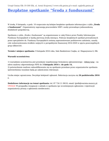 Urząd Gminy Ełk 19-300 Ełk, ul. Armii Krajowej 3 www.elk.gmina.pl e-mail: [email protected] Bezpłatne spotkanie "Środa z funduszami" W środę, 9 listopada, o godz. 10 rozpocznie się kolejne bezpłatne spotkanie informacyjne z cyklu „Środa z funduszami”. Organizatorzy zapraszają pracowników MŚP i osoby prowadzące jednoosobową działalność gospodarczą. Spotkania z cyklu „Środa z funduszami” są organizowane w całej Polsce przez Punkty Informacyjne Funduszy Europejskich w każdą pierwszą środę miesiąca. Podczas bezpłatnych spotkań prowadzonych przez specjalistów ds. Funduszy Europejskich zostaną zaprezentowane podstawowe założenia, zasady, cele wykorzystywania środków unijnych w perspektywie finansowej 2014-2020 w ujęciu poszczególnych grup odbiorców. Termin i miejsce spotkania: 9 listopada 2016 roku, Sale Bankietowe Czajka, ul. Magazynowa 6, Ełk Warunki uczestnictwa: 1) warunkiem uczestnictwa jest przesłanie wypełnionego formularza zgłoszeniowego – kliknij tutaj – na adres mailowy odpowiedniego PIFE do 3 listopada 2016 r. do godz 14, 2) potwierdzenie mailowe zakwalifikowania się na spotkanie przesłane przez organizatorów spotkania (potwierdzenia wysyłane będą po zakończeniu rekrutacji). Liczba miejsc ograniczona. Decyduje kolejność zgłoszeń. Rekrutacja zaczyna się 26 października 2016 r. Dodatkowe informacje na temat spotkania: tel. 87 734 11 09/10, email: [email protected]. UWAGA! W przypadku rezygnacji z udziału w spotkaniu (po wcześniejszym zgłoszeniu i rejestracji) organizatorzy proszą o zgłoszeniu nieobecności.
