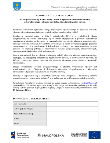 Wyznaczenie obszaru zdegradowanego i obszaru rewitalizacji Formularz zgłaszania uwag FORMULARZ ZGŁASZANIA UWAG do projektu uchwały Rady Gminy Lubień w sprawie wyznaczenia obszaru zdegradowanego i obszaru rewitalizacji na terenie gminy Lubień Formularz umożliwia zgłoszenie uwag dotyczących wyznaczonego w projekcie uchwały obszaru zdegradowanego i obszaru rewitalizacji na terenie gminy Lubień. Zgodnie z zapisami ustawy z dnia 9 października 2015 r. o rewitalizacji, obszar zdegradowany to obszar znajdujący się w stanie kryzysowym z powodu koncentracji negatywnych zjawisk społecznych, w szczególności bezrobocia, ubóstwa, przestępczości, niskiego poziomu edukacji lub kapitału społecznego, a także niewystarczającego poziomu uczestnictwa w życiu publicznym i kulturalnym, cechujący się występowaniem na nim ponadto co najmniej jednego z negatywnych zjawisk gospodarczych, środowiskowych, przestrzenno-funkcjonalnych lub technicznych. Obszar rewitalizacji jest to obszar obejmujący całość lub część obszaru zdegradowanego, cechujący się szczególną koncentracją negatywnych zjawisk, o których mowa powyżej, na którym z uwagi na istotne znaczenie dla rozwoju lokalnego gmina zamierza prowadzić rewitalizację. Proces wyznaczania obszaru zdegradowanego i obszaru rewitalizacji opisany jest w dokumencie pn. „Diagnoza i delimitacja obszarów zdegradowanych i obszarów rewitalizacji”, będącym załącznikiem do projektu uchwały. Prosimy o zapoznanie się z projektem uchwały oraz „Diagnozą i delimitacją obszaru zdegradowanego i obszaru rewitalizacji” oraz zgłaszanie uwag i komentarzy do ich zapisów. Wypełnione formularze prosimy przesłać na adres poczty elektronicznej [email protected] (z dopiskiem "Formularz zgłaszania uwag") lub złożyć na dzienniku podawczym Urzędu Gminy Lubień (Lubień 50) w godzinach pracy Urzędu w nieprzekraczalnym terminie do dnia 25 listopada 2016 r. INFORMACJE O ZGŁASZAJĄCYM Imię i nazwisko Instytucja (jeśli dotyczy) Adres do korespondencji E-mail Tel/fax Wyznaczenie obszaru zdegradowanego i obszaru rewitalizacji Formularz zgłaszania uwag Mieszkaniec gminy: Mieszkaniec obszaru wybranego do rewitalizacji Mieszkaniec gminy spoza obszaru wybranego do rewitalizacji Jednostka samorządu terytorialnego Informacja dotycząca składającego formularz Przedsiębiorca prowadzący działalność na obszarze Proszę zaznaczyć znakiem X wybranym do rewitalizacji odpowiednią rubrykę Przedsiębiorca prowadzący działalność poza obszarem wybranym do rewitalizacji Organizacja pozarządowa prowadząca działalność na obszarze wybranym do rewitalizacji Organizacja pozarządowa prowadząca działalność poza obszarem wybranym do rewitalizacji Inny (jaki?) ………………………………………. ZGŁOSZONE UWAGI/SUGESTIE DO DOKUMENTU Część dokumentu, do którego zgłoszona jest uwaga (fragment oraz strona dokumentu) Treść uwagi / sugestii Dziękujemy za wypełnienie formularza Uzasadnienie uwagi / sugestii