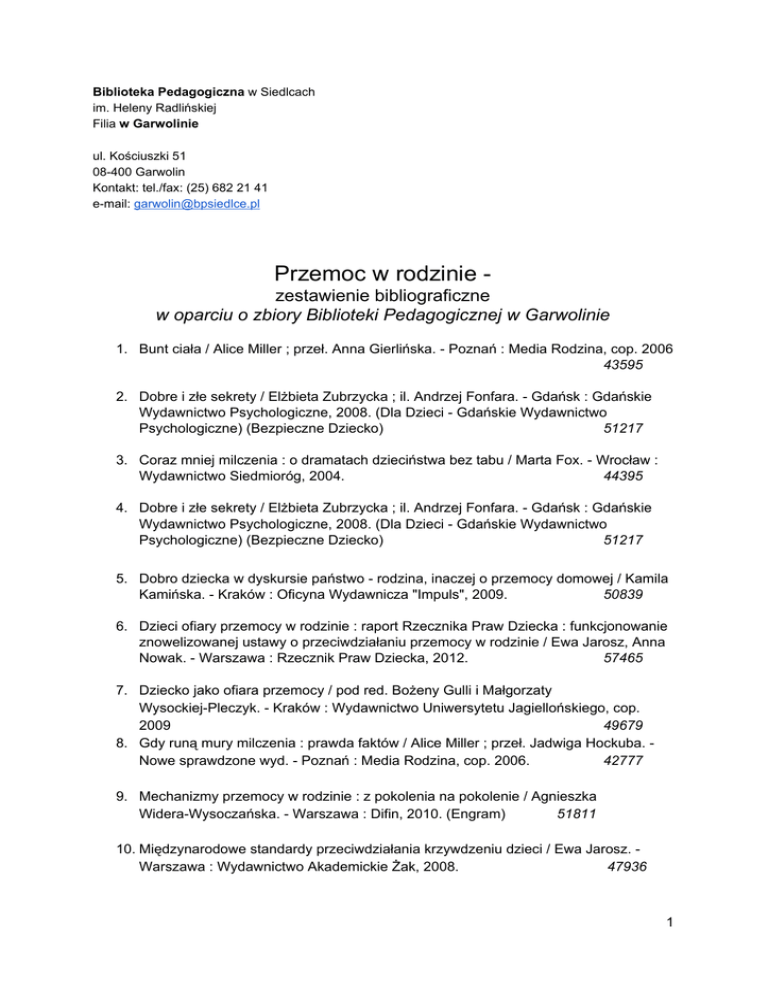 Biblioteka Pedagogiczna w Siedlcach im. Heleny Radlińskiej Filia w Garwolinie ul. Kościuszki 51 08400 Garwolin Kontakt: tel./fax: (25) 682 21 41 email: [email protected] Przemoc w rodzinie zestawienie bibliograficzne w oparciu o zbiory Biblioteki Pedagogicznej w Garwolinie 1. Bunt ciała / Alice Miller ; przeł. Anna Gierlińska. Poznań : Media Rodzina, cop. 2006 43595 2. Dobre i złe sekrety / Elżbieta Zubrzycka ; il. Andrzej Fonfara. Gdańsk : Gdańskie Wydawnictwo Psychologiczne, 2008. (Dla Dzieci Gdańskie Wydawnictwo Psychologiczne) (Bezpieczne Dziecko) 51217 3. Coraz mniej milczenia : o dramatach dzieciństwa bez tabu / Marta Fox. Wrocław : Wydawnictwo Siedmioróg, 2004. 44395 4. Dobre i złe sekrety / Elżbieta Zubrzycka ; il. Andrzej Fonfara. Gdańsk : Gdańskie Wydawnictwo Psychologiczne, 2008. (Dla Dzieci Gdańskie Wydawnictwo Psychologiczne) (Bezpieczne Dziecko) 51217 5. Dobro dziecka w dyskursie państwo rodzina, inaczej o przemocy domowej / Kamila Kamińska. Kraków : Oficyna Wydawnicza "Impuls", 2009. 50839 6. Dzieci ofiary przemocy w rodzinie : raport Rzecznika Praw Dziecka : funkcjonowanie znowelizowanej ustawy o przeciwdziałaniu przemocy w rodzinie / Ewa Jarosz, Anna Nowak. Warszawa : Rzecznik Praw Dziecka, 2012. 57465 7. Dziecko jako ofiara przemocy / pod red. Bożeny Gulli i Małgorzaty WysockiejPleczyk. Kraków : Wydawnictwo Uniwersytetu Jagiellońskiego, cop. 2009 49679 8. Gdy runą mury milczenia : prawda faktów / Alice Miller ; przeł. Jadwiga Hockuba. Nowe sprawdzone wyd. Poznań : Media Rodzina, cop. 2006. 42777 9. Mechanizmy przemocy w rodzinie : z pokolenia na pokolenie / Agnieszka WideraWysoczańska. Warszawa : Difin, 2010. (Engram) 51811 10. Międzynarodowe standardy przeciwdziałania krzywdzeniu dzieci / Ewa Jarosz. Warszawa : Wydawnictwo Akademickie Żak, 2008. 47936 1 11. Patologie zachowań społecznych : rzeczywistość przełomu wieków XX i XXI : rodzina dysfunkcyjna, przemoc / red. nauk. Krystyna DymekBalcerek. Wyd. 3 zm. Radom : Politechnika Radomska, 2000. 43691 12. Przeciwdziałanie przemocy domowej / Jerzy Mellibruda. Warszawa : Instytut Psychologii Zdrowia PTP, cop. 2009 50530 13. Przeciwdziałanie przemocy w rodzinie : prawo i praktyka / Jarosław Polanowski ; Państwowa Agencja Rozwiązywania Problemów Alkoholowych. Warszawa : Wydawnictwo Edukacyjne Parpamedia, 2008 50194 14. Przemoc w rodzinie : interwencja kryzysowa i psychoterapia / Wanda BaduraMadej, Agnieszka DobrzyńskaMesterhazy. Kraków : Wydawnictwo Uniwersytetu Jagiellońskiego, 2000. 56887 15. Przemoc w rodzinie / Katarzyna Michalska, Dorota JaszczakKuźminska. Warszawa : Państwowa Agencja Rozwiązywania Problemów Alkoholowych : Wydawnictwo Edukacyjne Parpamedia, 2007. (Biblioteka Profesjonalisty PARPA) 48328 16. Przemoc w rodzinie : psychoterapia sprawców i ofiar / Cloe Madanes ; przekł. Anna Rozwadowska. Wyd. 2. Gdańsk : Gdańskie Wydaw. Psychologiczne, 2002. (Na Ratunek) 38864 17. Przemoc w rodzinie : teoria i rzeczywistość / Jadwiga Mazur. Warszawa : Żak, 2002 38927 18. Przemoc w rodzinie : zapobieganie w świetle przepisów prawa / Maria Stożek. Warszawa : Instytut Psychologii Zdrowia. Polskie Towarzystwo Psychologiczne, 2009 49512 19. Przemoc w rodzinie wobec dziecka jako czynnik społecznopedagogicznego nieprzystosowania uczniów. T. 1, Teoretyczne i empiryczne aspekty badań przemocy wobec dziecka w rodzinie / Zofia Brańka. Kraków : TEXT, 2006. 47340 20. Przemoc w rodzinie wobec dziecka jako czynnik społecznopedagogicznego nieprzystosowania uczniów. T. 2, Wpływ przemocy w rodzinie wobec dziecka na społecznopedagogiczne nieprzystosowanie uczniów / Zofia Brańka. Kraków : TEXT, 2006. 47341 21. Przemoc w wychowaniu : między prawnym zakazem a społeczną akceptacją : monitoring Rzecznika Praw Dziecka / Ewa Jarosz ; recenzja naukowa Barbara SmolińskaTheiss, Krystyna MarzecHolka. Warszawa : Biuro Rzecznika Praw Dziecka, 2015. (Biblioteka Rzecznika Praw Dziecka) 57464 2 22. Przemoc w wychowaniu rodzinnym / Jolanta Maćkowicz. Kraków : Oficyna Wydawnicza Impuls, 2009. 48954 23. Psychologiczne uwarunkowania przemocy w rodzinie : charakterystyka sprawców / Danuta Rode. Katowice : Wydawnictwo Uniwersytetu Śląskiego, 2010.(Prace Naukowe Uniwersytetu Śląskiego w Katowicach 02086336 ; nr 2758) 51022 24. Trudne dzieciństwo i rodzicielstwo : książka dla nauczycieli, wychowawców i rodziców / Aleksandra Maciarz. Warszawa : Wydawnictwo Akademickie Żak, cop. 2009 48966 25. Twoje ocalone życie / Alice Miller ; przeł. Jadwiga Hockuba. Poznań : Harbor Point Media Rodzina, cop. 2009 48968 26. Zanim będzie za późno : przemoc i kontrola w rodzinie / Robert J. Ackerman, Susan E. Pickering ; przekł. Monika Gajdzińska. Gdańsk : Gdańskie Wydawnictwo Psychologiczne, 2002. (Na Ratunek) 39107 27. Zespół dziecka maltretowanego : diagnostyka medyczna / Alina Margolis. Wyd. 2. Warszawa : Fundacja Dzieci Niczyje ; Paris : Medecins du Monde, 2000. 45523 28. Zniszczone dzieciństwo / Shy Keenan ; tł. Marta Komorowska. Warszawa : Hachette Polska, cop. 2010. (Pisane przez Życie ) 50442 oprac. na podstawie zbiorów Biblioteki Pedagogicznej w Garwolinie Joanna Rosek, Grażyna Witak Garwolin, 16.03.2016 r. Serdecznie zapraszamy poniedziałekpiątek godz. 918 sob. godz. 915 3