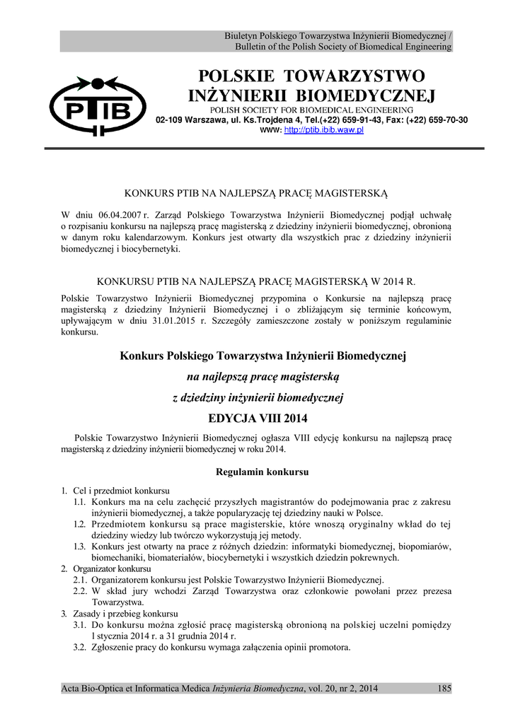 Biuletyn Polskiego Towarzystwa Inżynierii Biomedycznej / Bulletin of the Polish Society of Biomedical Engineering KONKURS PTIB NA NAJLEPSZĄ PRACĘ MAGISTERSKĄ W dniu 06.04.2007 r. Zarząd Polskiego Towarzystwa Inżynierii Biomedycznej podjął uchwałę o rozpisaniu konkursu na najlepszą pracę magisterską z dziedziny inżynierii biomedycznej, obronioną w danym roku kalendarzowym. Konkurs jest otwarty dla wszystkich prac z dziedziny inżynierii biomedycznej i biocybernetyki. KONKURSU PTIB NA NAJLEPSZĄ PRACĘ MAGISTERSKĄ W 2014 R. Polskie Towarzystwo Inżynierii Biomedycznej przypomina o Konkursie na najlepszą pracę magisterską z dziedziny Inżynierii Biomedycznej i o zbliżającym się terminie końcowym, upływającym w dniu 31.01.2015 r. Szczegóły zamieszczone zostały w poniższym regulaminie konkursu. Konkurs Polskiego Towarzystwa Inżynierii Biomedycznej na najlepszą pracę magisterską z dziedziny inżynierii biomedycznej EDYCJA VIII 2014 Polskie Towarzystwo Inżynierii Biomedycznej ogłasza VIII edycję konkursu na najlepszą pracę magisterską z dziedziny inżynierii biomedycznej w roku 2014. Regulamin konkursu 1. Cel i przedmiot konkursu 1.1. Konkurs ma na celu zachęcić przyszłych magistrantów do podejmowania prac z zakresu inżynierii biomedycznej, a także popularyzację tej dziedziny nauki w Polsce. 1.2. Przedmiotem konkursu są prace magisterskie, które wnoszą oryginalny wkład do tej dziedziny wiedzy lub twórczo wykorzystują jej metody. 1.3. Konkurs jest otwarty na prace z różnych dziedzin: informatyki biomedycznej, biopomiarów, biomechaniki, biomateriałów, biocybernetyki i wszystkich dziedzin pokrewnych. 2. Organizator konkursu 2.1. Organizatorem konkursu jest Polskie Towarzystwo Inżynierii Biomedycznej. 2.2. W skład jury wchodzi Zarząd Towarzystwa oraz członkowie powołani przez prezesa Towarzystwa. 3. Zasady i przebieg konkursu 3.1. Do konkursu można zgłosić pracę magisterską obronioną na polskiej uczelni pomiędzy l stycznia 2014 r. a 31 grudnia 2014 r. 3.2. Zgłoszenie pracy do konkursu wymaga załączenia opinii promotora. Acta Bio-Optica et Informatica Medica Inżynieria Biomedyczna, vol. 20, nr 2, 2014 185 Biuletyn Polskiego Towarzystwa Inżynierii Biomedycznej / Bulletin of the Polish Society of Biomedical Engineering 3.3. Dopuszczalne jest zgłaszanie prac zbiorowych, mających więcej niż jednego autora. 3.4. Zgłoszenie należy przesłać na adres PTIB: Warszawa 02-109, ul. Ks. Trojdena 4. Wersję elektroniczną pracy magisterskiej należy przesłać na adres [email protected] lub wraz ze zgłoszeniem na adres PTIB. 3.5. Termin nadsyłania prac upływa 31 stycznia 2015 r. 3.6. Jury w ocenie prac uwzględni w szczególności: oryginalność pracy, jej zawartość merytoryczną, możliwość praktycznego wykorzystania w medycynie zaprezentowanego rozwiązania, dobór piśmiennictwa, strukturę pracy, poprawność terminologii i języka, stronę redakcyjną zgłoszonego tekstu. 3.7. Wyniki konkursu zostaną ogłoszone przed 31 marca 2015 r. na stronie internetowej PTIB, http://ptib.ibib.waw.pl 3.8. Na stronie tej można znaleźć niniejszy regulamin. 4. Nagrody i wyróżnienia 4.1. Autorzy najlepszych prac otrzymają nagrody pieniężne lub rzeczowe. O podziale nagród i wyróżnień decyduje jury konkursu. 4.2. Uroczyste wręczenie nagród odbędzie się na specjalnym zebraniu Zarządu PTIB, w ramach którego nagrodzeni autorzy będą też mieli okazję do przedstawienia swoich prac. 4.3. Za zgodą autorów, nagrodzone prace będą opublikowane na stronie internetowej PTIB. Pliki do pobrania: Regulamin konkursu Formularz zgłoszeniowy (W formacie PDF - *.pdf) Formularz zgłoszeniowy (W formacie Word - *.docx) Krzysztof Jakub Pałko IBIB PAN Warszawa Acta Bio-Optica et Informatica Medica Inżynieria Biomedyczna, vol. 20, nr 2, 2014 186