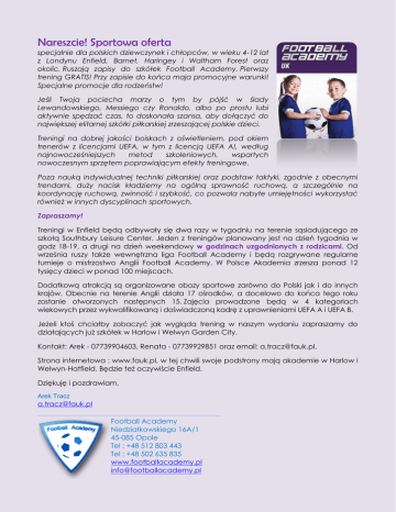 Nareszcie! Sportowa oferta specjalnie dla polskich dziewczynek i chłopców, w wieku 4-12 lat z Londynu Enfield, Barnet, Haringey i Waltham Forest oraz okolic. Ruszają zapisy do szkółek Football Academy. Pierwszy trening GRATIS! Przy zapisie do końca maja promocyjne warunki! Specjalne promocje dla rodzeństw! Jeśli Twoja pociecha marzy o tym by pójść w ślady Lewandowskiego, Messiego czy Ronaldo, albo po prostu lubi aktywnie spędzać czas, to doskonała szansa, aby dołączyć do największej elitarnej szkółki piłkarskiej zrzeszającej polskie dzieci. Treningi na dobrej jakości boiskach z oświetleniem, pod okiem trenerów z licencjami UEFA, w tym z licencją UEFA A!, według najnowocześniejszych metod szkoleniowych, wspartych nowoczesnym sprzętem poprawiającym efekty treningowe. Poza nauką indywidualnej techniki piłkarskiej oraz podstaw taktyki, zgodnie z obecnymi trendami, duży nacisk kładziemy na ogólną sprawność ruchową, a szczególnie na koordynację ruchową, zwinność i szybkość, co pozwala nabyte umiejętności wykorzystać również w innych dyscyplinach sportowych. Zapraszamy! Treningi w Enfield będą odbywały się dwa razy w tygodniu na terenie sąsiadującego ze szkołą Southbury Leisure Center. Jeden z treningów planowany jest na dzień tygodnia w godz 18-19, a drugi na dzień weekendowy w godzinach uzgodnionych z rodzicami. Od września ruszy także wewnętrzna liga Football Academy i będą rozgrywane regularne turnieje o mistrzostwo Anglii Football Academy. W Polsce Akademia zrzesza ponad 12 tysięcy dzieci w ponad 100 miejscach. Dodatkową atrakcją są organizowane obozy sportowe zarówno do Polski jak i do innych krajów. Obecnie na terenie Anglii działa 17 ośrodków, a docelowo do końca tego roku zostanie otworzonych następnych 15. Zajęcia prowadzone będą w 4 kategoriach wiekowych przez wykwalifikowaną i doświadczoną kadrę z uprawnieniami UEFA A i UEFA B. Jeżeli ktoś chciałby zobaczyć jak wygląda trening w naszym wydaniu zapraszamy do działających już szkółek w Harlow i Welwyn Garden City. Kontakt: Arek - 07739904603, Renata - 07739929851 oraz email: [email protected]. Strona internetowa : www.fauk.pl, w tej chwili swoje podstrony mają akademie w Harlow i Welwyn-Hatfield. Będzie też oczywiście Enfield. Dziękuję i pozdrawiam, Arek Tracz [email protected] ______________________________________________ Football Academy Niedziałkowskiego 16A/1 45-085 Opole Tel : +48 512 803 443 Tel : +48 502 635 835 www.footballacademy.pl [email protected]