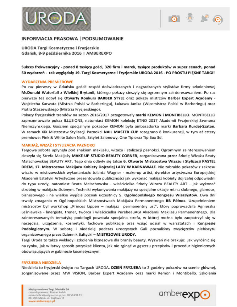 INFORMACJA PRASOWA │PODSUMOWANIE URODA Targi Kosmetyczne i Fryzjerskie Gdańsk, 8-9 października 2016 | AMBEREXPO Sukces frekwencyjny - ponad 8 tysięcy gości, 320 firm i marek, tysiące produktów w super cenach, ponad 50 wydarzeń - tak wyglądały 19. Targi Kosmetyczne i Fryzjerskie URODA 2016 - PO PROSTU PIĘKNE TARGI! WYDARZENIA PREMIEROWE Po raz pierwszy w Gdańsku gościł zespół doświadczanych i nagradzanych stylistów firmy szkoleniowej McDonald Waterfall z Wielkiej Brytanii, którego pokazy cieszyły się ogromnym zainteresowaniem. Po raz pierwszy też odbył się Otwarty Konkurs BARBER STYLE oraz pokazy mistrzów Barber Expert Academy Wojciecha Karwata (Mistrza Polski w Barberingu), Łukasza Janika (Wicemistrza Polski w Barberingu) oraz Piotra Staszewskiego (Mistrza Fryzjerskiego). Pokazy fryzjerskich trendów na sezon 2016/2017 przygotowały marki KEMON i MONTIBELLO. MONTIBELLO zaprezentowało pokaz ILLUSIONS, natomiast KEMON kolekcję ETNO 2017 Akademii Fryzjerskiej Szymona Niemczyńskiego. Gościem specjalnym pokazów KEMON była ambasadorka marki Barbara Kurdej-Szatan. W ramach XIX Mistrzostw Stylizacji Paznokci NAIL MASTER CUP rozegrano 8 konkurencji, w tym aż cztery premiowe: Pink & White Salon Nails, Sztylet Salonowy, One Tip oraz Tip Box 3d. MAKIJAŻ, WIZAŻ I STYLIZACJA PAZNOKCI Targowa sobota upłynęła pod znakiem makijażu, wizażu i stylizacji paznokci. Ogromnym zainteresowaniem cieszyła się Strefa Makijaży MAKE-UP STUDIO-BEAUTY CORNER, zorganizowana przez Szkołę Wizażu Beaty Małachowskiej BEAUTY ART. Tego dnia odbyły się także 6. Otwarte Mistrzostwa Wizażu i Stylizacji PASTEL DREM, 17. Mistrzostwa Makijażu Kobiety Dojrzałej LADY W KARNAWALE. Nie zabrakło pokazów z zakresu wizażu w mistrzowskich wykonaniach: Jolanta Wagner - make-up artist, dyrektor artystyczna Europejskiej Akademii Estetyki Artystyczne prezentowała publiczności jak wykonać makijaż kobiety dojrzałej odpowiedni do typu urody, natomiast Beata Małachowska - właścicielka Szkoły Wizażu BEAUTY ART - jak wykonać strobing w makijażu ślubnym. Techniki wykonywania makijaży na specjalne okazje mi.n.: ślubnego, glamour, biznesowego i na wielkie wyjścia poznali uczestnicy 5. Ogólnopolskiego Kongresu Wizażystów. Dwa dni trwały zmagania w Ogólnopolskich Mistrzostwach Makijażu Permanentnego BB Północ. Uzupełnieniem mistrzostw był workshop „Princes Lippen – makijaż permanentny ust”, który poprowadziła Agnieszka Leśniewska - linergista, trener, twórca i właścicielka PurebeauAGI Akademii Makijażu Permanentnego. Dla zainteresowanych tematyką podologii powstała specjalna strefa, w której można było zaopatrzyć się w narzędzia, urządzenia, kosmetyki, fachowe publikacje oraz wziąć udział w warsztatach i Kongresie Podologicznym. W sobotę i niedzielę podczas uroczystych Gali poznaliśmy zwycięzców plebiscytu organizowanego przez Dziennik Bałtycki – MISTRZOWIE URODY. Targi Uroda to także wykłady i szkolenia biznesowe dla branży beauty. Wyzwań nie brakuje: jak wyróżnić się na rynku, jak w łatwy sposób pozyskać klienta, jak nie zginąć w gąszczu przepisów i procedur higienicznych obowiązujących w gabinecie kosmetycznym. FRYZJESKA NIEDZIELA Niedziela to fryzjerski święto na Targach URODA. DZIEŃ FRYZJERA to 2 godziny pokazów na scenie głównej, zorganizowane przez MW VISION, Barber Expert Academy oraz marki Kemon i Montibello. Szkolenia i warsztaty w salach konferencyjnych, panel trychologiczny, a także trzy konkursy fryzjerskie (10. Konkurs Fryzjerski HAIR DESIGN, 52. Wojewódzki Konkurs Uczniów Rzemiosła Fryzjerskiego im. Stefana Zdrojewskiego, GDAŃSK HAIR CUP 2016 - Międzyszkolny Konkurs Fryzjerski). URODA ǀ partnerzy, współpraca Targi powstają przy współpracy wielu partnerów, m.in. firmy EURO FASHION – Akademia Paznokcia, Europejskiej Akademii Estetyki Artystycznej Jolanty Wagner, Szkoły Wizażu i Stylizacji Beaty Małachowskiej „Beauty Art”, Pomorskiej Izby Rzemieślniczej Małych i Średnich Przedsiębiorstw, BB PÓŁNOC, firmy JBS przedstawiciela marek Goldwell, KMS California, Olymp i Efalock, sieci sklepów FaleLokiKoki - przedstawiciela marek Kemon, artego i Montibello. URODA 2016 AMBEREXPO, Gdańsk, ul. Żaglowa 11 dyrektor projektu: Dorota Solochewicz ǀ [email protected] ǀ tel. 58 55 49 204, 601 894 332 więcej informacji: www.urodatargi.pl