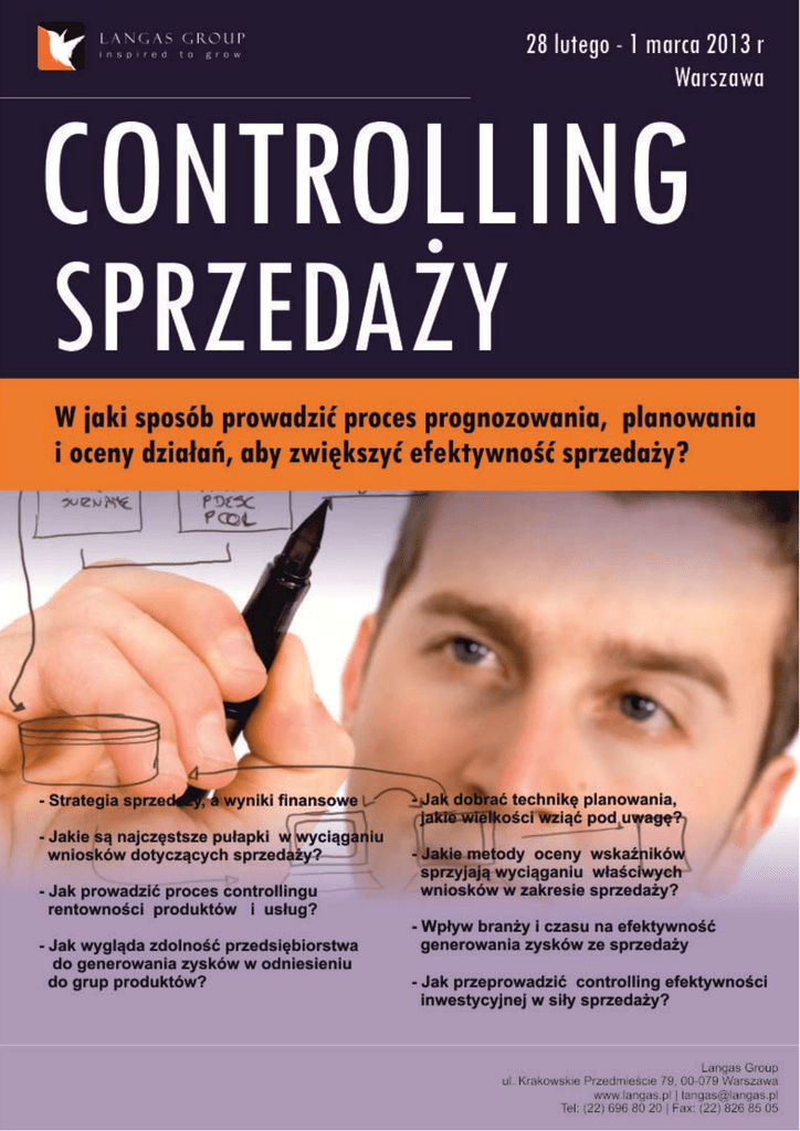 Agenda W jaki sposób prowadzić proces prognozowania, planowania i oceny działań, aby zwiększyć efektywność sprzedaży? 28 lutego 2013r. 09.30 – 10.00 rejestracja 10.00 – 11.30 SESJA PIERWSZA 11.30 – 11.45 przerwa na kawę, herbatę 11.45 – 13.30 SESJA DRUGA 13.30 – 14.15 obiad 14.15 – 17.00 SESJA TRZECIA CONTROLLING SPRZEDAŻY „…Z badań Instytutu Gallupa wynika, iż przygotowanie procesu sprzedaży na podstawie wiarygodnych informacji stanowi w 60% o sukcesie i wysokości sprzedaży…” Dane te dostępne są w każdej organizacji, jednak aby były przydatne i efektywnie wykorzystane niezbędne są umiejętności właściwego prognozowania, planowania, oceny, a przede wszystkim poddania analizie właściwych informacji i wyciągania prawidłowych wniosków. Kluczowe zagadnienia: − Strategia sprzedaży, a wyniki finansowe − Jakie są najczęstsze pułapki w wyciąganiu wniosków dotyczących sprzedaży? − Analiza potencjału segmentów − Analiza udział w rynku, a plany sprzedaży − Jak prowadzić proces controllingu rentowności produktów i usług? − Jak wygląda zdolność przedsiębiorstwa do generowania zysków w odniesieniu do grup produktów? − Jak dobrać technikę planowania sprzedaży, jakie wielkości wziąć pod uwagę? − Jakie metody oceny wskaźników sprzyjają wyciąganiu właściwych wniosków w zakresie sprzedaży? − Dynamika zmian kosztów sprzedaży − Jak wygląda zdolność przedsiębiorstwa do generowania zysków? − Wpływ branży i czasu na efektywność generowania zysków ze sprzedaży − Inwestycje w sprzedaż - jak przeprowadzić controlling efektywności inwestycyjnej w siły sprzedaży − Orientacja na cele sprzedażowe − Czynniki zwiększające sprzedaż − Wyniki – warunki efektywności sprzedaży Pamiętaj, że inwestując swój czas i pieniądze w szkolenia organizowane przez Langas Group, możesz zawsze spodziewać się zwrotu z inwestycji! Stawiamy na Twoje maksymalne zadowolenie! Magdalena Kaczmarczyk Kierownik Projektu [email protected] 1 marca 2013 r. 08.30 – 09.00 rejestracja 09.00 – 10.30 SESJA PIERWSZA 10.30 – 10.45 przerwa na kawę, herbatę 10.45 – 13.00 SESJA DRUGA 13.00 – 13.45 obiad 13.45 – 15.30 SESJA TRZECIA Ekspert: Aleksandra Tarasek - Trener i doradca firm w dziedzinie finansów, controllingu i podnoszenia efektywności działów. Prowadzi bardzo wysoko oceniane warsztaty dotyczące zagadnień finansowych. Zastępca Dyrektora Zarządzającego w Grupie Finansowej Premium S.A. Pracownik Katedry Finansów Akademii Ekonomicznej w Katowicach. Wieloletni analityk finansowy. Autorka wielu publikacji naukowych z zakresu bankowości i usług finansowych. Specjalizuje się w tematyce budowania grup kapitałowych i kształtowania relacji między instytucjami sektora finansowego na przykładzie bancassurance, zajmuje się kompleksową analizą kondycji finansowej pożyczkobiorców Szkolenie skierowane do: − − Menedżerów, specjalistów ds. sprzedaży, pracowników działu controllingu, działu finansowego Osób odpowiedzialnych za poprawę wyników sprzedaży Metodologia: case study, analiza przypadków, wykłady Opinie uczestników szkoleń prowadzonych przez ekspertów: „Jedno z najlepszych szkoleń na jakim byłam. Pełen profesjonalizm prowadzącej, ciekawy program, bardzo dobra organizacja” „Szkolenie w pełni odpowiada moim potrzebom. Jestem w pełni zadowolona z jego przebiegu oraz zakresu merytorycznego. Prowadzący bardzo dobrze przygotowany, szkolenie przebiega w przyjemnej atmosferze” - Martyna Kieliszek, Grupa Lotos S.A. „Profesjonalnie przygotowane szkolenie z bardzo ciekawymi materiałami” Agnieszka Milke, Polski Koncern Naftowy ORLEN SA „Szkolenie bardzo ciekawe, prowadzone w profesjonalny sposób, prowadząca umie przekazać wiedzę w ciekawy sposób” – Aleksandra Wysocka Langas Group ul. Krakowskie Przedmieście 79, 00-079 Warszawa www.langas.pl | [email protected] Tel: (22) 696 80 20 | Fax: (22) 826 85 05 W jaki sposób prowadzić proces prognozowania, planowania i oceny działań, aby zwiększyć efektywność sprzedaży? CONTROLLING SPRZEDAŻY CZYNNIKI ZWIĘKSZAJĄCE SPRZEDAŻ − Co konkretnie wpływa na efekt końcowy i uzyskanie oczekiwanego wyniku? − Jak przekazywać informacje dotyczące wyników? − Dopasowanie do pracowników, język finansowy, a sprzedażowy WYNIKI − Jak efektywnie przeprowadzić prezentację wyników? − Jak przeprowadzić skuteczne spotkanie w zespole – zasady prowadzenia spotkań? − Warunki efektywności poleceń i realizacji celów – motywatory działań efektywnych w sprzedaży CONTROLLING W SPRZEDAŻY, A DANE FINANSOWE FIRMY − Strategia sprzedaży, a wyniki finansowe − Jakie są najczęstsze pułapki w wyciąganiu wniosków dotyczących sprzedaży? − Profesjonalne podejście do analizy danych finansowych w procesie controllingu sprzedaży? WSTĘPNA ANALIZA SPRZEDAŻY – PODSTAWOWE DANE DO URUCHOMIENIA PROCESU CONTROLLINGU − Jakie wnioski można wyciągnąć analizując wartość i dynamikę sprzedaży w stosunku do potencjału rynkowego? − Analiza udział w rynku, a plany sprzedaży − Plany sprzedaży, a wyniki - analiza przyczyn odchyleń − Sprzężenie wyprzedzające – jako narzędzie minimalizacji ryzyka JAK PROWADZIĆ PROCES CONTROLLINGU RENTOWNOŚCI PRODUKTÓW I USŁUG? − Rentowności produktów – jak wyciągać prawidłowe wnioski? − Błędy w ocenie rentowności − Jak wyznaczyć marginesy bezpieczeństwa w sprzedaży − Jak prowadzić analizę wrażliwości zysku produktu/usługi? − Jak wygląda zdolność przedsiębiorstwa do generowania zysków w odniesieniu do grup produktów? − Jaki jest wpływ branży i czasu na efektywność generowania zysków w odniesieniu do grup produktów/usług? − Pokrycie finansowe, a koszty sprzedaży − „dolna granica ceny” PLANOWANIE FINANSOWE SPRZEDAŻY − Jak dobrać technikę planowania sprzedaży, jakie wielkości wzią