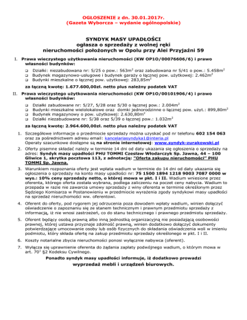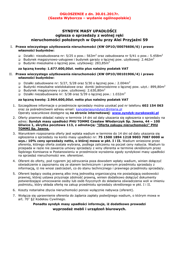 OGŁOSZENIE z dn. 30.01.2017r. (Gazeta Wyborcza – wydanie ogólnopolskie) SYNDYK MASY UPADŁOŚCI ogłasza o sprzedaży z wolnej ręki nieruchomości położonych w Opolu przy Alei Przyjaźni 59 I. Prawa wieczystego użytkowania nieruchomości (KW OP1O/00076606/6) i prawo własności budynków: Działki: niezabudowana nr: 5/25 o pow.: 563m2 oraz zabudowana nr 5/41 o pow.: 5.458m2 Budynek magazynowo-usługowe i budynek garaży o łącznej pow. użytkowej: 2.462m2 Budynki mieszkalne o łącznej pow. użytkowej: 283,85m2 za łączną kwotę: 1.677.600,00zł. netto plus należny podatek VAT II. Prawa wieczystego użytkowania nieruchomości (KW OP1O/00101906/4) i prawo własności budynków: Działki zabudowane nr: 5/27, 5/28 oraz 5/30 o łącznej pow.: 2.004m2 Budynki mieszkalne wielolokalowe oraz domki jednorodzinne o łącznej pow. użyt.: 899,80m2 Budynek magazynowy o pow. użytkowej: 2.630,80m2 Działki niezabudowane nr: 5/38 oraz 5/39 o łącznej pow.: 1.032m 2 za łączną kwotę: 2.964.600,00zł. netto plus należny podatek VAT 1. Szczegółowe informacje o przedmiocie sprzedaży można uzyskać pod nr telefonu 602 154 063 oraz za pośrednictwem adresu email: [email protected] Operaty szacunkowe dostępne są na stronie internetowej: www.syndyk-zurakowski.pl 2. Oferty pisemne składać należy w terminie 14 dni od daty ukazania się ogłoszenia o sprzedaży na adres: Syndyk masy upadłości PHU TOMMI Czesław Włodarczyk Sp. Jawna, 44 – 100 Gliwice 1, skrytka pocztowa 113, z adnotacją: ”Oferta zakupu nieruchomości” PHU TOMMI Sp. Jawna. 3. Warunkiem rozpoznania oferty jest wpłata wadium w terminie do 14 dni od daty ukazania się ogłoszenia o sprzedaży na konto masy upadłości nr: 75 1500 1894 1218 9003 7087 0000 w wys.: 10% ceny sprzedaży netto, o której mowa w pkt. I i II. Wadium wniesione przez oferenta, którego oferta została wybrana, podlega zaliczeniu na poczet ceny nabycia. Wadium to przepada w razie nie zawarcia umowy sprzedaży z winy oferenta w terminie określonym przez Sędziego Komisarza w Postanowieniu w przedmiocie wyrażenia zgody syndykowi masy upadłości na sprzedaż nieruchomości ww. oferentowi. 4. Oferent do oferty, pod rygorem jej odrzucenia poza dowodem wpłaty wadium, winien dołączyć oświadczenie o zapoznaniu się ze stanem technicznym i prawnym przedmiotu sprzedaży z informacją, iż nie wnosi zastrzeżeń, co do stanu technicznego i prawnego przedmiotu sprzedaży. 5. Oferent będący osobą prawną albo inną jednostką organizacyjną nie posiadającą osobowości prawnej, której ustawa przyznaje zdolność prawną, winien dodatkowo dołączyć dokumenty potwierdzające umocowanie osoby lub osób fizycznych do składania oświadczenia woli w imieniu podmiotu, który składa ofertę na zakup przedmiotu sprzedaży określonego w pkt. I i II. 6. Koszty notarialne zbycia nieruchomości ponosi wyłącznie nabywca (oferent). 7. Wyłącza się uprawnienie oferenta do żądania zapłaty podwójnego wadium, o którym mowa w art. 701 §2 Kodeksu Cywilnego. Ponadto syndyk masy upadłości informuje, iż dodatkowo prowadzi wyprzedaż mebli i urządzeń biurowych.