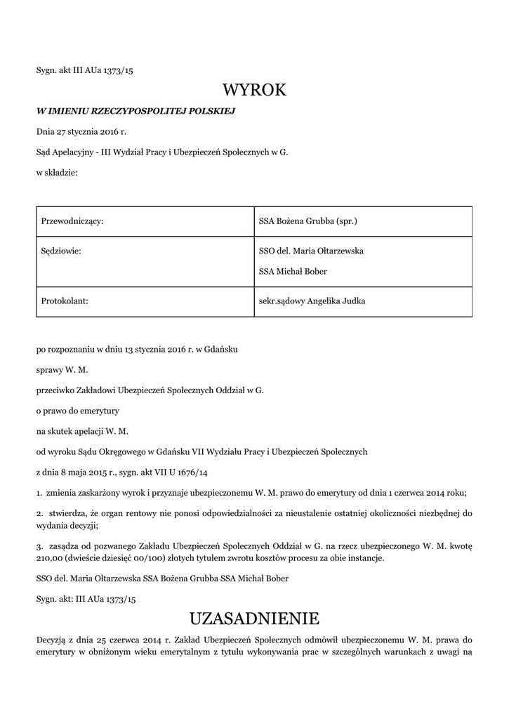 Sygn. akt III AUa 1373/15 WYROK W IMIENIU RZECZYPOSPOLITEJ POLSKIEJ Dnia 27 stycznia 2016 r. Sąd Apelacyjny - III Wydział Pracy i Ubezpieczeń Społecznych w G. w składzie: Przewodniczący: SSA Bożena Grubba (spr.) Sędziowie: SSO del. Maria Ołtarzewska SSA Michał Bober Protokolant: sekr.sądowy Angelika Judka po rozpoznaniu w dniu 13 stycznia 2016 r. w Gdańsku sprawy W. M. przeciwko Zakładowi Ubezpieczeń Społecznych Oddział w G. o prawo do emerytury na skutek apelacji W. M. od wyroku Sądu Okręgowego w Gdańsku VII Wydziału Pracy i Ubezpieczeń Społecznych z dnia 8 maja 2015 r., sygn. akt VII U 1676/14 1. zmienia zaskarżony wyrok i przyznaje ubezpieczonemu W. M. prawo do emerytury od dnia 1 czerwca 2014 roku; 2. stwierdza, że organ rentowy nie ponosi odpowiedzialności za nieustalenie ostatniej okoliczności niezbędnej do wydania decyzji; 3. zasądza od pozwanego Zakładu Ubezpieczeń Społecznych Oddział w G. na rzecz ubezpieczonego W. M. kwotę 210,00 (dwieście dziesięć 00/100) złotych tytułem zwrotu kosztów procesu za obie instancje. SSO del. Maria Ołtarzewska SSA Bożena Grubba SSA Michał Bober Sygn. akt: III AUa 1373/15 UZASADNIENIE Decyzją z dnia 25 czerwca 2014 r. Zakład Ubezpieczeń Społecznych odmówił ubezpieczonemu W. M. prawa do emerytury w obniżonym wieku emerytalnym z tytułu wykonywania prac w szczególnych warunkach z uwagi na nielegitymowanie się przez wnioskodawcę wymaganym przez prawo 15 – letnim stażem pracy w szczególnych warunkach. Odwołanie od powyższej decyzji wywiódł ubezpieczony, wnosząc o zmianę zaskarżonej decyzji oraz przyznanie ubezpieczonemu prawa do świadczenia od dnia złożenia wniosku W odpowiedzi na odwołanie pozwany organ rentowy wniósł o jego oddalenie, podtrzymując argumentację zaprezentowaną w treści zaskarżonej decyzji. Wyrokiem z dnia 8 maja 2015 r. Sąd Okręgowy w Gdańsku VII Wydział Pracy i Ubezpieczeń Społecznych oddalił odwołanie. Powyższe rozstrzygniecie Sąd Okręgowy oparł na następujących ustaleniach i rozważaniach: Ubezpieczony J. M., urodzony w dniu (...), w dniu 6 czerwca 2014 r. złożył w organie rentowym wniosek o emeryturę. Wnioskodawca nie jest członkiem Otwartego Funduszu Emerytalnego, a wymagany prawem wiek 60 lat ukończył w dniu (...) W toku postępowania przed organem rentowym, na dzień 1 stycznia 1999 r. wnioskodawca udowodnił 25 lat, 2 miesiące i 29 dni okresów składkowych i nieskładkowych. W okresie od 2 stycznia 1976 r. do 31 grudnia 1992 r. wnioskodawca był zatrudniony w pełnym wymiarze czasu pracy w Stoczni (...) S. A. zajmując kolejno następujące stanowiska: - od 2 stycznia 1976 r. do 15 maja 1976 r. – montera maszyn - od 16 maja 1976 r. do 30 czerwca 1976 r. – kierownika budowy statku - od 1 lipca 1976 r. do 31 sierpnia 1978 r. – samodzielnego budowniczego statku - od 1 września 1978 r. do 31 marca 1985 r. – starszy budowniczy statku - od 1 kwietnia 1985 r. do 31 grudnia 1992 r. – kierownika oddziału ciepłowniczego W okresie od 8 sierpnia 1988 r. do 31 grudnia 1992 r. skarżący korzystał z urlopu bezpłatnego. We wskazanych powyżej okresach Stocznia (...) zatrudniała od 10 tysięcy do 13 tysięcy pracowników. Pracodawca wystawił ubezpieczonemu świadectwo wykonywania pracy zaliczanej do pierwszej kategorii zatrudnienia, wskazując, że w okresie od 2 stycznia 1976 r. do 15 maja 1976 r. skarżący świadczył prace określone pod poz. 90 działu III wykazu A stanowiącego znacznik do Rozporządzenia Rady Ministrów z dnia 18 lutego 1983 r., w okresie od 16 maja 1976 r. do 31 marca 1985 r. wnioskodawca świadczył prace określone pod poz. 24 działu XIV wykazu A stanowiącego załącznik do Rozporządzenia Rady Ministrów z dnia 18 lutego 1983 r. zaś w okresie od 1 kwietnia 1985 r. do 7 sierpnia 1988 r. ubezpieczony świadczył prace określone pod poz. 24 działu XIV wykazu A stanowiącego załącznik do przywołanego powyżej rozporządzenia. Świadcząc pracę w charakterze montera maszyn, kierownika budowy statku, starszego budowniczego statku oraz samodzielnego budowniczego statku wnioskodawca wykonywał prace zaliczone do prac szczególnych w wykazie A. Ubezpieczony zajmował się montowaniem instalacji na nowobudowanych statkach jako monter i nadzorowaniem wszystkich robotników wykonujących prace na statku jako budowniczy. Ubezpieczony wykonywał przypisane do niego zadania bezpośrednio na terenie statku, na pochylni lub nabrzeżu. Do obowiązków skarżącego jako budowniczego należało kontrolowanie wykonywanych zadań produkcyjnych, zgodnie z dostępną dokumentacją techniczną i technologiczną. Wykonując powyższe zadania ubezpieczony stale przebywał na pochylniach i w dokach, w których budowano statki, spawano ich kadłuby i grodzie, piaskowano, malowano. Po zwodowaniu statku miejscem pracy ubezpieczonego był budowany statek, który należało wyposażyć. W okresie od 1 kwietnia 1985 do 7 sierpnia 1988 ubezpieczony świadczył prace w charakterze kierownika Oddziału Ciepłowniczego na Wydziale Energetycznym. Ubezpieczonemu podlegali bezpośrednio zatrudnieni w wydziale mistrzowie oraz brygadziści. Oddział ciepłownicy zajmował się wytwarzaniem energii cieplnej w postaci pary, gorącej wody i kondensatu oraz przesyłaniem tych mediów do odbiorców. Wnioskodawca posiadał uprawnianie niezbędne do nadzorowania kotłów poniżej 40 barów i nadzorował jeden 35barowy kocioł oraz dwa kotły niskociśnieniowe. W trakcie pełnienia funkcji kierowniczej skarżącemu podlegało około 80 osób. Z uwagi na posiadane uprawnienia oraz kwalifikacje skarżący koordynował prace wykonywane przez podległych mu pracowników, będąc obecnym oraz bezpośrednio uczestnicząc przy wykonywanych przez nich zadaniach związanych z obsługa kotłów i ciągów ciepłowniczych na terenie stoczni. Wnioskodawca był odpowiedzialny za utrzymanie urządzeń ciepłowniczych w ciągłym ruchu. W związku z powyższym 