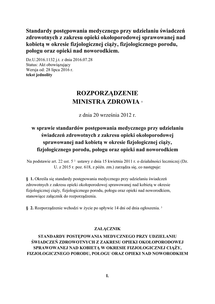 Standardy postępowania medycznego przy udzielaniu świadczeń zdrowotnych z zakresu opieki okołoporodowej sprawowanej nad kobietą w okresie fizjologicznej ciąży, fizjologicznego porodu, połogu oraz opieki nad noworodkiem. Dz.U.2016.1132 j.t. z dnia 2016.07.28 Status: Akt obowiązujący Wersja od: 28 lipca 2016 r. tekst jednolity ROZPORZĄDZENIE MINISTRA ZDROWIA 1 z dnia 20 września 2012 r. w sprawie standardów postępowania medycznego przy udzielaniu świadczeń zdrowotnych z zakresu opieki okołoporodowej sprawowanej nad kobietą w okresie fizjologicznej ciąży, fizjologicznego porodu, połogu oraz opieki nad noworodkiem Na podstawie art. 22 ust. 5 2 ustawy z dnia 15 kwietnia 2011 r. o działalności leczniczej (Dz. U. z 2015 r. poz. 618, z późn. zm.) zarządza się, co następuje: § 1. Określa się standardy postępowania medycznego przy udzielaniu świadczeń zdrowotnych z zakresu opieki okołoporodowej sprawowanej nad kobietą w okresie fizjologicznej ciąży, fizjologicznego porodu, połogu oraz opieki nad noworodkiem, stanowiące załącznik do rozporządzenia. § 2. Rozporządzenie wchodzi w życie po upływie 14 dni od dnia ogłoszenia. 3 ZAŁĄCZNIK STANDARDY POSTĘPOWANIA MEDYCZNEGO PRZY UDZIELANIU ŚWIADCZEŃ ZDROWOTNYCH Z ZAKRESU OPIEKI OKOŁOPORODOWEJ SPRAWOWANEJ NAD KOBIETĄ W OKRESIE FIZJOLOGICZNEJ CIĄŻY, FIZJOLOGICZNEGO PORODU, POŁOGU ORAZ OPIEKI NAD NOWORODKIEM I. Postanowienia ogólne 1. Standardy postępowania medycznego przy udzielaniu świadczeń zdrowotnych z zakresu opieki okołoporodowej sprawowanej nad kobietą w okresie fizjologicznej ciąży, fizjologicznego porodu, połogu oraz opieki nad noworodkiem, zwane dalej "standardami", określają poszczególne elementy opieki medycznej mającej na celu uzyskanie dobrego stanu zdrowia matki i dziecka, przy ograniczeniu do niezbędnego minimum interwencji medycznych, w szczególności: amniotomii, stymulacji czynności skurczowej, podawania opioidów, nacięcia krocza, cięcia cesarskiego, podania noworodkowi mleka modyfikowanego, z uwzględnieniem zasad bezpieczeństwa zdrowotnego, w ramach których opieka opiera się na praktykach o udowodnionej skuteczności. 2. Użyte w standardach określenia oznaczają: 1) I okres porodu - okres liczony od pojawienia się pierwszych regularnych skurczów macicy powodujących zgładzanie i rozwieranie szyjki macicy aż do jej pełnego rozwarcia; 2) II okres porodu - okres między całkowitym rozwarciem szyjki macicy a urodzeniem noworodka; 3) III okres porodu - okres rozpoczynający się po urodzeniu noworodka i obejmujący oddzielenie oraz wydalenie popłodu; 4) IV okres porodu - okres trwający do 2 godzin po oddzieleniu i wydaleniu popłodu; 5) ciąża fizjologiczna - ciążę przebiegającą w sposób prawidłowy; 6) osoba bliska - małżonka, krewnego lub powinowatego do drugiego stopnia w linii prostej, przedstawiciela ustawowego, osobę pozostającą we wspólnym pożyciu lub inną osobę wskazaną przez rodzącą; 7) osoba sprawująca opiekę - lekarza specjalistę w dziedzinie położnictwa i ginekologii, lekarza ze specjalizacją I stopnia w dziedzinie położnictwa i ginekologii, lekarza w trakcie specjalizacji w dziedzinie położnictwa i ginekologii lub położną, sprawujących odpowiednio opiekę nad ciężarną, rodzącą, położnicą i noworodkiem - odpowiedzialnych za prowadzenie porodu fizjologicznego; 8) połóg - okres rozpoczynający się po porodzie i trwający 6 tygodni, w czasie którego w organizmie kobiety następuje cofanie się zmian spowodowanych ciążą i porodem; 9) poród fizjologiczny - spontaniczny poród niskiego ryzyka od momentu rozpoczęcia i utrzymujący taki stopień ryzyka przez cały czas trwania porodu, w wyniku którego noworodek rodzi się z położenia główkowego, pomiędzy ukończonym 37. a 42. tygodniem ciąży, i po którym matka i noworodek są w dobrym stanie. 3. Ingerencja w naturalny proces ciąży, porodu i laktacji wiąże się z uzasadnionym medycznie wskazaniem. Uzasadniona konieczność ingerencji w naturalny proces ciąży lub porodu, w szczególności leczenie cukrzycy ciężarnej, znieczulenie farmakologiczne, poród zabiegowy, oznacza, że ciąża lub poród wymaga zastosowania dodatkowych procedur wykraczających poza niniejsze standardy. 4. Ciężarna lub rodząca powinna być kierowana do podmiotu leczniczego o poziomie referencyjnym zapewniającym opiekę perinatalną odpowiednią do jej stanu zdrowia oraz przebiegu ciąży lub porodu, z uwzględnieniem faktu, że I poziom opieki perinatalnej obejmuje opiekę nad fizjologicznie przebiegającą ciążą, porodem i połogiem oraz zdrowym noworodkiem, a także krótkotrwałą opiekę nad niespodziewanie występującą patologią ciąży, II poziom opieki perinatalnej obejmuje opiekę nad patologią ciąży średniego stopnia, III poziom opieki perinatalnej obejmuje opiekę nad najcięższą patologią ciąży. 5. W dokumentacji medycznej należy odnotować dzień i godzinę objęcia kobiety lub noworodka opieką i zakończenia jej sprawowania, z adnotacją o świadczeniodawcy, który tę opiekę przejmuje, zawierającą jego dane, chyba że kobieta lub jej przedstawiciel ustawowy nie podjęli jeszcze decyzji w tym zakresie. 6. Odpowiedzialność prawną i zawodową osoby sprawującej opiekę za podejmowane działania regulują przepisy ustawy z dnia 2 grudnia 2009 r. o izbach lekarskich (Dz. U. z 2016 r. poz. 522) oraz ustawy z dnia 1 lipca 2011 r. o samorządzie pielęgniarek i położnych (Dz. U. poz. 1038, z późn. zm.). 7. Zadania osoby sprawującej opiekę obejmują w szczególności: 1) ocenę stanu rodzącej kobiety, płodu oraz noworodka; 2) wykrywanie i eliminowanie czynników ryzyka, rozwiązywanie problemów oraz wczesne wykrywanie patologii; 3) prowadzenie porodu przy użyciu technik wspierających jego naturalny mechanizm; 4) opiekę nad noworodkiem po urodzeniu; 5) zapewnienie opieki realizowanej przez specjalistów, jeżeli ujawnią