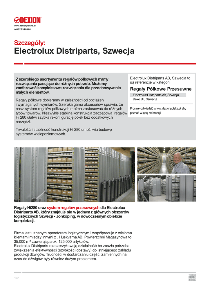 www.dexionpolska.pl +48 22 295 08 00 Szczegóły: Electrolux Distriparts, Szwecja Z szerokiego asortymentu regałów półkowych mamy rozwiązania pasujące do różnych potrzeb. Możemy zaoferować kompleksowe rozwiązania dla przechowywania małych elementów. Electrolux Distriparts AB, Szwecja to są referencje w kategorii Regały Półkowe Przesuwne Electrolux Distriparts AB, Szwecja Beko Bil, Szwecja Regały półkowe dobieramy w zależności od obciążeń i wymaganych wymiarów. Szeroka gama akcesoriów sprawia, że Prosimy odwiedzić www.dexionpolska.pl aby nasz system regałów półkowych można zastosować do różnych typów towarów. Niezwykle stabilna konstrukcja zaczepowa regałów poznać więcej referencji. Hi 280 ułatwi szybką rekonfigurację półek bez dodatkowych narzędzi. Trwałość i stabilność konstrukcji Hi 280 umożliwia budowę systemów wielopoziomowych. Regały Hi280 oraz system regałów przesuwnych dla Electrolux Distriparts AB, który znajduje się w jednym z głównych obszarów logistycznych Szwecji - Jönköping, w nowoczesnym obiekcie kompletacji. Firma jest uznanym operatorem logistycznym i współpracuje z wieloma klientami miedzy innymi z . Huskvarna AB. Powierzchni Magazynowa to 35,000 m² zawierająca ok. 125,000 artykułów. Electrolux Distriparts rozszerzył swoją działalność bo zaszła potrzeba zwiększenia efektywności (szybkości dostawy) do istniejącego zakładu produkcji dźwigów. Trudności w dostarczaniu części zamiennych na czas do dźwigów były również dużym problemem. 1/2 www.dexionpolska.pl +48 22 295 08 00 Rozwiązanie: Szczegółowa analiza została przeprowadzona na podstawie następujących czynników kluczowych: zwiększenie szybkości operacji, pojemność magazynowa (m²). Wynikiem tej analizy było trudne, zmodernizowane rozwiązanie oparte na systemie regałów na ponad dwóch poziomach podzieloną przez antresolę. Regały Hi280 w połączeniu z nowoczesnym systemem regałów jezdnych dostarczył odpowiedzi na ten problem. Kompletacja prowadzona jest przez pracowników, przy użyciu nowo opracowanych motorowerach. Inwestycja przyczyniła się do szybszej kompletacji, zmniejszenia liczby pracowników i zwiększenia elastyczności w magazynie. Zastosowane produkty: Regały półkowe systemu Hi280: 15 000 półek o głębokości od 300-800 mm. 24 regały Compactus ® Regały paletowe P90: różne wysokości i nośności, razem 35 000 miejsc paletowych. Podest Wolnostojący: 600 m² powierzchni o noścności 500 kg./ m² Liczba pojemników magazynowych w regałach półkowych: 43 920. 2/2