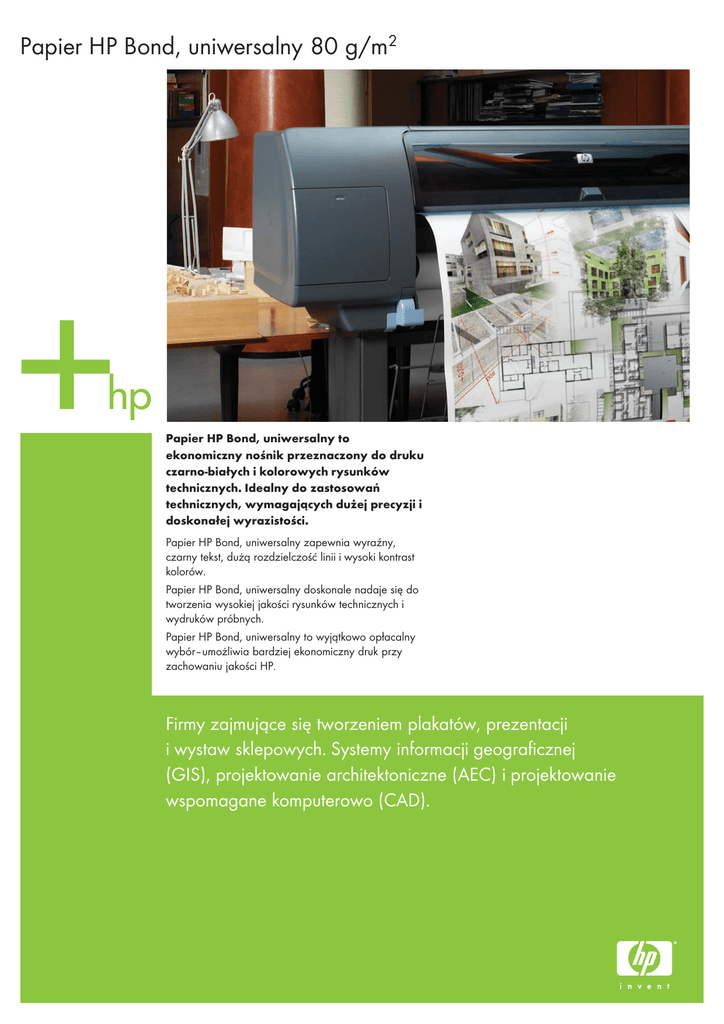 Papier HP Bond, uniwersalny 80 g/m2 Papier HP Bond, uniwersalny to ekonomiczny nośnik przeznaczony do druku czarno-białych i kolorowych rysunków technicznych. Idealny do zastosowań technicznych, wymagających dużej precyzji i doskonałej wyrazistości. Papier HP Bond, uniwersalny zapewnia wyraźny, czarny tekst, dużą rozdzielczość linii i wysoki kontrast kolorów. Papier HP Bond, uniwersalny doskonale nadaje się do tworzenia wysokiej jakości rysunków technicznych i wydruków próbnych. Papier HP Bond, uniwersalny to wyjątkowo opłacalny wybór–umożliwia bardziej ekonomiczny druk przy zachowaniu jakości HP. Firmy zajmujące się tworzeniem plakatów, prezentacji i wystaw sklepowych. Systemy informacji geograficznej (GIS), projektowanie architektoniczne (AEC) i projektowanie wspomagane komputerowo (CAD). Papier HP Bond, uniwersalny 80 g/m2 Zgodność Najnowsze informacje na temat zgodności materiałów eksploatacyjnych do drukarek wielkoformatowych można znaleźć na stronie www.hp.com/go/designjet/supplies Najnowsze profile ICC dla nośników można znaleźć pod adresem www.hp.com/go/designjet/supplies (należy kliknąć profile ICC i wybrać model drukarki). W przypadku drukarek niepostscriptowych informacji na ten temat można zasięgnąć u dostawcy procesora RIP. Waga 80 g/m2 wg metody testowej ISO 536 Grubość materiału drukującego 107 μm wg metody testowej ISO 534 Nieprzezroczystość 90% wg metody testowej TAPPI T-425 Jasność materiału drukowania 110% wg metody testowej ISO 2470 Biel 160 wg metody testowej CIE GANZ 82 Laminacja materiału drukującego Papier ten można laminować przy użyciu dostępnych na rynku folii samoprzylepnych. Więcej informacji o partnerach HP oferujących laminowanie na stronie: www.hp.com/go/designjet/supplies Wykończenie nośnika Matowy Wodotrwałość materiału drukującego Wymagane laminowanie Czas suszenia materiału drukującego Natychmiast (w temperaturze 23° C, przy wilgotności względnej 50%) Żywotność na półce 2 lata w oryginalnym, fabrycznie zamkniętym opakowaniu Kraj pochodzenia Wyprodukowano na Węgrzech Numery katalogowe HP Oświadczenie gwarancyjne Numer produktu wymiary noœnika w roli 610 mm x 45.7 m 7 25184-66016 0 Q1397A 914 mm x 45.7 m 7 25184-66017 7 Q1398A 1067 mm x 45.7 m 7 25184-66018 4 Q8004A 594 mm x 91.4 m 8 29160-96574 1 Q8005A 841 mm x 91.4 m 8 29160-96575 8 Q8002A 914 mm x 152.4 m 8 29160-96576 5 HP gwarantuje, że wielkoformatowe materiały drukarskie HP są wolne od defektów i wad produkcyjnych, i są tak zaprojektowane, by przy właściwym użytkowaniu nie powodować zacięć drukarki. Jeśli z jakiegokolwiek powodu użytkownik jest niezadowolony z wielkoformatowego materiału drukarskiego HP, powinien skontaktować się ze swoim sprzedawcą. © 2006 Hewlett-Packard Development Company, L.P. Specyfikacje zawarte w tym dokumencie mogą bez uprzedzenia ulec zmianie. Wszystkie gwarancje udzielane w odniesieniu do Produktów i Usług HP określone zostały w oświadczeniach gwarancyjnych załączanych do każdego produktu i usługi. Żaden zapis niniejszego dokumentu nie może być uważany za dodatkową gwarancję. HP nie ponosi odpowiedzialności za błędy techniczne lub drukarskie w niniejszym dokumencie. Aby uzyskać więcej informacji na temat materiałów konsumpcyjnych HP, odwiedź http://www.hp.com/go/designjet/supplies 4AA0-3195PLE 06/06 Oznaczenie na kodzie kreskowym (UPC) Q1396A