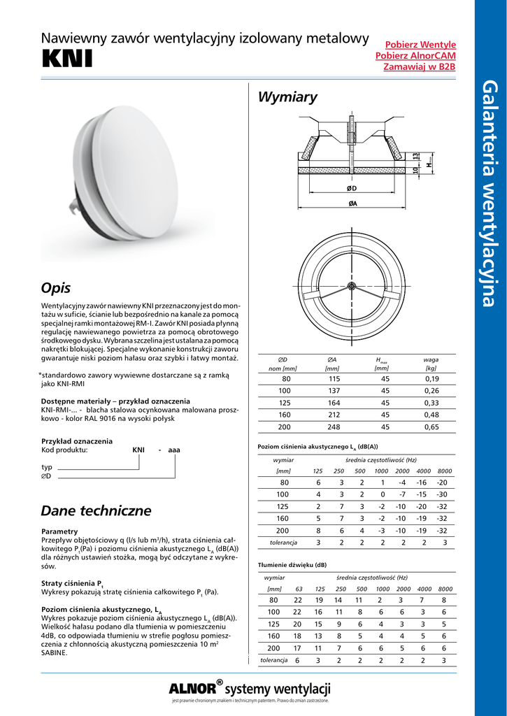 Nawiewny zawór wentylacyjny izolowany metalowy KNI Pobierz Wentyle Pobierz AlnorCAM Zamawiaj w B2B Galanteria wentylacyjna max Wymiary D Opis Wentylacyjny zawór nawiewny KNI przeznaczony jest do mon tażu w suficie, ścianie lub bezpośrednio na kanale za pomocą specjalnej ramki montażowej RM-I. Zawór KNI posiada płynną regulację nawiewanego powietrza za pomocą obrotowego środkowego dysku. Wybrana szczelina jest ustalana za pomocą nakrętki blokującej. Specjalne wykonanie konstrukcji zaworu gwarantuje niski poziom hałasu oraz szybki i łatwy montaż. *standardowo zawory wywiewne dostarczane są z ramką jako KNI-RMI Dostępne materiały – przykład oznaczenia KNI-RMI-... - blacha stalowa ocynkowana malowana proszkowo - kolor RAL 9016 na wysoki połysk Przykład oznaczenia Kod produktu: KNI -aaa D nom [mm] A [mm] Hmax [mm] 80 115 45 0,19 100 137 45 0,26 125 164 45 0,33 160 212 45 0,48 200 248 45 0,65 Poziom ciśnienia akustycznego L A (dB(A)) wymiar typ D Dane techniczne Parametry Przepływ objętościowy q (l/s lub m3/h), strata ciśnienia cał kowitego P t(Pa) i poziomu ciśnienia akustycznego L A (dB(A)) dla różnych ustawień stożka, mogą być odczytane z wykre sów. Straty ciśnienia P t Wykresy pokazują stratę ciśnienia całkowitego P t (Pa). waga [kg] średnia częstotliwość (Hz) [mm] 125 250 500 80 6 3 2 1000 2000 1 -4 100 4 3 2 0 125 2 7 3 -2 4000 8000 -16 -20 -7 -15 -30 -10 -20 -32 160 5 7 3 -2 -10 -19 -32 200 8 6 4 -3 -10 -19 -32 tolerancja 3 2 2 2 2 2 3 4000 8000 Tłumienie dźwięku (dB) wymiar [mm] 80 Poziom ciśnienia akustycznego, L A 100 Wykres pokazuje poziom ciśnienia akustycznego L A (dB(A)). 125 Wielkość hałasu podano dla tłumienia w pomieszczeniu 4dB, co odpowiada tłumieniu w strefie pogłosu pomiesz 160 czenia z chłonnością akustyczną pomieszczenia 10 m2 200 SABINE. http://www.alnor.com.pl/prod ukty_pl/kratki,-nawiewniki-i-puszki.html tolerancja średnia częstotliwość (Hz) 63 125 250 500 1000 2000 22 19 14 11 2 3 7 8 22 16 11 8 6 6 3 6 20 15 9 6 4 3 3 5 18 13 8 5 4 4 5 6 17 11 7 6 6 5 6 6 6 3 2 2 2 2 2 3 ALNOR® systemy wentylacji jest prawnie chronionym znakiem i technicznym patentem. Prawo do zmian zastrzeżone. Nawiewny zawór wentylacyjny izolowany metalowy Dane techniczne Wykresy doboru pozycja [mm] pozycja [mm] 5 5 strata ciśnienia P t [Pa] strata ciśnienia P t [Pa] 10 15 qv [l/s] qv [l/s] qv [m3/h] qv [m3/h] przepływ przepływ pozycja [mm] pozycja [mm] 10 10 20 30 strata ciśnienia P t [Pa] strata ciśnienia P t [Pa] 20 qv [l/s] qv [l/s] qv [m3/h] pozycja [mm] 1 10 qv [m3/h] przepływ przepływ 20 30 strata ciśnienia P t [Pa] Galanteria wentylacyjna KNI Pobierz Wentyle Pobierz AlnorCAM Zamawiaj w B2B qv [l/s] http://www.alnor.com.pl/produkty_pl/kratki,-nawiewniki-i-p uszki.html qv [m3/h] przepływ ALNOR® systemy wentylacji jest prawnie chronionym znakiem i technicznym patentem. Prawo do zmian zastrzeżone.