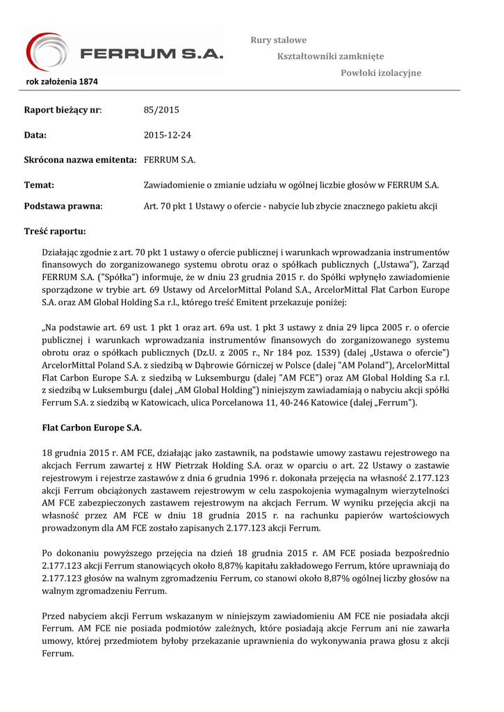nabyła akcje Ferrum i na dzień 21 grudnia 2015 r. pośrednio posiada (za pośrednictwem AM Poland