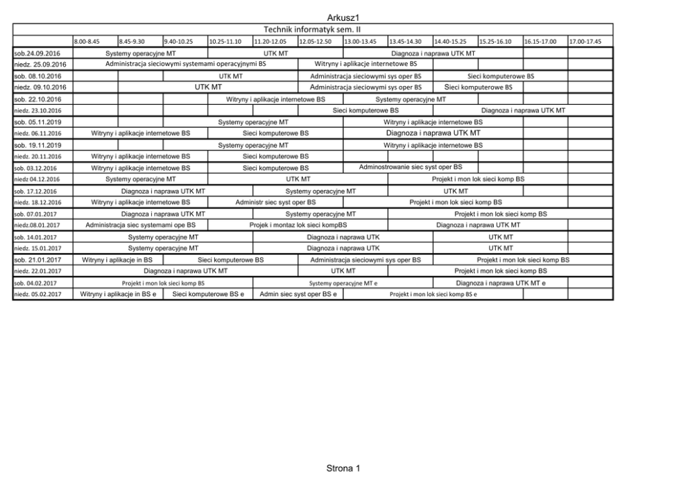 Arkusz1 Technik informatyk sem. II 8.00-8.45 8.45-9.30 9.40-10.25 10.25-11.10 11.20-12.05 sob.24.09.2016 Systemy operacyjne MT niedz. 25.09.2016 Administracja sieciowymi systemami operacyjnymi BS 12.05-12.50 UTK MT niedz. 09.10.2016 sob. 22.10.2016 Administracja sieciowymi sys oper BS Administracja sieciowymi sys oper BS Witryny i aplikacje internetowe BS sob. 03.12.2016 Witryny i aplikacje internetowe BS Sieci komputerowe BS niedz 04.12.2016 Systemy operacyjne MT niedz.08.01.2017 Diagnoza i naprawa UTK MT Witryny i aplikacje internetowe BS Sieci komputerowe BS sob. 07.01.2017 Sieci komputerowe BS Sieci komputerowe BS Diagnoza i naprawa UTK MT Systemy operacyjne MT Witryny i aplikacje internetowe BS Adminostrowanie siec syst oper BS UTK MT Diagnoza i naprawa UTK MT Witryny i aplikacje internetowe BS Projekt i mon lok sieci komp BS Systemy operacyjne MT Administr siec syst oper BS Diagnoza i naprawa UTK MT Administracja siec systemami ope BS UTK MT Projekt i mon lok sieci komp BS Systemy operacyjne MT Projekt i mon lok sieci komp BS Projek i montaz lok sieci kompBS Diagnoza i naprawa UTK MT sob. 14.01.2017 Systemy operacyjne MT Diagnoza i naprawa UTK UTK MT niedz. 15.01.2017 Systemy operacyjne MT Diagnoza i naprawa UTK UTK MT sob. 21.01.2017 niedz. 22.01.2017 sob. 04.02.2017 niedz. 05.02.2017 Witryny i aplikacje in BS Sieci komputerowe BS Diagnoza i naprawa UTK MT Projekt i mon lok sieci komp BS Witryny i aplikacje in BS e Sieci komputerowe BS e 17.00-17.45 Witryny i aplikacje internetowe BS Sieci komputerowe BS sob. 19.11.2019 16.15-17.00 Systemy operacyjne MT Systemy operacyjne MT Witryny i aplikacje internetowe BS niedz. 20.11.2016 niedz. 18.12.2016 15.25-16.10 Sieci komputerowe BS sob. 05.11.2019 sob. 17.12.2016 14.40-15.25 Diagnoza i naprawa UTK MT niedz. 23.10.2016 niedz. 06.11.2016 13.45-14.30 Witryny i aplikacje internetowe BS UTK MT UTK MT sob. 08.10.2016 13.00-13.45 Administracja sieciowymi sys oper BS UTK MT Systemy operacyjne MT e Admin siec syst oper BS e Strona 1 Projekt i mon lok sieci komp BS Projekt i mon lok sieci komp BS Diagnoza i naprawa UTK MT e Projekt i mon lok sieci komp BS e