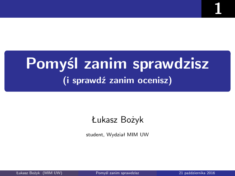 1 Pomyśl zanim sprawdzisz (i sprawdź zanim ocenisz) Łukasz Bożyk student, Wydział MIM UW Łukasz Bożyk (MIM UW) Pomyśl zanim sprawdzisz 21 października 2016 2 Zadanie 1. (7/FLOMG) Na kartce narysowany jest 100-kąt foremny. Ania i Bartek grają w następującą grę: na zmianę, począwszy od Ani, kolorują po jednym wierzchołku 100-kąta — Ania na czerwono, a Bartek na niebiesko. Łukasz Bożyk (MIM UW) Pomyśl zanim sprawdzisz 21 października 2016 3 Zadanie 1. (7/FLOMG) Na kartce narysowany jest 100-kąt foremny. Ania i Bartek grają w następującą grę: na zmianę, począwszy od Ani, kolorują po jednym wierzchołku 100-kąta — Ania na czerwono, a Bartek na niebiesko. Wygrywa ta osoba, która jako pierwsza pokoloruje trzy kolejne wierzchołki swoim kolorem; jeżeli nikomu się to nie uda — jest remis. Łukasz Bożyk (MIM UW) Pomyśl zanim sprawdzisz 21 października 2016 4 Zadanie 1. (7/FLOMG) Na kartce narysowany jest 100-kąt foremny. Ania i Bartek grają w następującą grę: na zmianę, począwszy od Ani, kolorują po jednym wierzchołku 100-kąta — Ania na czerwono, a Bartek na niebiesko. Wygrywa ta osoba, która jako pierwsza pokoloruje trzy kolejne wierzchołki swoim kolorem; jeżeli nikomu się to nie uda — jest remis. Łukasz Bożyk (MIM UW) Pomyśl zanim sprawdzisz 21 października 2016 5 Zadanie 1. (7/FLOMG) Na kartce narysowany jest 100-kąt foremny. Ania i Bartek grają w następującą grę: na zmianę, począwszy od Ani, kolorują po jednym wierzchołku 100-kąta — Ania na czerwono, a Bartek na niebiesko. Wygrywa ta osoba, która jako pierwsza pokoloruje trzy kolejne wierzchołki swoim kolorem; jeżeli nikomu się to nie uda — jest remis. A Łukasz Bożyk (MIM UW) Pomyśl zanim sprawdzisz 21 października 2016 6 Zadanie 1. (7/FLOMG) Na kartce narysowany jest 100-kąt foremny. Ania i Bartek grają w następującą grę: na zmianę, począwszy od Ani, kolorują po jednym wierzchołku 100-kąta — Ania na czerwono, a Bartek na niebiesko. Wygrywa ta osoba, która jako pierwsza pokoloruje trzy kolejne wierzchołki swoim kolorem; jeżeli nikomu się to nie uda — jest remis. A Łukasz Bożyk (MIM UW) B Pomyśl zanim sprawdzisz 21 października 2016 7 Zadanie 1. (7/FLOMG) Na kartce narysowany jest 100-kąt foremny. Ania i Bartek grają w następującą grę: na zmianę, począwszy od Ani, kolorują po jednym wierzchołku 100-kąta — Ania na czerwono, a Bartek na niebiesko. Wygrywa ta osoba, która jako pierwsza pokoloruje trzy kolejne wierzchołki swoim kolorem; jeżeli nikomu się to nie uda — jest remis. A Łukasz Bożyk (MIM UW) B Pomyśl zanim sprawdzisz A 21 października 2016 8 Zadanie 1. (7/FLOMG) Na kartce narysowany jest 100-kąt foremny. Ania i Bartek grają w następującą grę: na zmianę, począwszy od Ani, kolorują po jednym wierzchołku 100-kąta — Ania na czerwono, a Bartek na niebiesko. Wygrywa ta osoba, która jako pierwsza pokoloruje trzy kolejne wierzchołki swoim kolorem; jeżeli nikomu się to nie uda — jest remis. A Łukasz Bożyk (MIM UW) B B Pomyśl zanim sprawdzisz A 21 października 2016 9 Zadanie 1. (7/FLOMG) Na kartce narysowany jest 100-kąt foremny. Ania i Bartek grają w następującą grę: na zmianę, począwszy od Ani, kolorują po jednym wierzchołku 100-kąta — Ania na czerwono, a Bartek na niebiesko. Wygrywa ta osoba, która jako pierwsza pokoloruje trzy kolejne wierzchołki swoim kolorem; jeżeli nikomu się to nie uda — jest remis. A Łukasz Bożyk (MIM UW) A B B Pomyśl zanim sprawdzisz A 21 października 2016 10 Zadanie 1. (7/FLOMG) Na kartce narysowany jest 100-kąt foremny. Ania i Bartek grają w następującą grę: na zmianę, począwszy od Ani, kolorują po jednym wierzchołku 100-kąta — Ania na czerwono, a Bartek na niebiesko. Wygrywa ta osoba, która jako pierwsza pokoloruje trzy kolejne wierzchołki swoim kolorem; jeżeli nikomu się to nie uda — jest remis. A Łukasz Bożyk (MIM UW) A B B Pomyśl zanim sprawdzisz B A 21 października 2016 11 Zadanie 1. (7/FLOMG) Na kartce narysowany jest 100-kąt foremny. Ania i Bartek grają w następującą grę: na zmianę, począwszy od Ani, kolorują po jednym wierzchołku 100-kąta — Ania na czerwono, a Bartek na niebiesko. Wygrywa ta osoba, która jako pierwsza pokoloruje trzy kolejne wierzchołki swoim kolorem; jeżeli nikomu się to nie uda — jest remis. Wykaż, że Bartek zawsze może grać tak, aby uniemożliwić Ani zwycięstwo. A Łukasz Bożyk (MIM UW) A B B Pomyśl zanim sprawdzisz B A 21 października 2016 12 Rozwiązanie zadania 1. 1) Rundą nazwiemy każdą parę ruchów: ruch Ani i bezpośrednio po nim następujący ruch Bartka. Łukasz Bożyk (MIM UW) Pomyśl zanim sprawdzisz 21 października 2016 13 Rozwiązanie zadania 1. 1) Rundą nazwiemy każdą parę ruchów: ruch Ani i bezpośrednio po nim następujący ruch Bartka. 2) Wykażemy, że strategią nieprzegrywającą dla Bartka jest kolorowanie wierzchołka obok tego, który w danej rundzie został pokolorowany przez Anię. Łukasz Bożyk (MIM UW) Pomyśl zanim sprawdzisz 21 października 2016 14 Rozwiązanie zadania 1. 3) Przypuśćmy, że Ania wygrała, czyli pokolorowała na czerwono pewną trójkę sąsiednich wierzchołków danego 100-kąta. Łukasz Bożyk (MIM UW) Pomyśl zanim sprawdzisz 21 października 2016 15 Rozwiązanie zadania 1. 3) Przypuśćmy, że Ania wygrała, czyli pokolorowała na czerwono pewną trójkę sąsiednich wierzchołków danego 100-kąta. A A A Łukasz Bożyk (MIM UW) Pomyśl zanim sprawdzisz 21 października 2016 16 Rozwiązanie zadania 1. 3) Przypuśćmy, że Ania wygrała, czyli pokolorowała na czerwono pewną trójkę sąsiednich wierzchołków danego 100-kąta. W pewnej rundzie pokolorowała środkowy. A A A Łukasz Bożyk (MIM UW) Pomyśl zanim sprawdzisz 21 października 2016 17 Rozwiązanie zadania 1. A Łukasz Bożyk (MIM UW) 3) Przypuśćmy, że Ania wygrała, czyli pokolorowała na czerwono pewną trójkę sąsiednich wierzcho