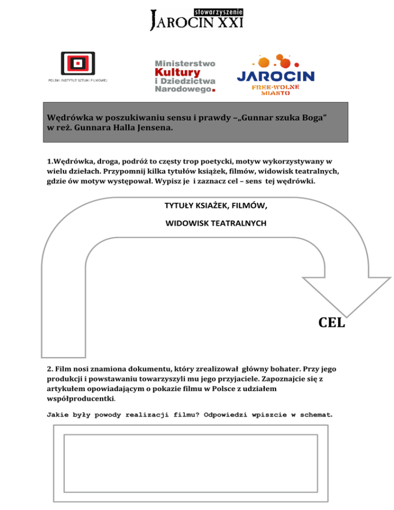 Wędrówka w poszukiwaniu sensu i prawdy –„Gunnar szuka Boga” w reż. Gunnara Halla Jensena. 1.Wędrówka, droga, podróż to częsty trop poetycki, motyw wykorzystywany w wielu dziełach. Przypomnij kilka tytułów książek, filmów, widowisk teatralnych, gdzie ów motyw występował. Wypisz je i zaznacz cel – sens tej wędrówki. TYTUŁY KSIAŻEK, FILMÓW, WIDOWISK TEATRALNYCH CEL 2. Film nosi znamiona dokumentu, który zrealizował główny bohater. Przy jego produkcji i powstawaniu towarzyszyli mu jego przyjaciele. Zapoznajcie się z artykułem opowiadającym o pokazie filmu w Polsce z udziałem współproducentki. Jakie były powody realizacji filmu? Odpowiedzi wpiszcie w schemat. "Gunnar szuka Boga". Spotkanie z współautorką filmu Dagmara Romanowska / Portalfilmowy.pl 9 grudnia 2011 18:31 Od piątku na ekranach naszych kin gości norweski autorski dokument "Gunnar szuka Boga" w reżyserii Gunnara Halla Jensena. W Krakowie, w Kinie Pod Baranami, gościła współautorka scenariusza, producentka i jedna z bohaterek opowieści: Elin Sander. Razem z o. Jackiem Prusakiem dyskutowała na temat przesłania filmu. - Dosłownie przed chwilą, przeglądając wiadomości z Norwegii, znalazłam informację o ankiecie przeprowadzonej pośród umierających ludzi. Zapytani zostali o to, czego najbardziej żałują? Wymieniali trzy rzeczy: że żyli życiem narzucanym im ich przez innych, nie własnym; że za dużo pracowali i za mało czasu spędzali z rodziną i przyjaciółmi; wreszcie, iż nie pozwalali sobie na szczęście - rozpoczęła rozmowę Elin Sander. - Sądzę, że o tym właśnie jest "Gunnar szuka Boga". Wszyscy powinniśmy to przemyśleć: życie to nie tylko praca. Szkoda, że zdajemy sobie z tego sprawę, gdy jest już za późno, u kresu. - Dlaczego tak trudno jest nam cieszyć się życiem? - zastanawiała się producentka. - Mogę mówić za siebie. Moje życie, jest, poniekąd, doskonałe. Ale… Może wszystkiego jest za dużo? Jeżeli codziennie jesz kawałek tortu, to przestajesz się tym cieszyć. Z drugiej strony tylu rzeczy nieustannie wydaje się brakować. Miałam ogromne wymagania wobec siebie, swoich dzieci, mojej kariery. Nie widziałam tego, co osiągnęłam. W pewnym momencie o Jacek Prusak i Elin Sander, fot. Dagmara Romanowska/SFP sądziłam, że moje życie to porażka - zwierzała się publiczności. - Sądzę, że zamiast porównywać się z sąsiadami, przyjaciółmi, porównujemy się z tymi, którzy osiągnęli największy sukces na świecie. A to nie jest osiągalne i tu rodzi się frustracja. (…) Zawsze jest coś lepszego, zawsze są jakieś cele i plany, że zapominasz, nie zauważasz tego, co masz, co smakujesz, widzisz, czujesz. Ludzie nie dają sobie czasu, żeby być szczęśliwymi, żeby dostrzegać drobne rzeczy konstatowała. - Z jednej strony ludzie nie potrafią być szczęśliwi, gdyż coraz częściej biorą udział w wyścigu szczurów, a z drugiej za rzadko zadajemy sobie pytanie kim jesteśmy i co tu robimy. I albo za szybko chwytamy zbyt proste odpowiedzi, kserowane przez innych, lub uważamy, że w ogóle ich nie ma, co przeradza się w zagubienie - dodawał o. Jacek Prusak, teolog, psychoterapeuta, publicysta i redaktor "Tygodnika Powszechnego". - Powinniśmy odważyć się przyznać, iż nie jesteśmy doskonali. Przed samymi sobą. To bardzo ważne. Trzeba pokazać swoje słabości, błędy - radziła po doświadczeniach, które dała jej praca nad dokumentem Sander. - Ja już nie chcę otaczać się doskonałymi ludźmi. Oni mnie nie interesują. Interesują mnie ludzie szczerzy, z wadami, porażkami, bo i to otwiera przestrzeń na moje własne przegrane. Sądzę też, że powinniśmy być lepsi dla siebie wzajemnie. Pytana o to, jak czuła się w klasztorze, do którego pojechała z resztą ekipy, czego się tam nauczyła, mówiła: - Pobyt w klasztorze, choć jako kobieta nie mogłam tam nocować, przyjeżdżałam na dzień, na noc powracając do szalonego, chaotycznego, hałaśliwego Kairu, uświadomił mi, że tak proste życie, bez niczego, na środku pustyni, jest jak najbardziej pełne, znaczące, bogate. Z tą refleksją wróciłam do domu. Może nie powinniśmy mieć tylu rzeczy, może większości powinniśmy się pozbyć? Czy łatwo jej było opowiedzieć przed kamerą o swoich najbardziej intymnych lękach i słabościach? Co popchnęło ją do pracy nad "Gunnar szuka Boga"? - Wcześniej pracowaliśmy razem nad innym dokumentem: "Gunnar goes comfortable". To jeszcze bardziej intymny obraz, w którym Gunnar przedstawił poszukiwania samego siebie w czasie podróży po Indiach. W dokumencie tym opowiadał o swoim dzieciństwie, o braku ojca. Gdy pojawił się pomysł zrealizowania "Gunnar szuka Boga", szybko zdaliśmy sobie sprawę, że bohaterów tej historii mamy tu, to my sami. Nie od razu podjęłam decyzję. Zdiagnozowano wtedy u mnie depresję. Poradziłam się psychologa, czy mogę wziąć w tym udział. Doradził, żebym to zrobiła, jeżeli tak czuję. Okazało się, że film bardzo mi pomógł. Gdy teraz go oglądam, nie widzę już tam siebie, tylko bohaterkę, kobietę w strasznym stanie. Bardzo się cieszę, że już nią nie jestem, że ten etap mam za sobą. Czy czegoś się jeszcze bałam? Sądzę, że jeżeli jest się szczerym, otwartym, ludzie nie mogą wykorzystać tego przeciwko tobie. Przecież wszystko jest na ekranie - stwierdziła. Gunnar to przykładny ojciec średniozamożnej norweskiej rodziny. Na pierwszy rzut oka ma wszystko: udane życie rodzinne, wygodny dom z dużym ogródkiem, samochód i dobrej klasy sprzęt. I choć wydaje się, że Gunnar nie ma powodów do zmartwień, to jednak daleko mu do pełni samozadowolenia. W tym wygodnym i poukładanym świecie za pieniądze można kupić wszystko, ale wszechobecny brak duchowości na dłuższą metę staje się nie do zniesienia... Gunnar decyduje się na wyjazd do pierwszego chrześcijańskiego klasztoru w Egipcie, gdzie chce o
