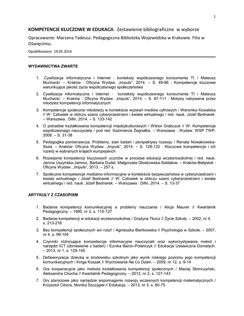1 KOMPETENCJE KLUCZOWE W EDUKACJI. Zestawienie bibliograficzne w wyborze Opracowanie: Marzena Tadeusz. Pedagogiczna Biblioteka Wojewódzka w Krakowie. Filia w Oświęcimiu. Opublikowano 19.05.2016 WYDAWNICTWA ZWARTE 1. Cywilizacja informatyczna i Internet : konteksty współczesnego konsumenta TI / Mateusz Muchacki. – Kraków : Oficyna Wydaw. „Impuls”, 2014. – S. 49-86 : Kompetencje kluczowe warunkujące jakość życia współczesnego społeczeństwa 2. Cywilizacja informatyczna i Internet : konteksty współczesnego konsumenta TI / Mateusz Muchacki. – Kraków : Oficyna Wydaw. „Impuls”, 2014. – S. 87-111 : Motywy nabywania przez młodzież kompetencji informatycznych 3. Kompetencje społeczne młodzieży w kontekście wyzwań mediów cyfrowych / Weronika Kowalska // W: Człowiek w obliczu szans cyberprzestrzeni i świata wirtualnego / red. nauk. Józef Bednarek. – Warszawa : Difin, 2014. – S. 133-142 4. O potrzebie kształtowania kompetencji międzykulturowych / Wiktor Grabczuk // W: Kompetencje współczesnego nauczyciela / pod red. Kazimierza Żegnałka. – Warszawa : Wydaw. WSP TWP, 2008. – S. 31-38 5. Pedagogika porównawcza. Problemy, stan badań i perspektywy rozwoju / Renata NowakowskaSiuta. – Kraków: Oficyna Wydaw. „Impuls”, 2014. – S. 129-132 : Kluczowe kompetencje i ich rozwój w wybranych krajach europejskich 6. Rozwijanie kompetencji kluczowych uczniów w procesie edukacji wczesnoszkolnej / red. nauk. Janina Uszyńska-Jarmoc, Barbara Dudel, Małgorzata Głoskowska-Sołdatow. – Kraków-Białystok : Oficyna Wydaw. „Impuls”, 2013. – 257 s. 7. Społeczne kompetencje medialno-informacyjne w kontekście bezpieczeństwa w cyberprzestrzeni i świata wirtualnego / Józef Bednarek // W: Człowiek w obliczu szans cyberprzestrzeni i świata wirtualnego / red. nauk. Józef Bednarek. – Warszawa : Difin, 2014. – S. 13-37 ARTYKUŁY Z CZASOPISM 1. Badania kompetencji komunikacyjnej a problemy nauczania / Alicja Maurer // Kwartalnik Pedagogiczny. – 1990, nr 2, s. 115-127 2. Badanie kompetencji w edukacji wczesnoszkolnej / Grażyna Tkocz // Życie Szkoły. – 2002, nr 4, s. 213-218 3. Bez kompetencji społecznych ani rusz! / Agnieszka Bieńkowska // Psychologia w Szkole. – 2007, nr 4, s. 99-104 4. Czynniki różnicujące kompetencje informacyjne nauczycieli oraz wykorzystywania metod i narzędzi ICT (doniesienie z badań) / Eunika Baron-Polańczyk // Edukacja Ustawiczna Dorosłych. – 2013, nr 1, s. 129-145 5. Defaworyzacja dziecka w środowisku szkolnym jako wynik niskiego poziomu jego kompetencji komunikacyjnych / Kinga Kuszak // Wychowanie Na Co Dzień. – 2009, nr 12, s. 9-14 6. Gra kooperacyjna jako metoda kształtowania kompetencji społecznych / Maciej Słomczyński, Aleksandra Chocha // Kwartalnik Pedagogiczny. – 2012, nr 2, s. 127-143 7. Gry planszowe jako narzędzie wspomaganie rozwoju wczesnych kompetencji matematycznych / Krzysztof Cibora, Monika Szczygieł // Edukacja. – 2013, nr 3, s. 60-75 2 8. Informatyczne kompetencje nauczyciela wczesnej edukacji a przygotowanie uczniów do funkcjonowania w społeczeństwie informacyjnym / Izabela Jaros // Edukacja. – 2010, nr 4, s. 113-122 9. Inteligencja emocjonalna jako kluczowa kompetencja współczesnego nauczyciela / Irena Przybylska // Chowanna. – 2006, nr 1, s. 85-95 10. Jak orientacja i wyobraźnia przestrzenna wpływają na kompetencje językowe ucznia / Anna Guzy // Język Polski w Szkole IV-VI. – 2008/2009, nr 3, s. 55-60 11. Kluczowe kompetencje ucznia a przygotowanie nauczycieli do ich realizacji / Anna Kožuh // Hejnał Oświatowy. – 2014, nr 12, s. 10-12 12. Kompetencja kulturowa jako element kompetencji zawodowych nauczyciela / Anna Guzy // Język Polski W Gimnazjum. – 2008/2009, nr 2, s. 83-91 13. Kompetencje cyfrowe dzieci / Anna Brzezińska, Joanna Matejczyk // Remedium. – 2013, nr 11, s. 6-8 14. Kompetencje dziecka na progu szkoły określone nową podstawą programową / Małgorzata Kwaśniewska // Nauczanie Początkowe. – 2010/2011, nr 2, s. 69-80 15. Kompetencje kluczowe a koncepcja edukacji przez całe życie / Bożena Alejziak // Hejnał Oświatowy. – 2014, nr 12, s. 13-15 16. Kompetencje kluczowe w codziennej pracy nauczycieli / Magdalena Jamka // Hejnał Oświatowy. – 2014, nr 12, s. 18-20 17. Kompetencje kluczowe w społeczeństwie informacyjnym i edukacji informatycznej społeczności lokalnej / Tomasz Kupidura // Edukacja Ustawiczna Dorosłych . – 2013, nr 1, s. 145-153 18. Kompetencje komunikacyjne nauczyciela współczesnej szkoły / Kazimierz Żegnałek // Wychowanie Na Co Dzień. – 2012, nr 1-2, s. 41-45 19. Kompetencje społeczne dzieci / Jadwiga Lubowiecka // Wychowanie W Przedszkolu. – 2012, nr 4, s. 5-9 20. Kompetencje ucznia i nauczyciela / Maria Kielar-Turska // Psychologia W Szkole. – 2010, nr 2, s. 5-13 21. Kształtowanie kompetencji językowych uczniów klas młodszych. Propozycja zintegrowanego modułu „Wychowanie zdrowotne” / Grażyna Rura // Polonistyka. – 2007, nr 9, s. 38-43 22. Kształtowanie kompetencji personalnych i społecznych w szkole zawodowej drogą do sukcesu na rynku pracy / Małgorzata Bartosiak // Edukacja Ustawiczna Dorosłych. – 2014, nr 4, s. 125-138 23. Kształtowanie kompetencji społecznych dzieci / Elżbieta Kwiatkowska // Edukacja Ustawiczna Dorosłych. – 2011, nr 2, s. 53-59 24. Livelong learning w dążeniu do osiągnięcia kompetencji kluczowych na zajęciach polonisty / Joanna Piasta-Siechowicz // Język Polski W Szkole IV-VI. – 2009/2010, nr 3, s. 73-93 25. O rozwijaniu kompetencji społecznych / Bożena Targowska // Problemy OpiekuńczoWychowawcze. – 2007, nr 4, s. 35-37 26. Pojęcie kompetencji w Podstawie programowej / Natalia Cieślar, Joanna Samsel-Opalla // Nauczyciel I Szkoła. – 2010, nr 1-2, s. 77-82 27. Program „Kształtowanie kompetencji komunikacyjnych opartych na rozwoju sensomotorycznym” / Klaudia Piotrowska-Madej, Agnieszka Zychowicz // Szkoła Specjalna.