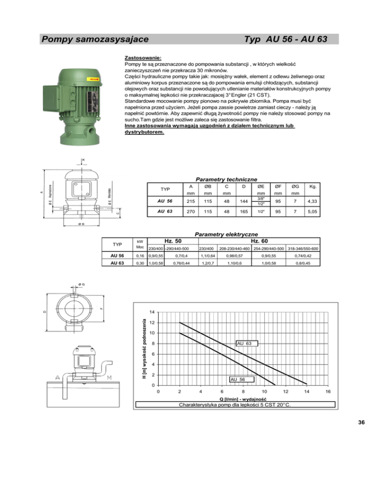 Pompy samozasysajace Typ AU 56 - AU 63 Zastosowanie: Pompy te są przeznaczone do pompowania substancji , w których wielkość zanieczyszczeń nie przekracza 30 mikronów. Części hydrauliczne pompy takie jak: mosięŜny wałek, element z odlewu Ŝeliwnego oraz aluminiowy korpus przeznaczone są do pompowania emulsji chłodzących, substancji olejowych oraz substancji nie powodujących utlenianie materiałów konstrukcyjnych pompy o maksymalnej lepkości nie przekraczajacej 3° Engler (21 CST). Standardowe mocowanie pompy pionowo na pokrywie zbiornika. Pompa musi być napełniona przed uŜyciem. JeŜeli pompa zassie powietrze zamiast cieczy - naleŜy ją napełnić powtórnie. Aby zapewnić długą Ŝywotność pompy nie naleŜy stosować pompy na sucho.Tam gdzie jest moŜliwe zaleca się zastosowanie filtra. Inne zastosowania wymagają uzgodnień z działem technicznym lub dystrybutorem. Parametry techniczne A ØB C mm mm mm AU 56 215 115 48 AU 63 270 115 48 TYP Hz. 50 D ØE ØF ØG mm mm mm Kg. 144 3/8" 1/2" 95 7 4,33 165 1/2" 95 7 5,05 Parametry elektryczne Hz. 60 TYP kW Moc 230/400 254-290/440-500 AU 56 0,16 0,9/0,55 0,7/0,4 1,1/0,64 0,98/0,57 0,9/0,55 0,74/0,42 AU 63 0,30 1,0/0,58 0,76/0,44 1,2/0,7 1,10/0,6 1,0/0,58 0,8/0,45 230/400 208-230/440-460 254-290/440-500 318-346/550-600 H [m] wysokość podnoszenia 14 12 10 8 AU 63 6 4 2 AU 56 0 0 2 4 6 8 10 12 14 16 Q [l/min] - wydajność Charakterystyka pomp dla lepkości 5 CST 20° C. 36 AU 56 - 63 AU 56 1 2 4 5 8 9 10 12 14 15 16 17 18 19 20 21 22 23 24 30 35 36 37 38 41 AU 63 Elementy Wykonanie Śruba Obudowa silnika Rotor - wirnik silnika Stator - pakiet nawinięty Wałek Komora Pokrywa wirnika Wirnik Puszka elektryczna Kostka zaciskowa Osłona silnika Wentylator Pokrywa wentylatora ŁoŜysko Pierścień spręŜynowy Podkłądka spręŜynująca ŁoŜysko Pierścień spręŜynowy Osłona łoŜyska Uszczelka Tulejka Pierścień spręŜynowy Dyfuzer Klin Oring - uszczelka Stal Aluminium Stal C 40 Aluminium Odlew Ŝeliwny G20 Mosiądz 58* Nylon mm. 40x25 6P Aluminium Nylon Nylon 6201 ZZ ø 12 ø 32 6201 ZZ ø 12 Aluminium ø8 ø8 Odlew Ŝeliwny G20 3x5x13 2,62 x 71,12 Elementy Wykonanie 1 2 4 5 8 9 10 12 14 15 16 17 18 19 20 21 22 Śruba Obudowa silnika Rotor - wirnik silnika Stator - pakiet nawinięty Wałek Komora Pokrywa wirnika Wirnik Puszka elektryczna Kostka zaciskowa Osłona silnika Wentylator Pokrywa wentylatora ŁoŜysko Pierścień spręŜynowy Podkładka spręŜynująca ŁoŜysko Stal Aluminium 24 30 35 36 37 38 41 Osłona łoŜyska Uszczelka Tulejka Pierścień spręŜynowy Dyfuzer Klin OR pierścień Stal C 40 Aluminium Odlew Ŝeliwny G 20 Mosiądz 58* Nylon mm. 40x25 6P Aluminium Nylon Nylon 6202 ZZ ø 17 ø 35 6003 ZZ Aluminium ø8 ø8 Odlew Ŝeliwny G20 3x5x13 2,62 x 71,12 37