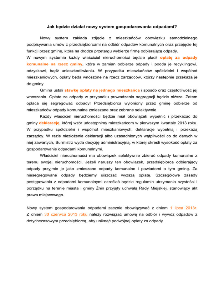 Jak będzie działał nowy system gospodarowania odpadami? Nowy system zakłada zdjęcie z mieszkańców obowiązku samodzielnego podpisywania umów z przedsiębiorcami na odbiór odpadów komunalnych oraz przejęcie tej funkcji przez gminę, która na drodze przetargu wybierze firmę odbierającą odpady. W nowym systemie każdy właściciel nieruchomości będzie płacił opłatę za odpady komunalne na rzecz gminy, która w zamian odbierze odpady i podda je recyklingowi, odzyskowi, bądź unieszkodliwianiu. W przypadku mieszkańców spółdzielni i wspólnot mieszkaniowych, opłaty będą wnoszone na rzecz zarządców, którzy następnie przekażą je do gminy. Gmina ustali stawkę opłaty na jednego mieszkańca i sposób oraz częstotliwość jej wnoszenia. Opłata za odpady w przypadku prowadzenia segregacji będzie niższa. Zatem opłaca się segregować odpady! Przedsiębiorca wyłoniony przez gminę odbierze od mieszkańców odpady komunalne zmieszane oraz zebrane selektywnie. Każdy właściciel nieruchomości będzie miał obowiązek wypełnić i przekazać do gminy deklarację, której wzór udostępnimy mieszkańcom w pierwszym kwartale 2013 roku. W przypadku spółdzielni i wspólnot mieszkaniowych, deklaracje wypełnią i przekażą zarządcy. W razie niezłożenia deklaracji albo uzasadnionych wątpliwości co do danych w niej zawartych, Burmistrz wyda decyzję administracyjną, w której określi wysokość opłaty za gospodarowanie odpadami komunalnymi. Właściciel nieruchomości ma obowiązek selektywnie zbierać odpady komunalne z terenu swojej nieruchomości. Jeżeli naruszy ten obowiązek, przedsiębiorca odbierający odpady przyjmie je jako zmieszane odpady komunalne i powiadomi o tym gminę. Za niesegregowane odpady będziemy uiszczać wyższą opłatę. Szczegółowe zasady postępowania z odpadami komunalnymi określać będzie regulamin utrzymania czystości i porządku na terenie miasta i gminy Żnin przyjęty uchwałą Rady Miejskiej, stanowiący akt prawa miejscowego. Nowy system gospodarowania odpadami zacznie obowiązywać z dniem 1 lipca 2013r. Z dniem 30 czerwca 2013 roku należy rozwiązać umowę na odbiór i wywóz odpadów z dotychczasowym przedsiębiorcą, aby uniknąć podwójnej opłaty za odpady.